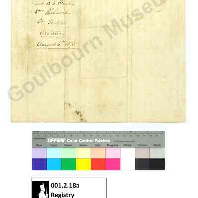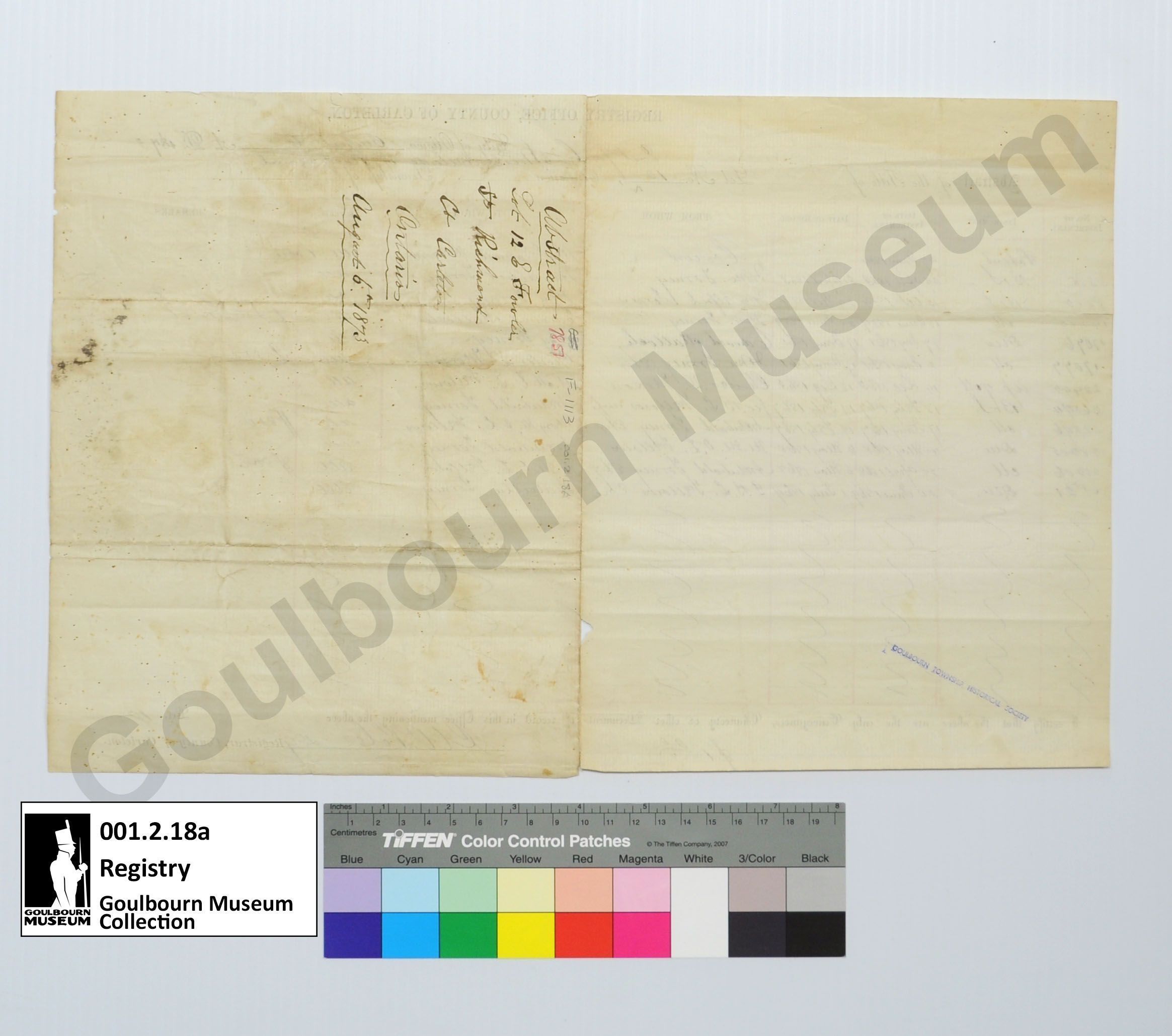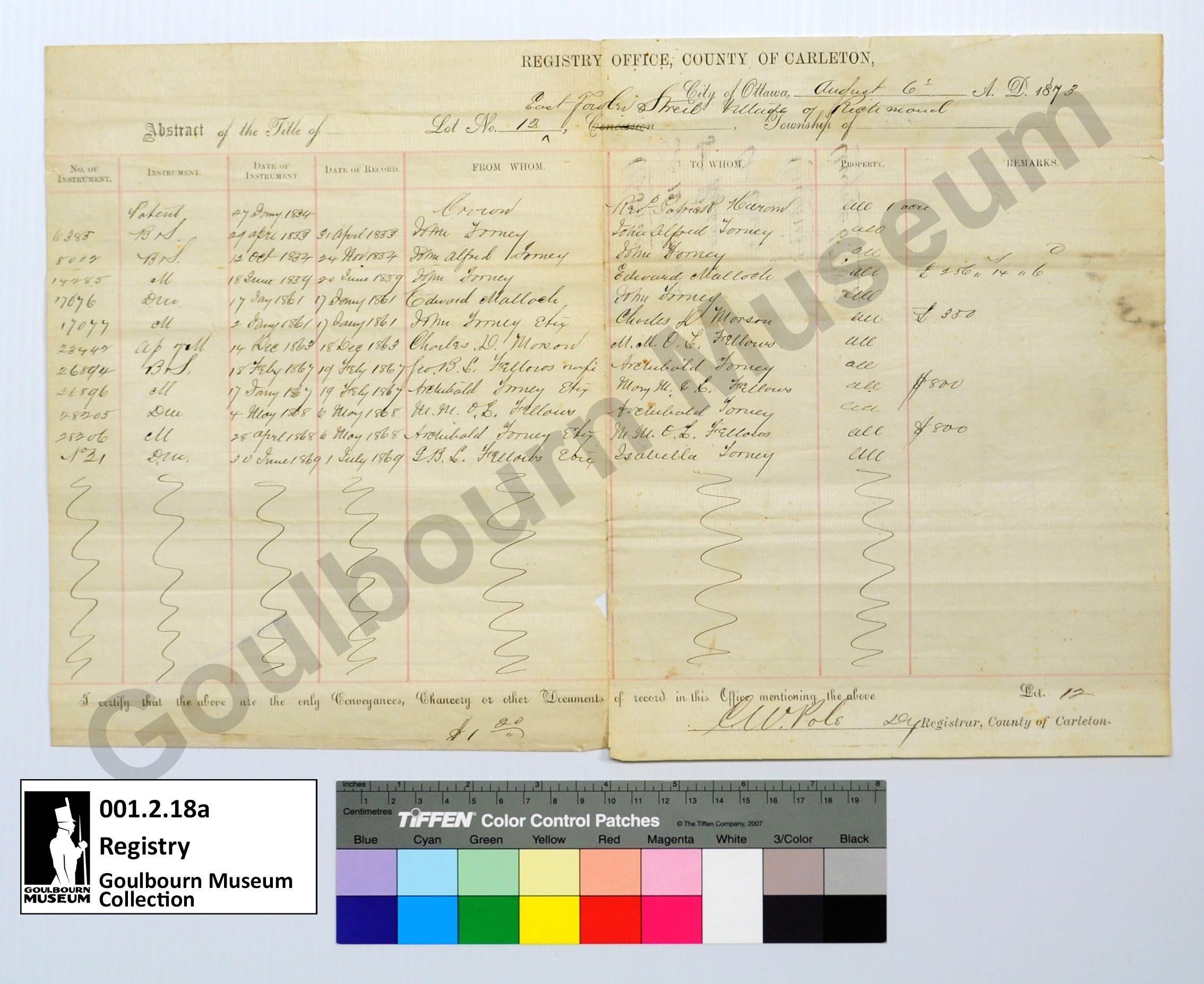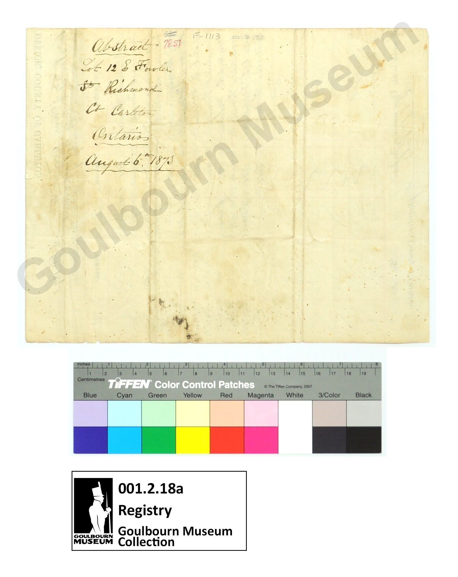The object 001.2.18a is an abstract related to Lot 12 E Fowler Street, Village of Richmond in the County of Carleton in the District of Dalhousie, Esquire.Collection