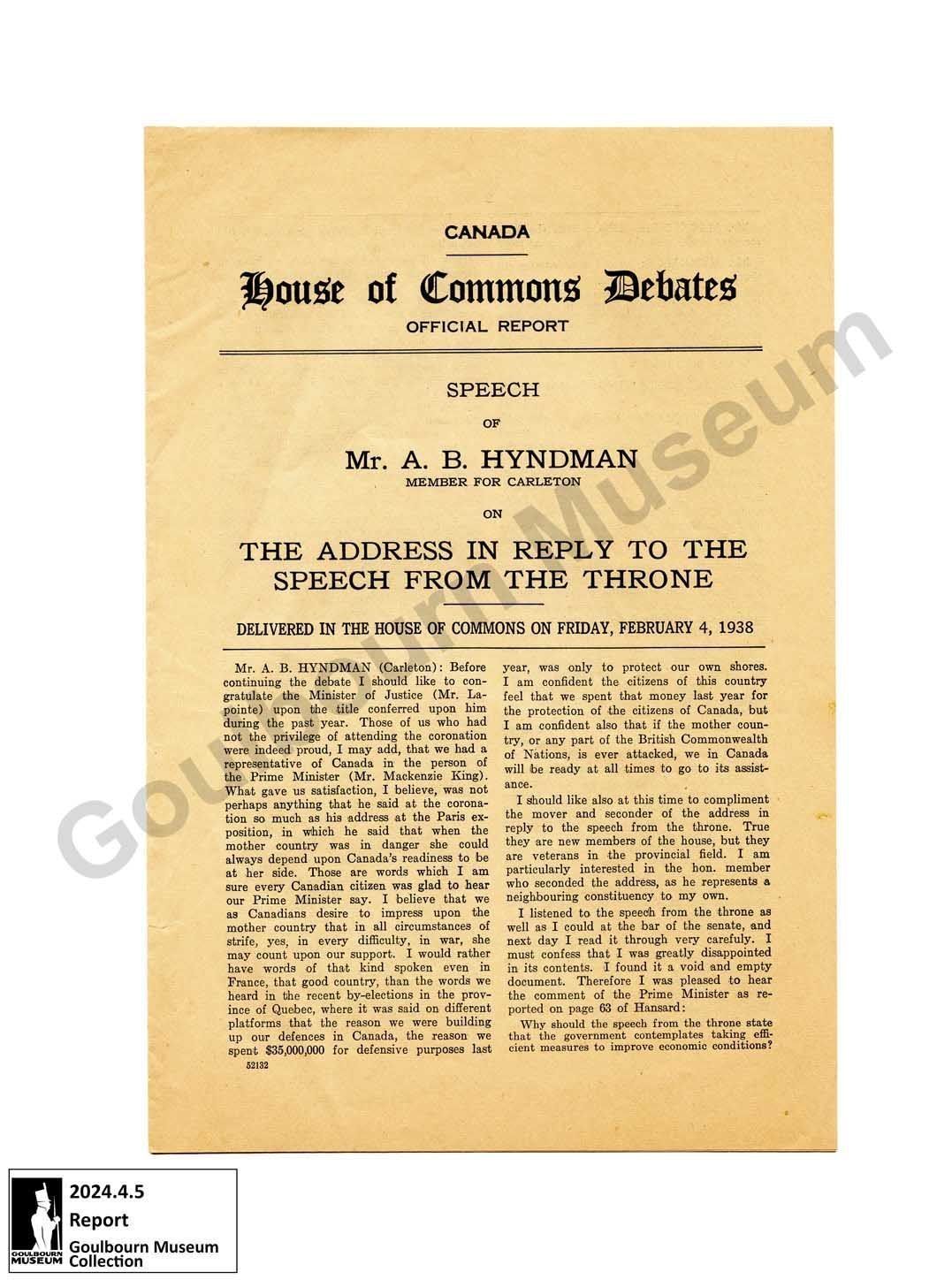 Paper booklet titled, "Canada House of Commons Debates Official Report. Speech of Mr. A.B. Hyndman Member for Carleton on The Address in Reply to the Speech from the Throne. Delivered in the House of Commons on Friday, February 4, 1938." There are six pages of typed text.Context