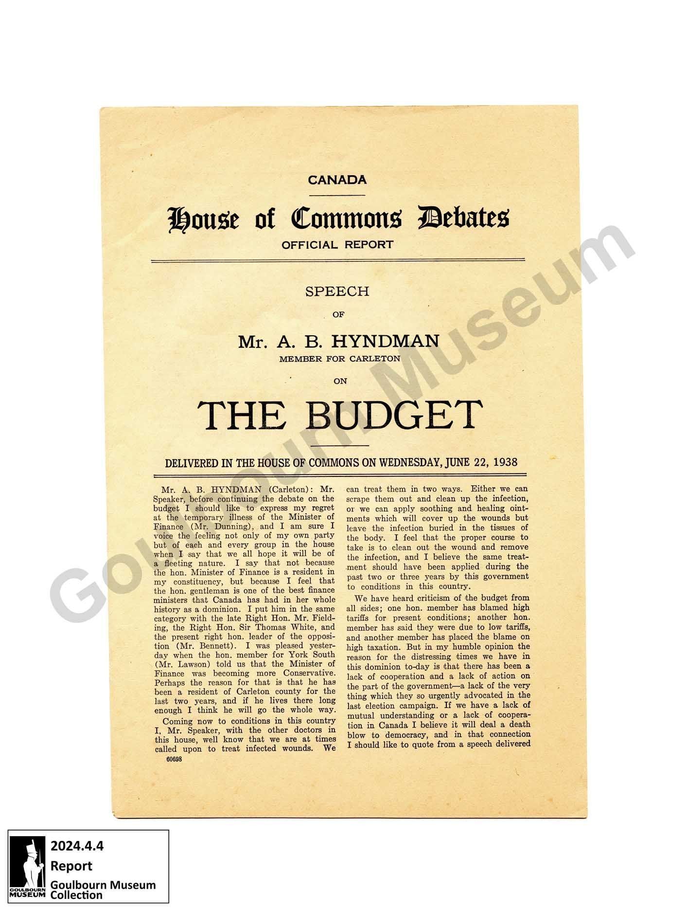 Paper booklet titled, "Canada House of Commons Debates Official Report. Speech of Mr. A.B. Hyndman Member for Carleton on The Budget. Delivered in the House of Commons on Wednesday, June 22, 1938." There are five pages of typed text.Context