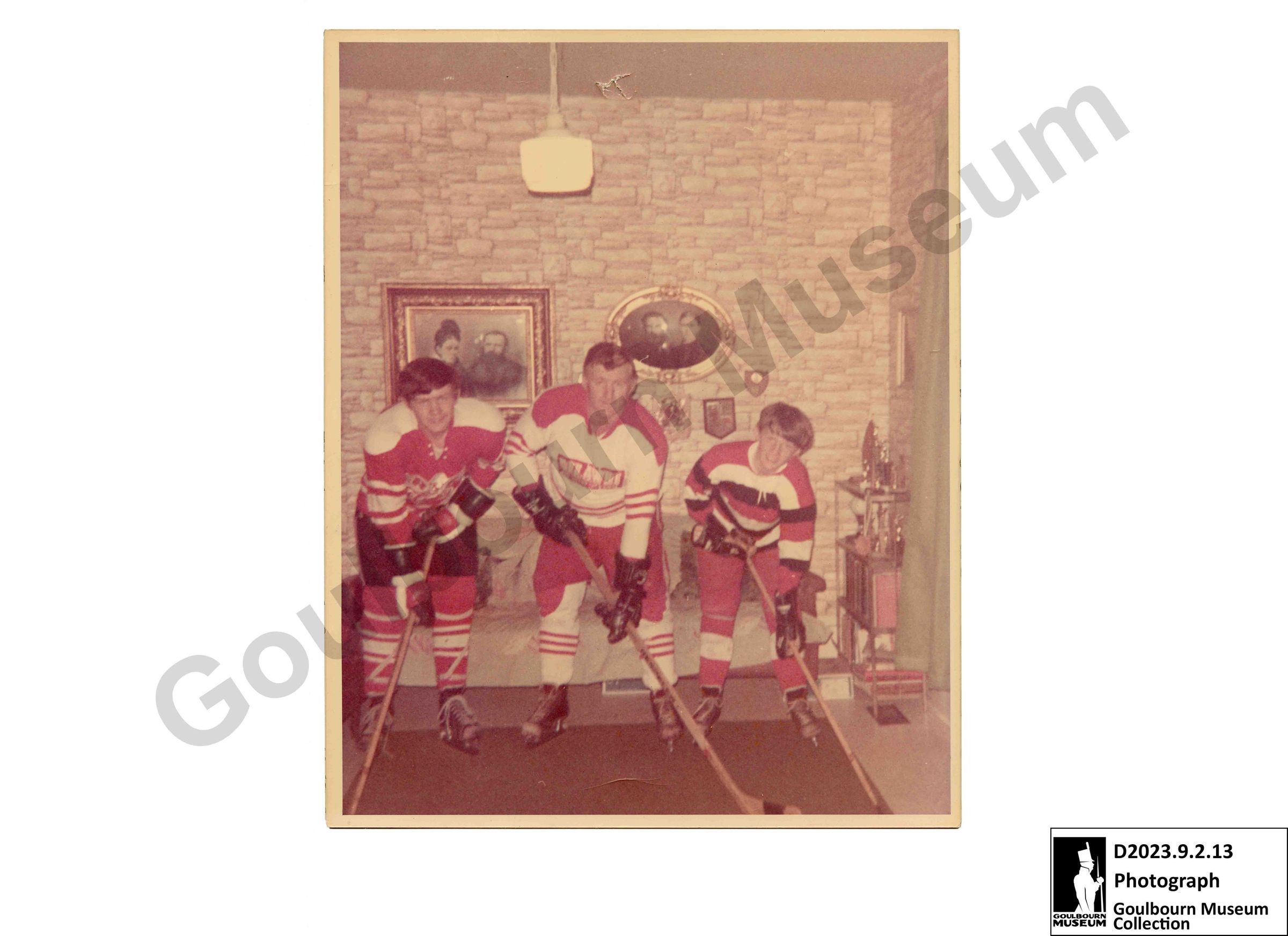 The image shows three hockey players in full uniform, posing indoors with their hockey sticks as if ready to play.Photograph Details