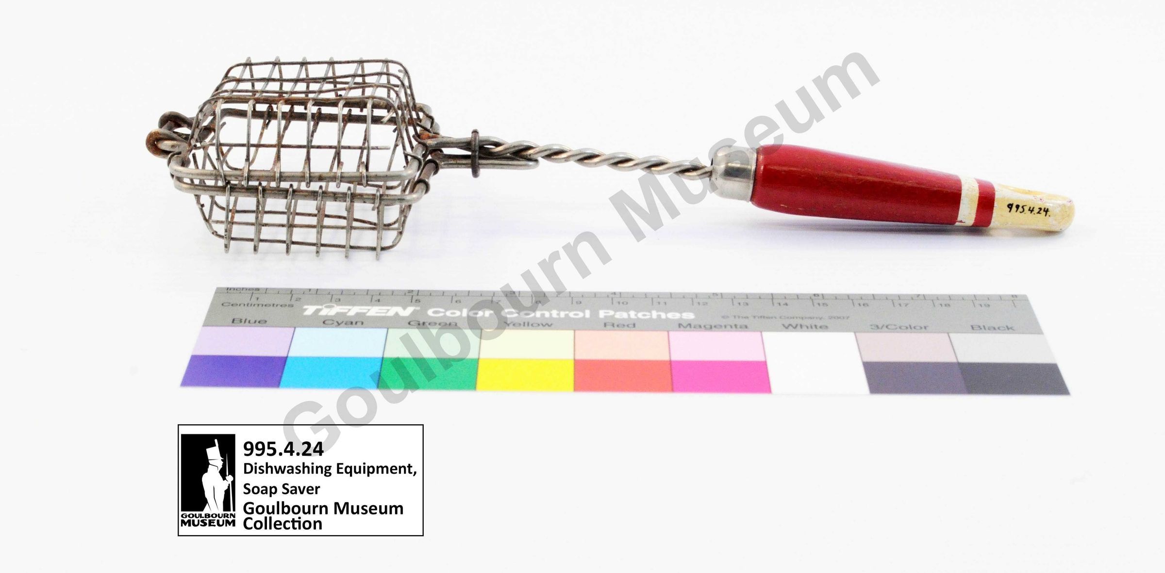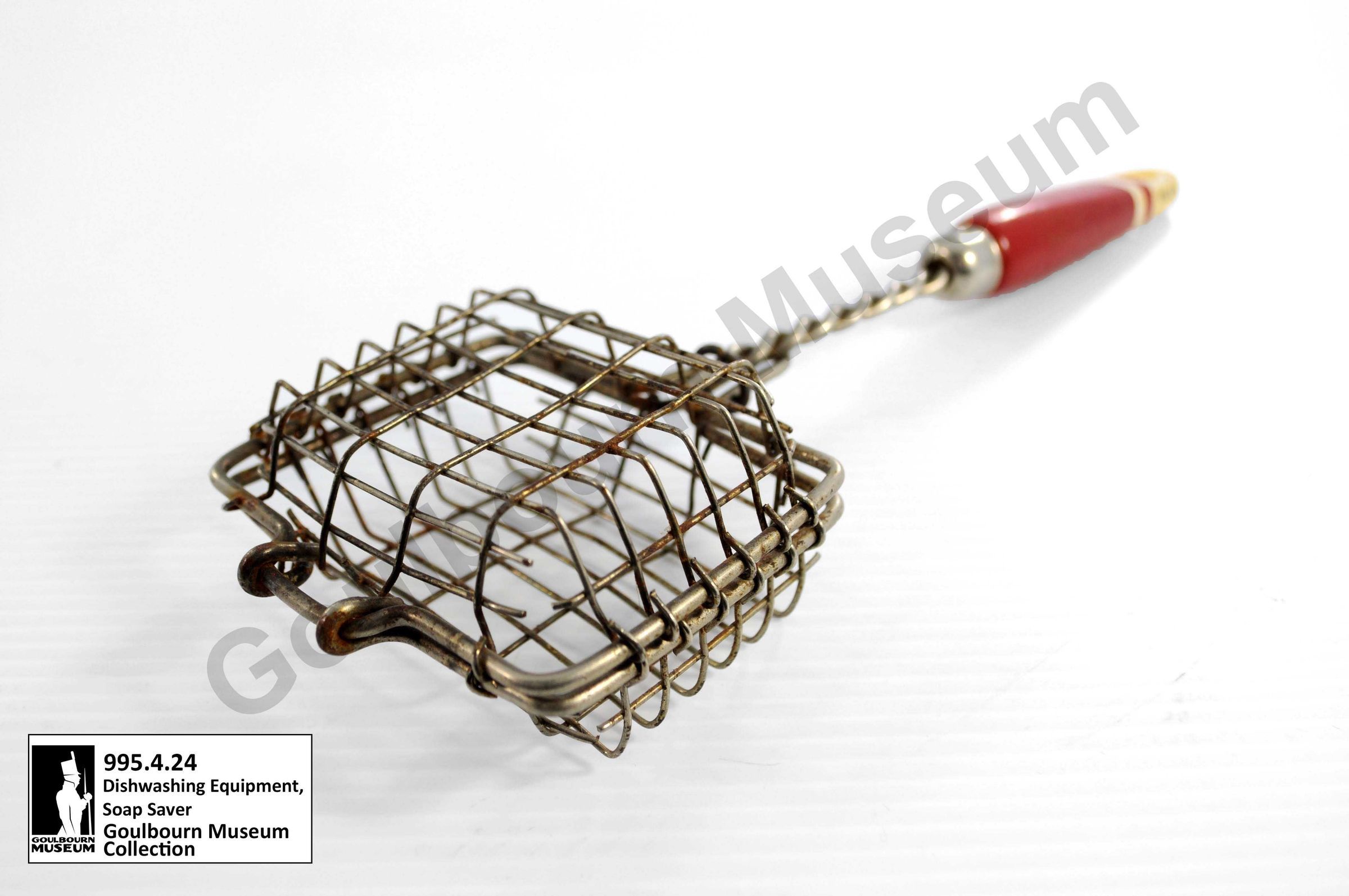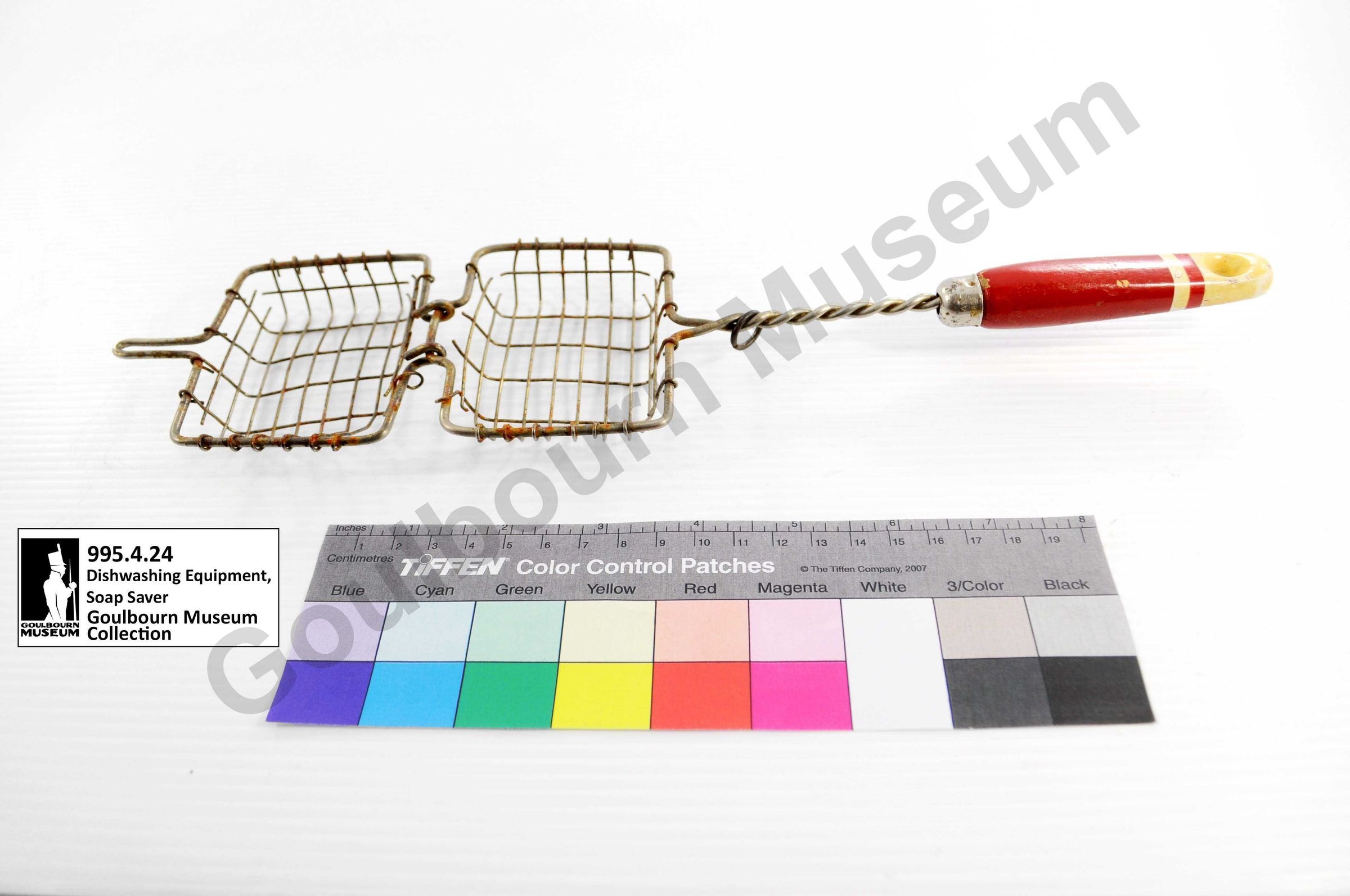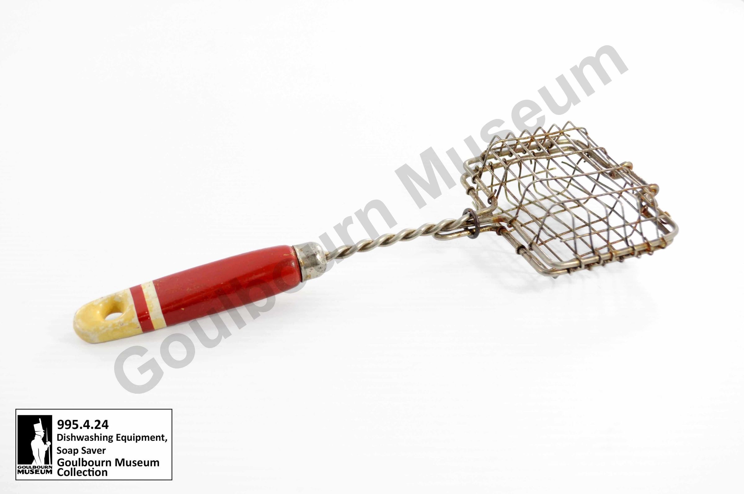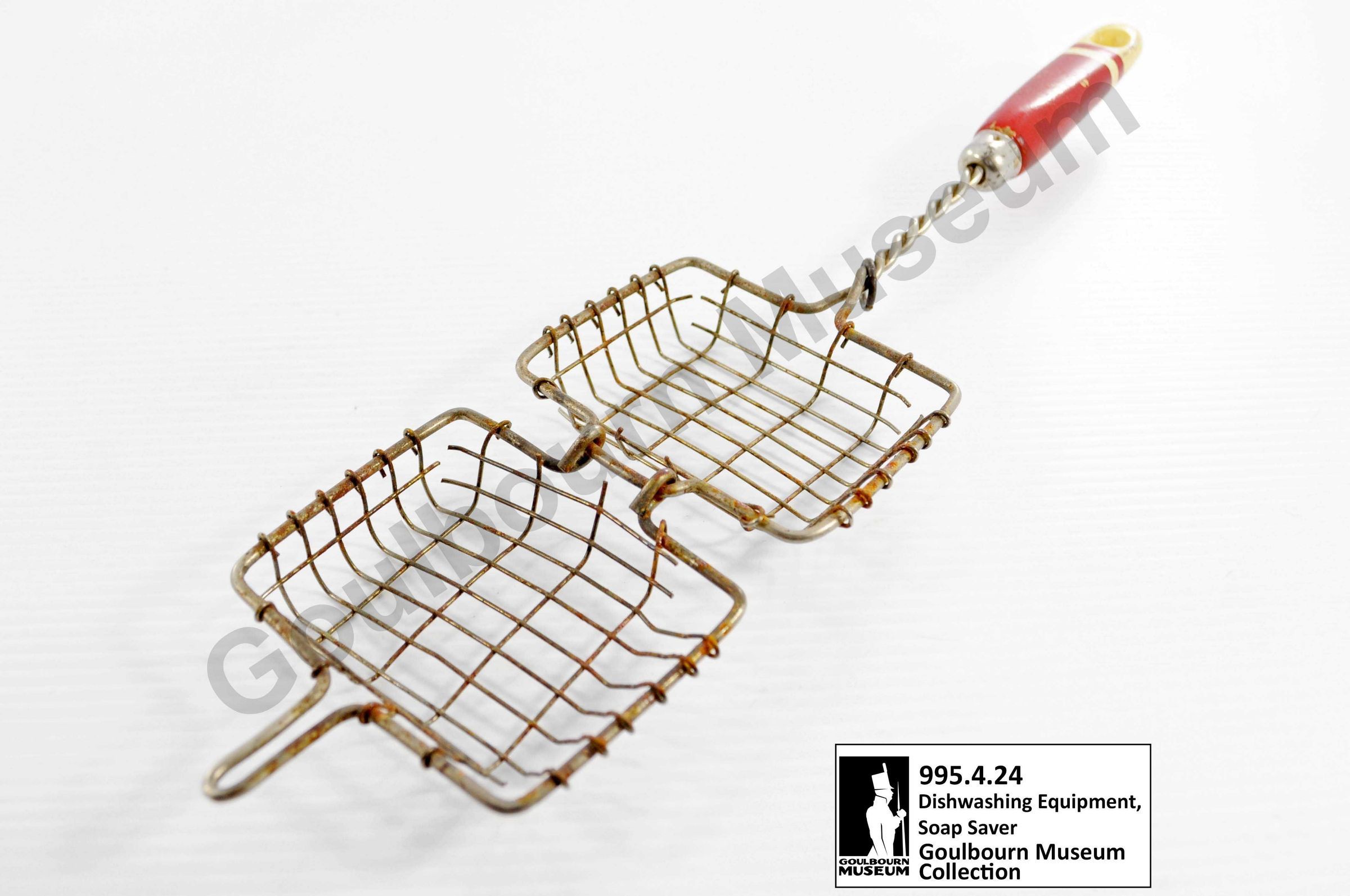 Hinged wire basket with a wooden handle. Basket is made of a grey metal with two twisted wires made into a handle. Basket locks shut with a sliding ring of metal located on the twisting wires. Pressed metal ferule with chrome at the point of attachment between the wires and handle. Handle is made of wood and painted red towards the front two thirds and white near the base. There is a small ring of white paint near the bottom extension of the red portion of the handle. White paint is mostly delaminated at the bottom of the handle to expose a tan colored layer. There is a small hole in the center of the handle near the base.