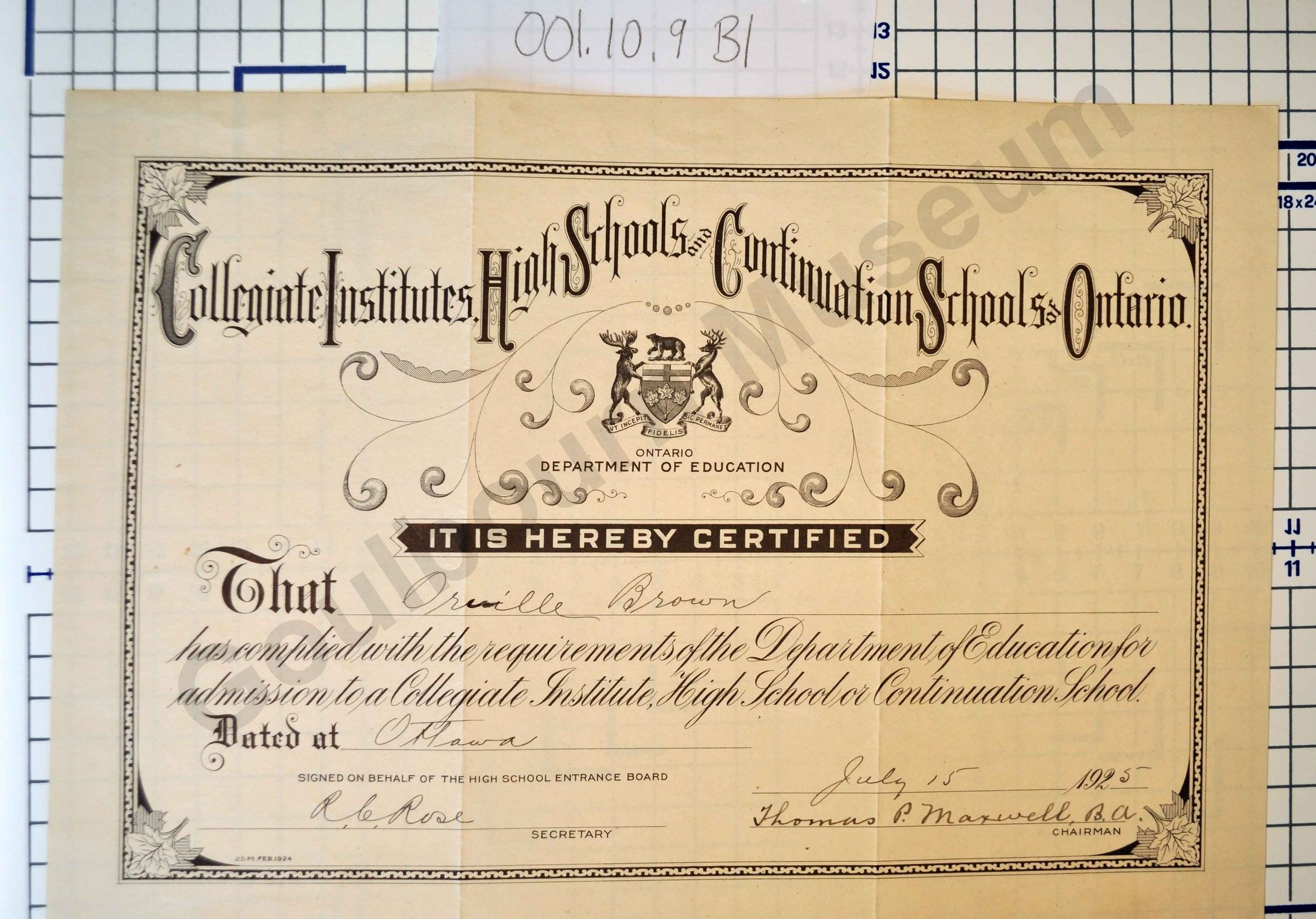 School certificate made from beige paper. The title, "Collegiate Institutes, High Schools and Continuation Schools of Ontario," is written at the top of the certificate in cursive script. The Ontario Coat of Arms appears below, followed by text that reads: "Ontario Department of Education, It is hereby certified that Orville Brown has complied with the requirements of the Department of Education for admission to a Collegiate Institute, High School or Continuation School. Dated at Ottawa. Signed on behalf of the High School Entrance Board, July 15, 1925." The certificate is signed, in black ink, by the chairman, Thomas P. Maxwell, B.A.Collection
