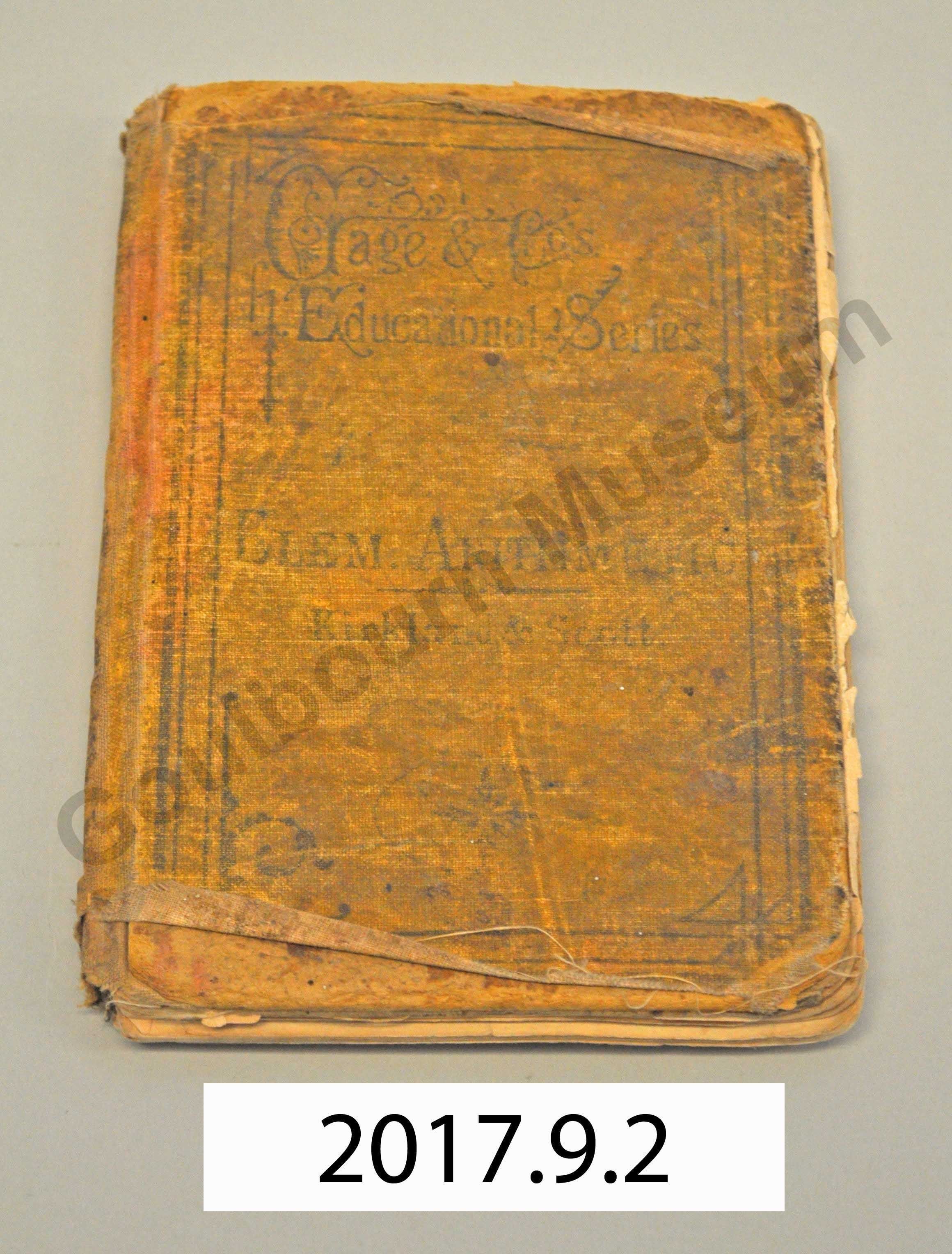 The book is dark brown in colour and is rectangular in shape. The front cover has faded considerably. The front cover reads "Gage & Co's Educational Series Lem. Arithmetic, Kirckland & Scott." and then directly below the last words there is a faint symbol in black ink that has the likeness of a maps legend. Within the first age of the book the name Harold Spearman has been written in dark ink, and on the following page, his signature, which looks like H Spearman, along with the date 4/19/09. Based on family knowledge and ancestry this places the book around 1809. The back cover of the book is unadorned and only has very faint writing or ink in the center.Context