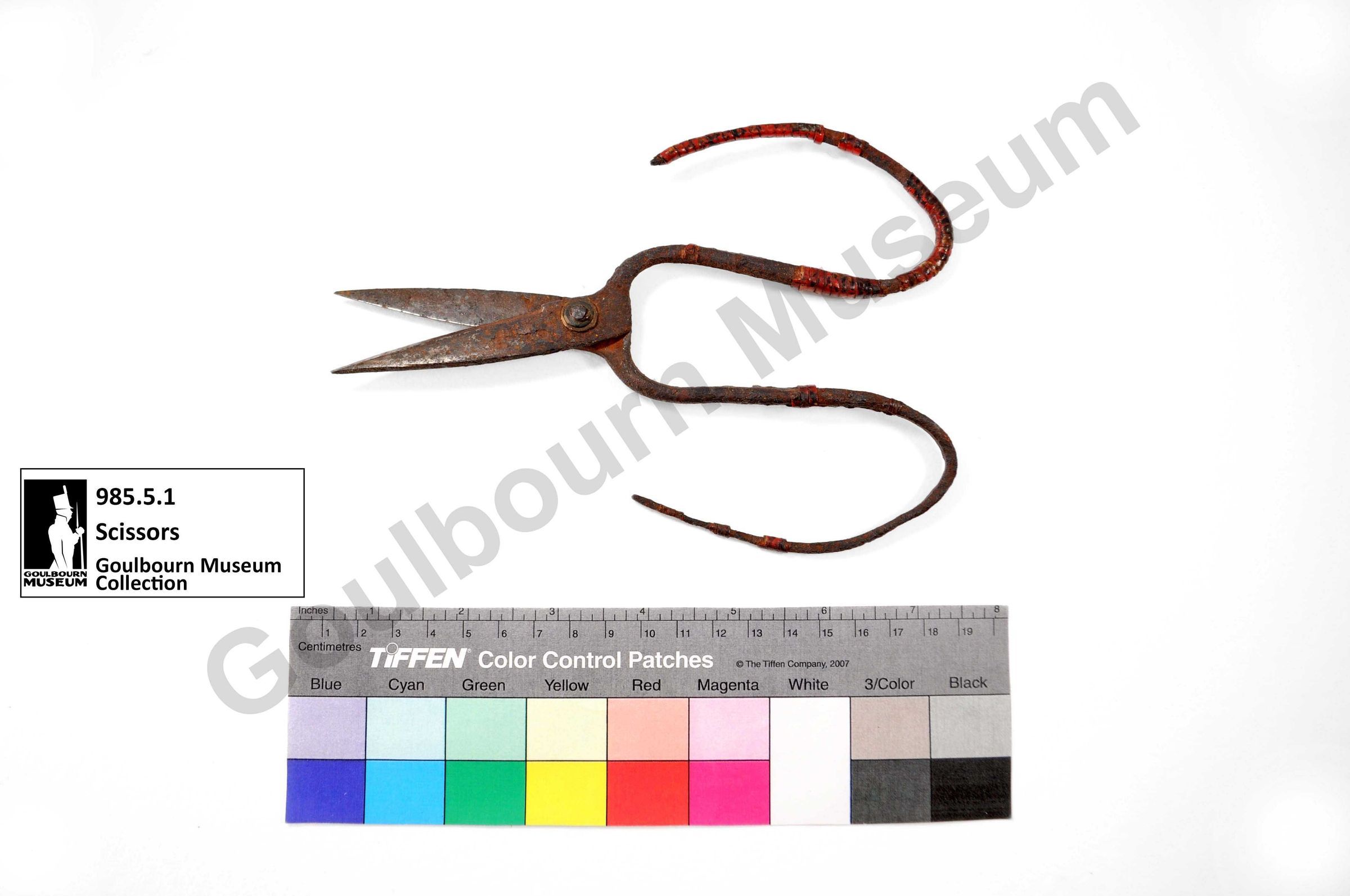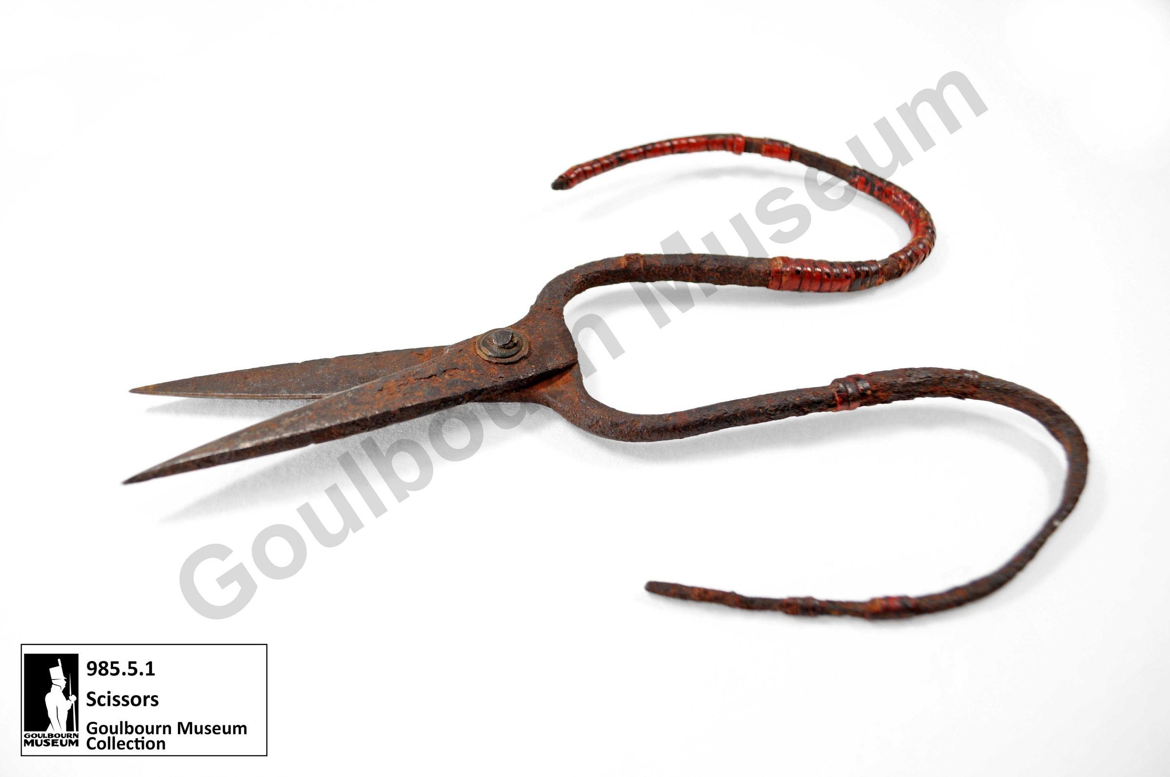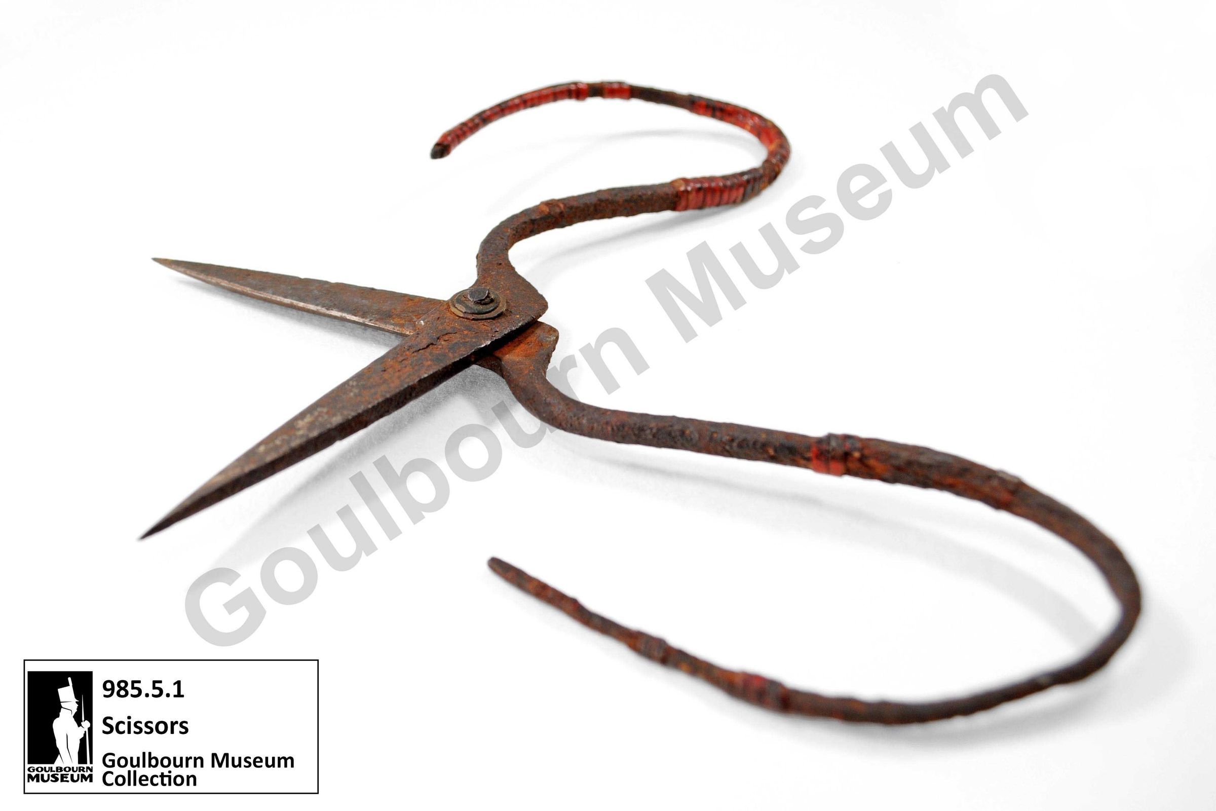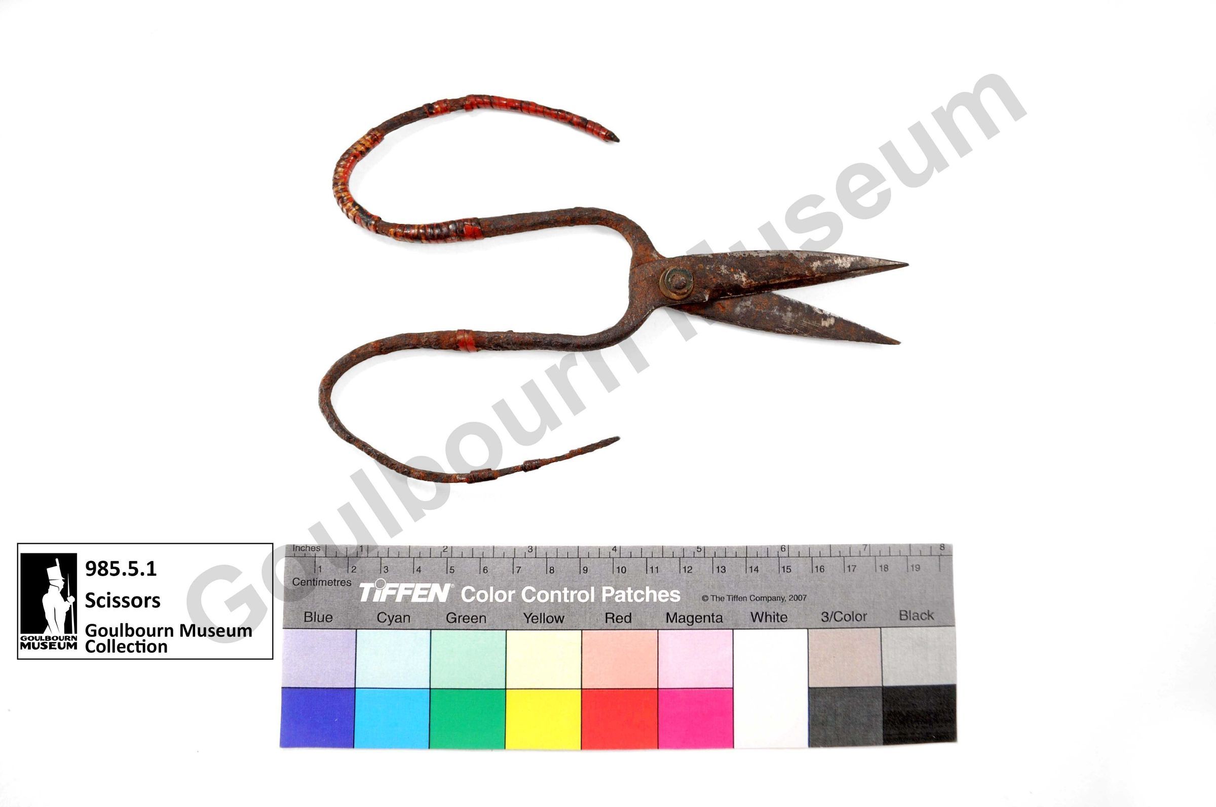 One pair of metal scissors with hooked metal handles. Thought to be hand forged and presumed to be from Goulbourn Township's colonization period. These scissors were used on 8 July 1990 to cut the ribbon at the Grand Opening of Goulbourn Museum.Collection