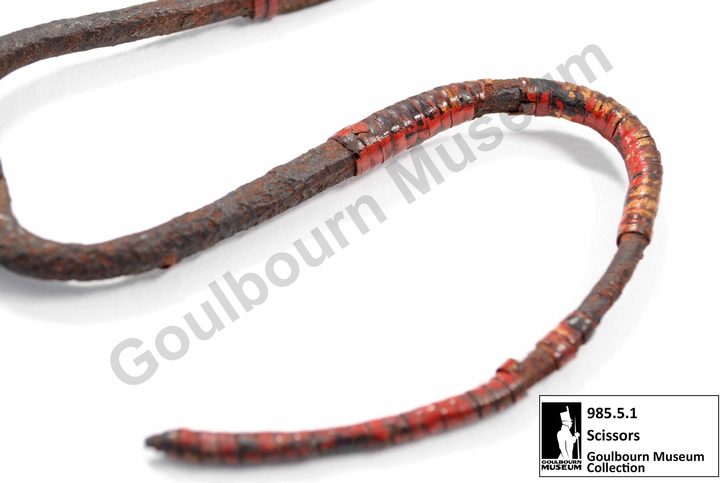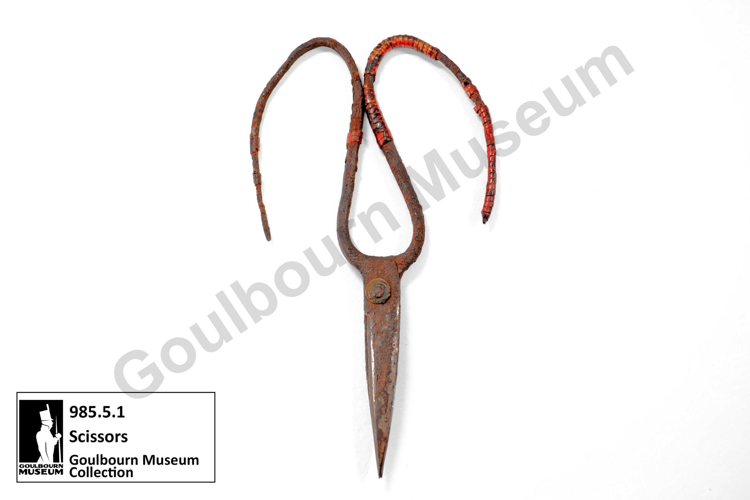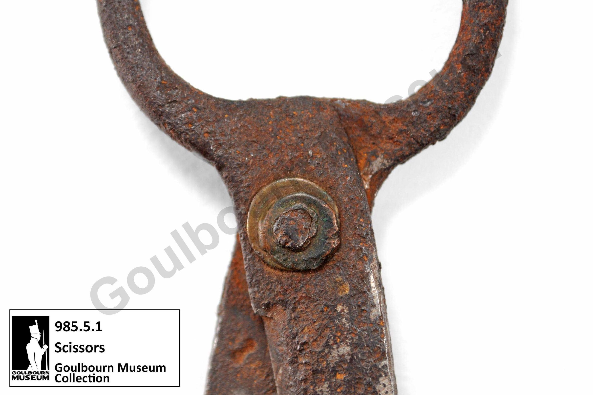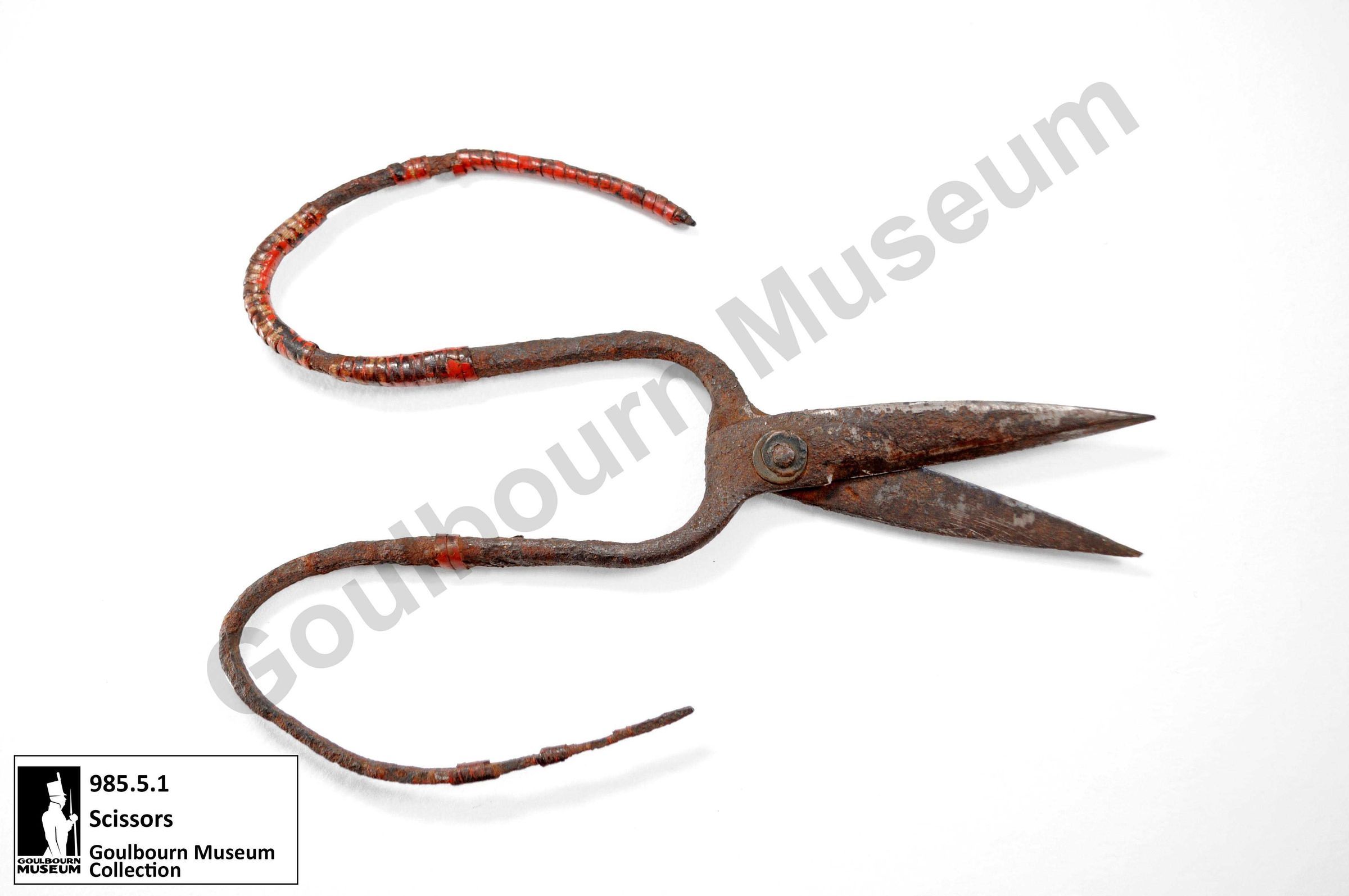 One pair of metal scissors with hooked metal handles. Thought to be hand forged and presumed to be from Goulbourn Township's colonization period. These scissors were used on 8 July 1990 to cut the ribbon at the Grand Opening of Goulbourn Museum.Collection