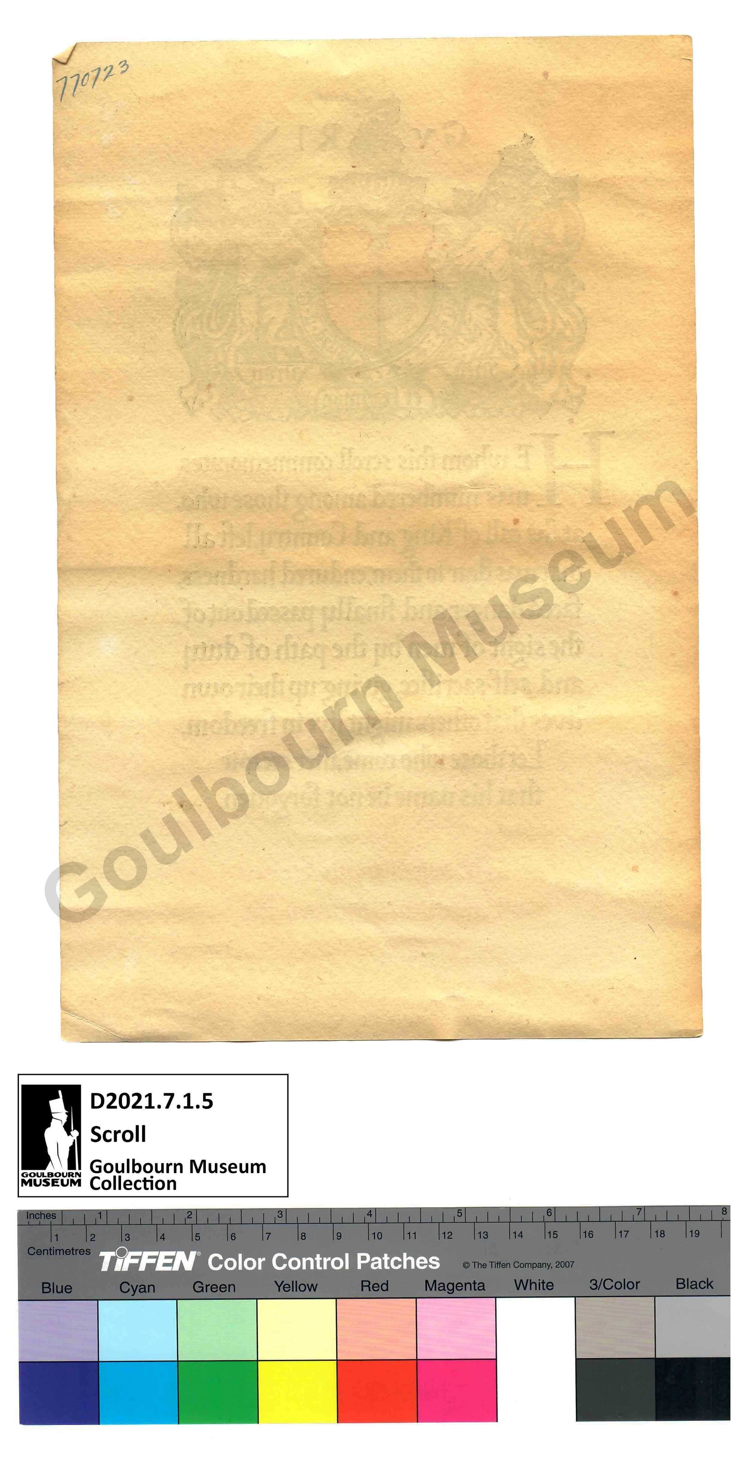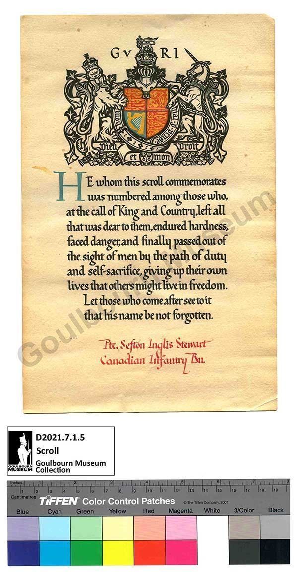 Digital Artifact: Next of Kin Memorial Scroll. Pte. Sefton Inglis Stewart Canadian Infantry Bn. About the scroll: The scroll has a commemorative message underneath the Royal Crest, with the rank, name and regiment of the fallen soldier handwritten in calligraphic script. It was printed on high quality paper, size 11 x 7 inches (27cm x 17cm) and was intended to be a treasured record of the sacrifice.Context