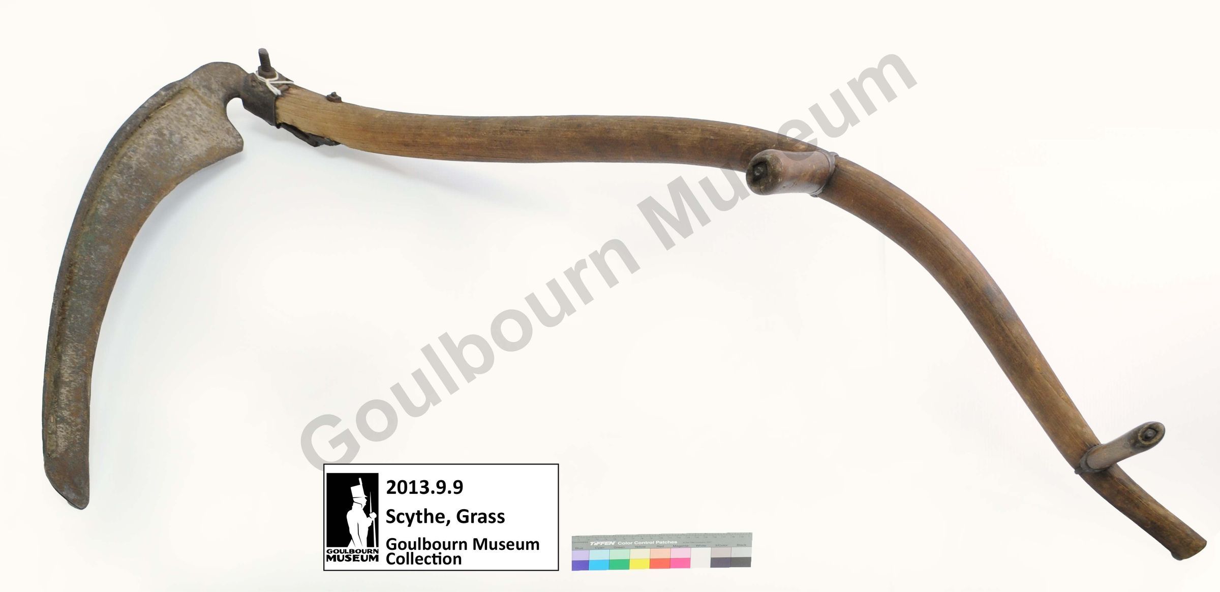 A large scythe that is composed of a long wooden handle that is brown in colour and a metal blade that is a dark grey to black. The main wooden body is cylindrical in shape and elongated with several curves. It has two wooden handles, or grips, that are attached to the main body and located approximately at the adjacent end (away from the blade) of the body and in the middle situated horizontally from where it is attached. The metal blade is attached to the top of the wooden bodied handle with a metal screw and bolt.
