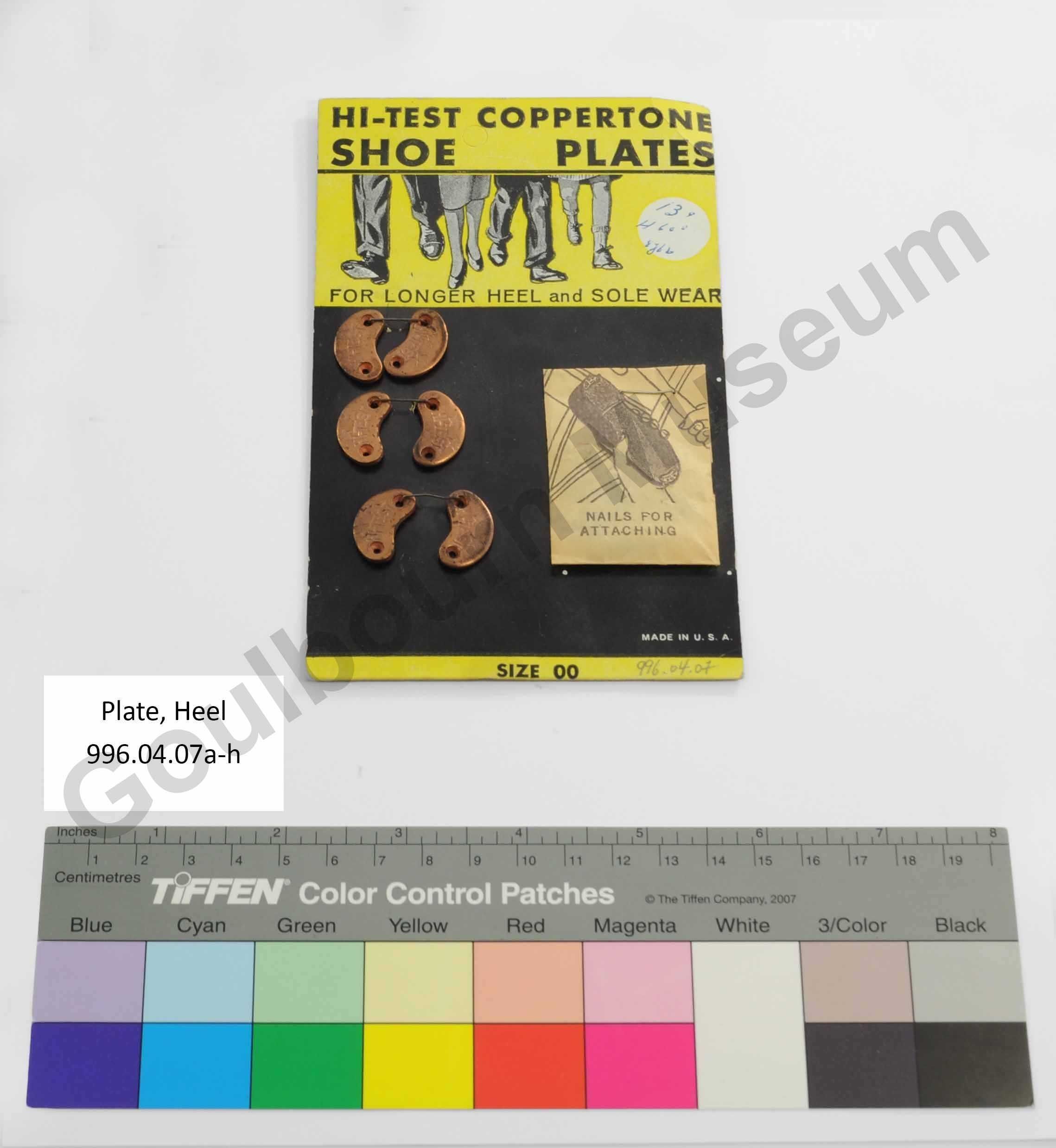 Look at the price written of this set of heel plates - only 13 cents. Shoe plates were important purchases for people who wore leather soled shoes, as they helped increase the life of their leather soles. Plates were used to protect the heels and toes on a shoe from wearing out and scuffing over time. Without shoe plates people who walked often, worked in harsh conditions or travelled in rough terrain would wear their leather sole down quickly. The worn shoes would then need to have their sole replaced by a cobbler. Shoe plates were a worthwhile investment.Lexicon