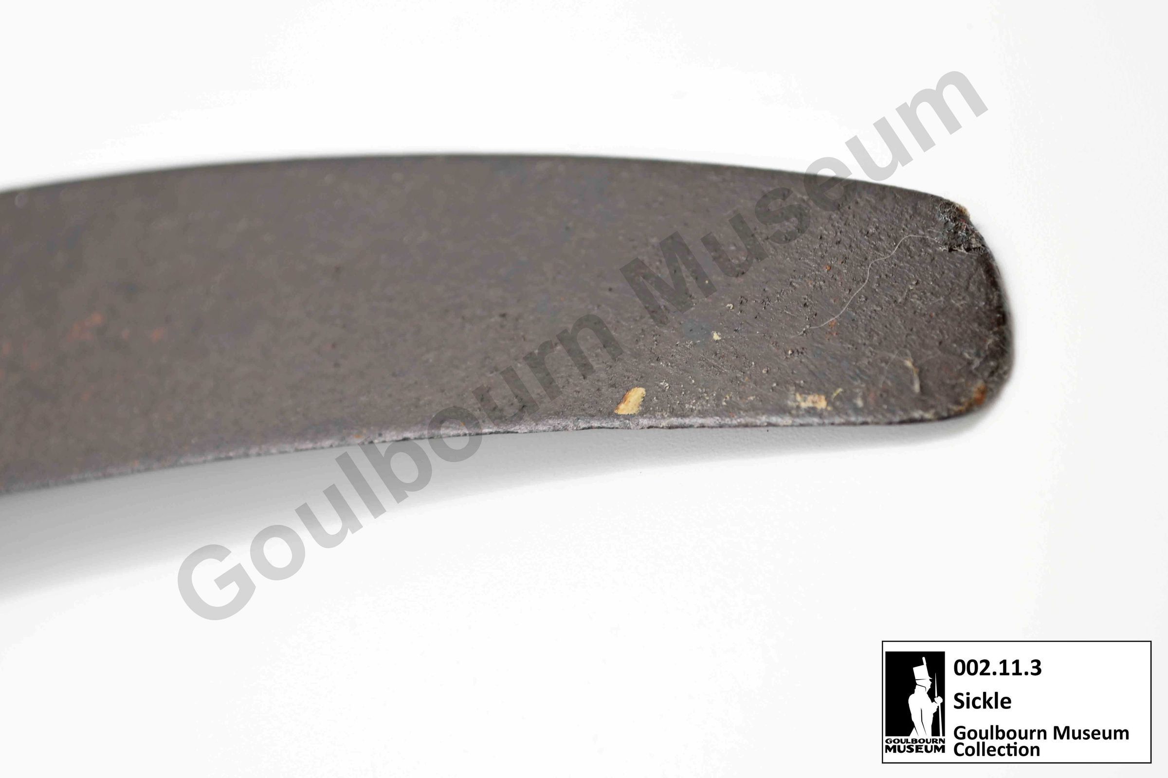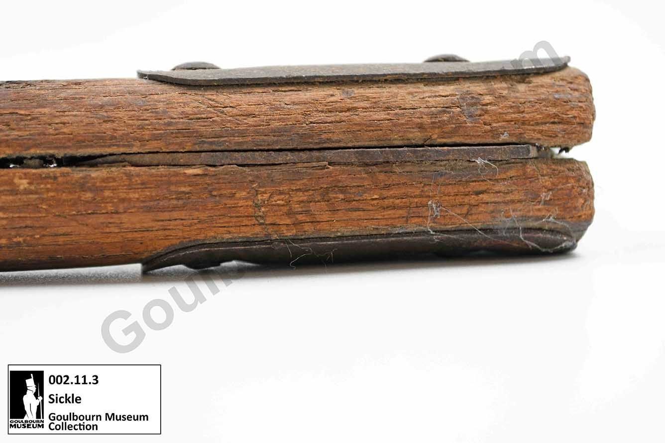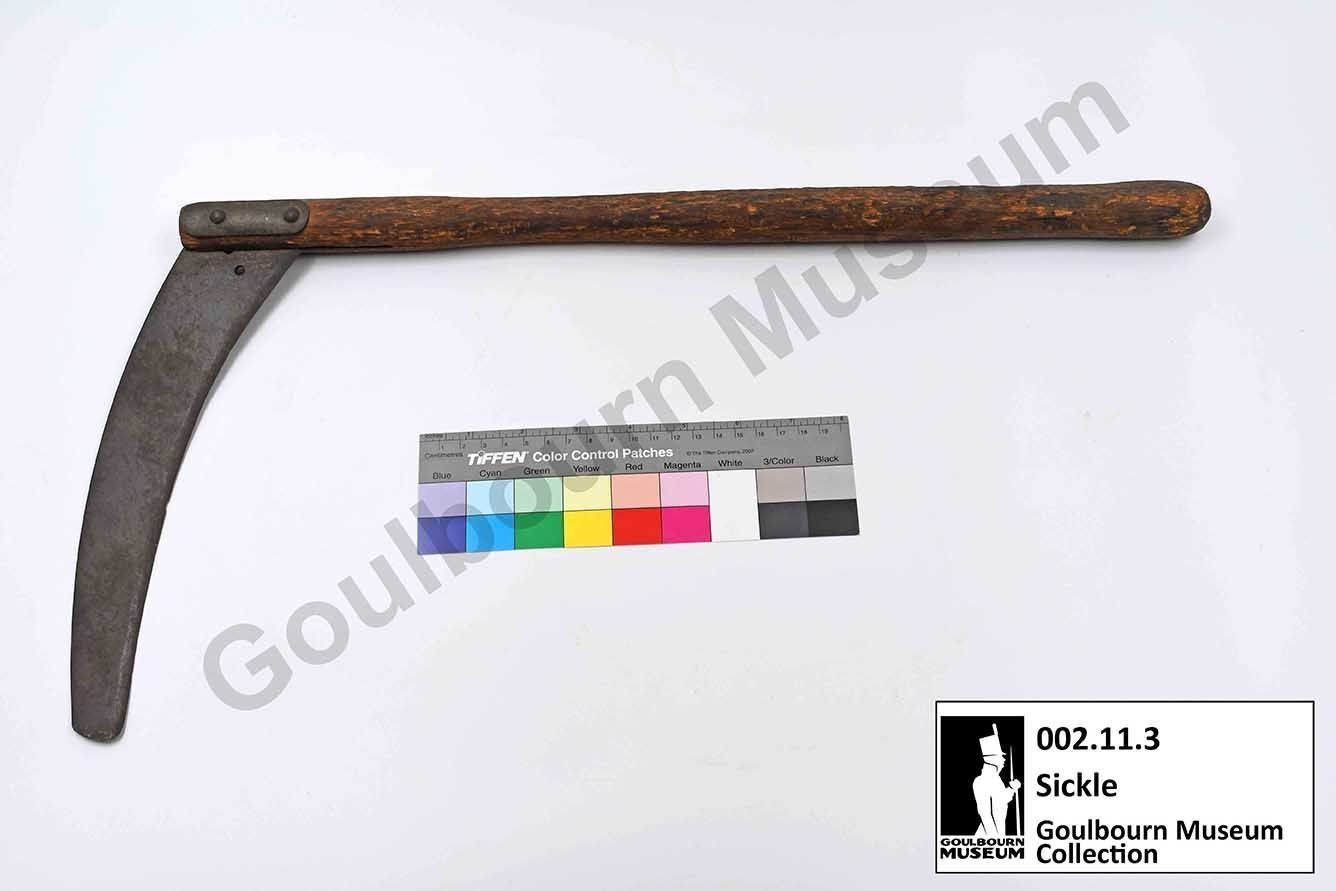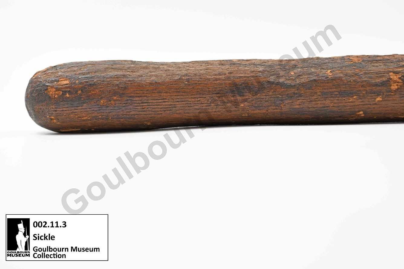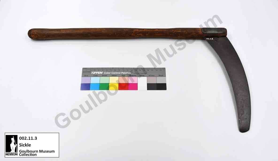 The object is a piece of harvesting equipment likely used on a farm. The wooden handle is short, unlike a scythe. However, similar to a scythe, the metal hook is curved. The hook is flat and wider at the base attached to the handle and tapers to a point.