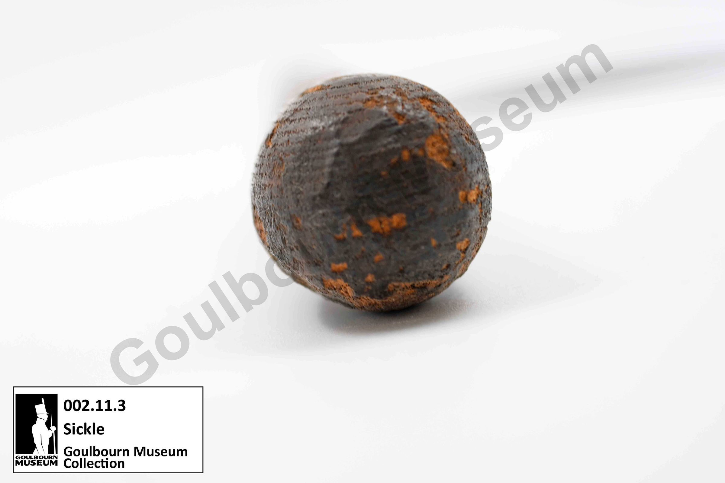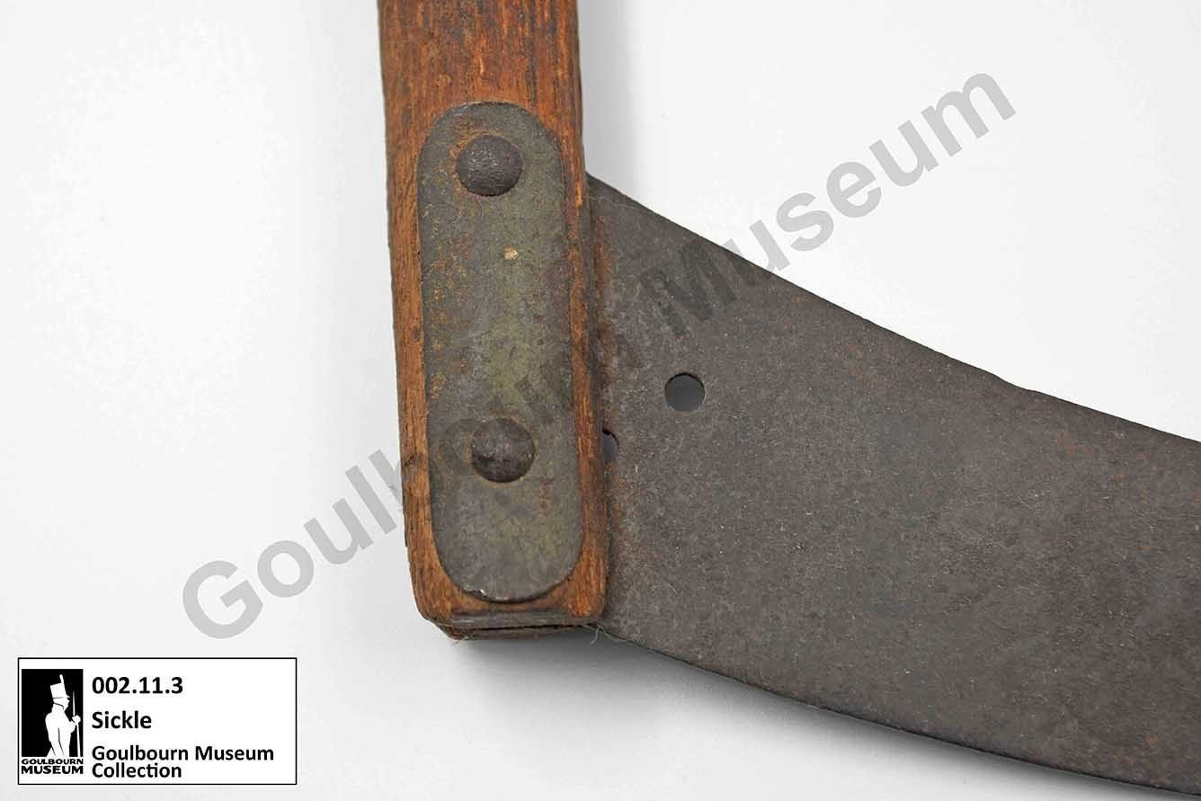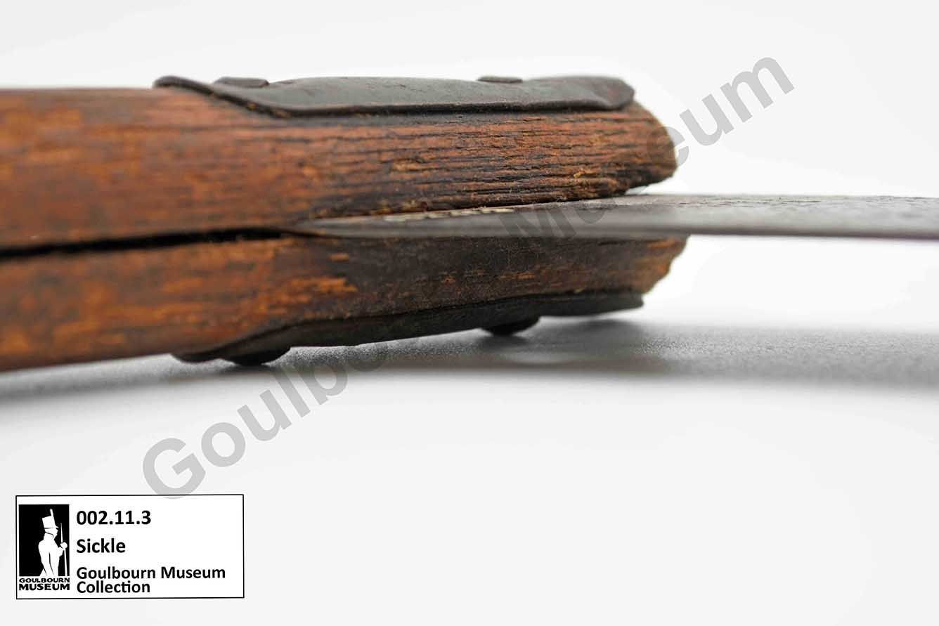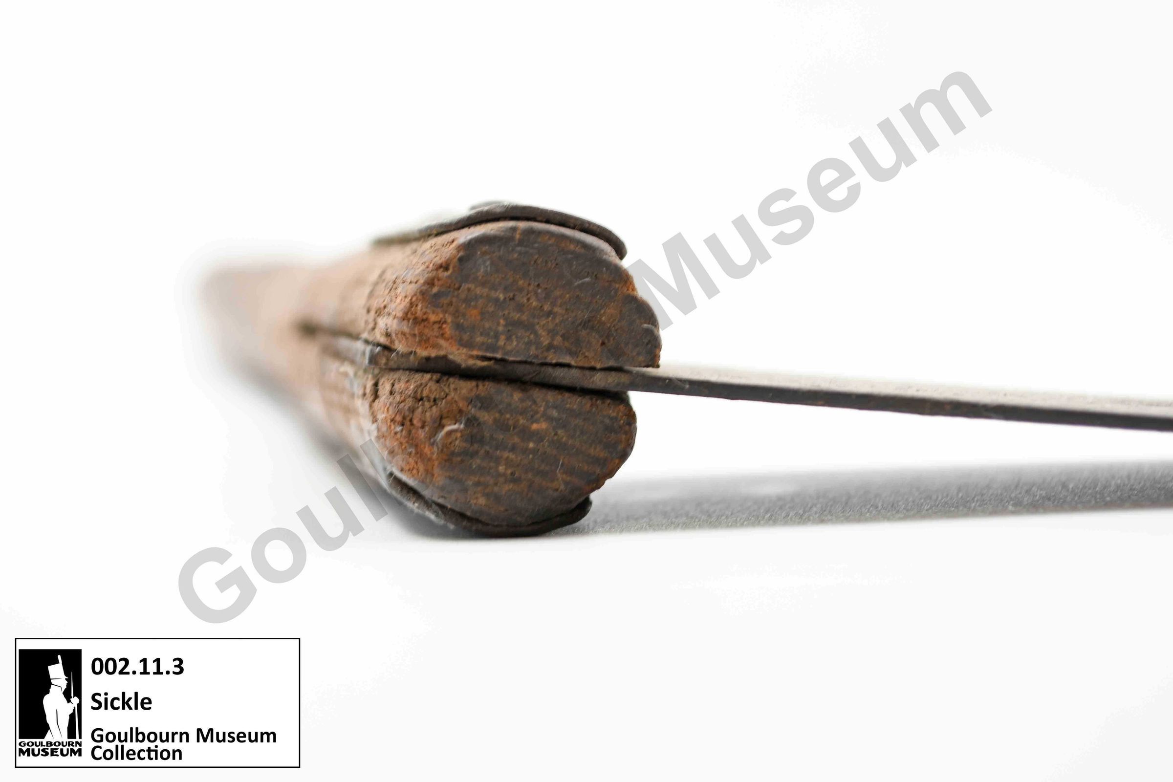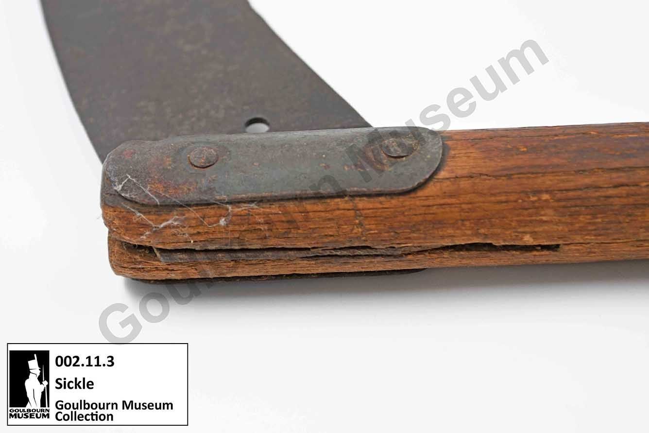 The object is a piece of harvesting equipment likely used on a farm. The wooden handle is short, unlike a scythe. However, similar to a scythe, the metal hook is curved. The hook is flat and wider at the base attached to the handle and tapers to a point.