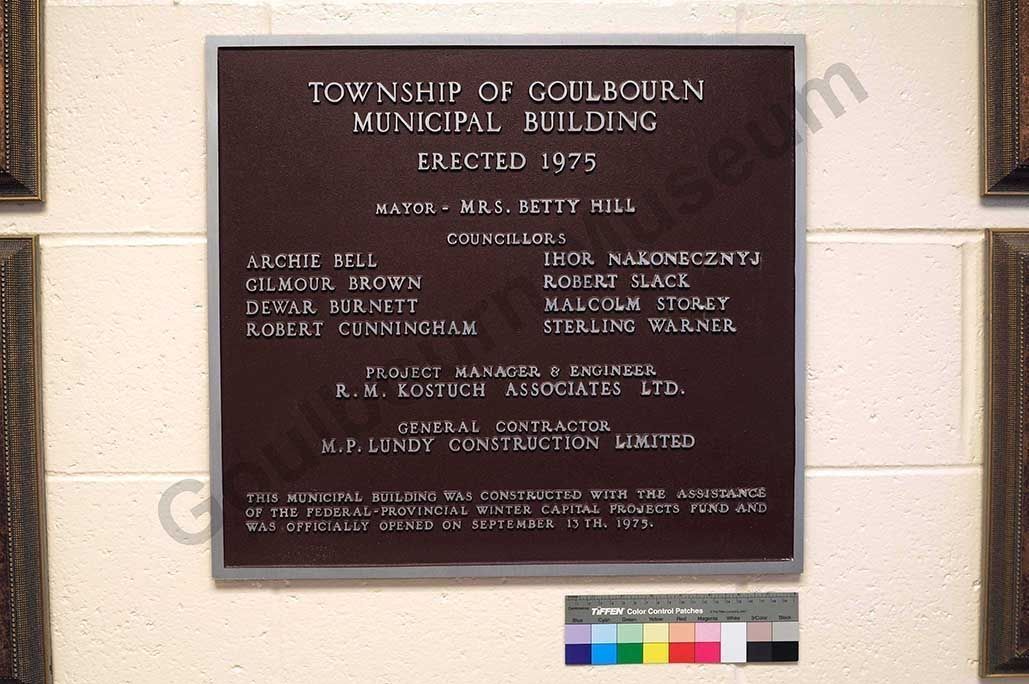 This metal plaque is rectangular shaped and records the dates and names of those involved in the erection of the Goulbourn Municipal Building in 1975. The plaque is framed in a silver coloured metal with a dark brown coloured background. In raised silver coloured font the plaque says, "Township of Goulbourn Municipal Building erected 1975. Mayor - Mrs. Betty Hill. Councillors - Archie Bell, Gilmour Brown, Dewar Burnett, Robert Cuningham, Ihor Nakonecznyj, Robert Slack, Malcolm Storey, and Sterling Warner. Project Manager & Engineer R.M. Kostuch Associates LTD. General Contractor M.P. Lundy Construction Limited." In a smaller font size reads the following, "This municipal building was constructed with the assistance of the federal-provincial winter capital projects fund and was officially opened on September 13th, 1975." The original item is currently attached to the wall of the Goulbourn Town Hall building.Context