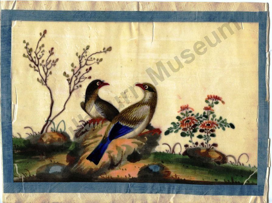 One silk painting of two birds sitting on a nest or a rocknear the center. On the left there is a tree, on the right is a flower andmore rocks.Not in a frameStored with 000.7.2 in an envelope in the OriginalDocuments drawer (near the front).Lexicon