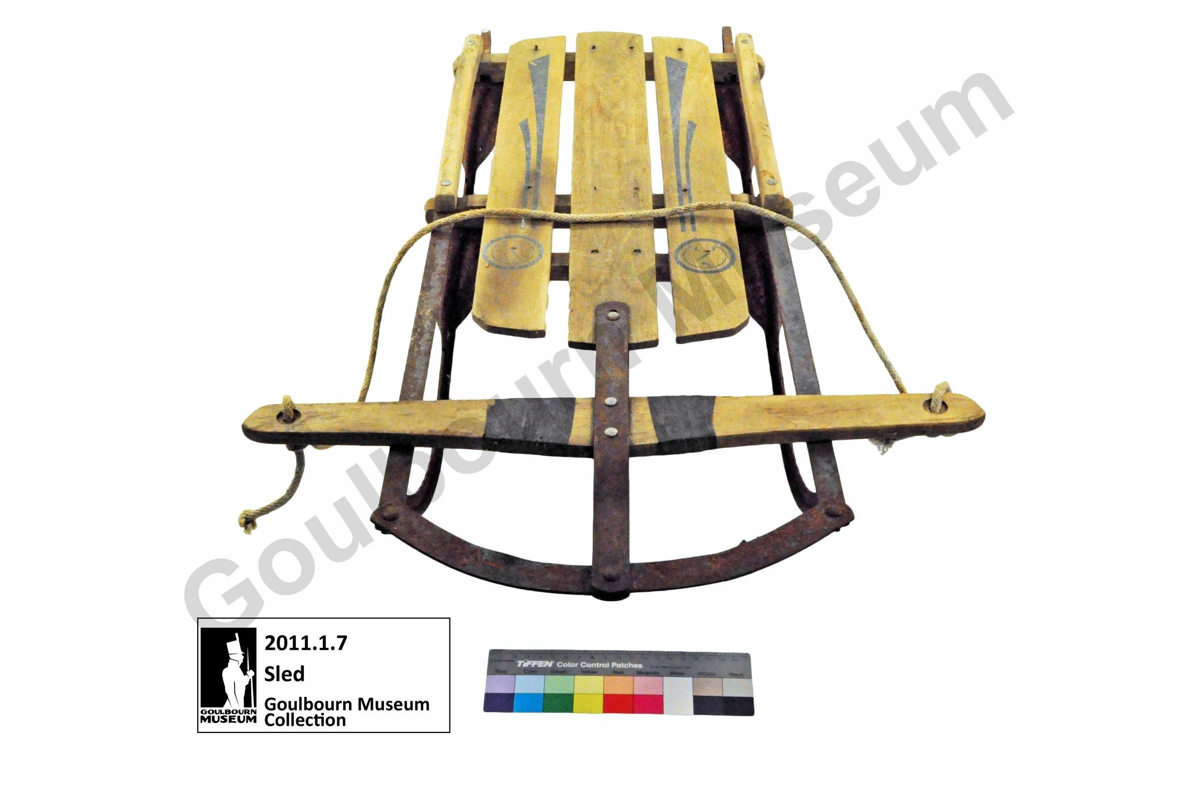 This object is a snow sled made of metal and wood. The metal is moderately-severely rusted. The wood is lacquered and tan in colour. The skates of the sled and its frame are made of metal to which a wooden seat/platform is affixed towards the rear, and a handlebar at the front. The platform is constructed of two horizontal pieces of wood affixed to the metal frame, on top which are overlain 2 vertical facing sideboards on each side of the exterior as well as three flat panels which comprise the central body. The exterior two slats of the central body contain a mirrored decorative element rendered in a grey medium. These present as two lines which narrow in thickness from back to the front, extending towards the front of the sled; at the front of the panels at the terminus of the lines is a single circle, roughly resembling a clock. The front handlebar is made of one piece of wood. It is oriented horizontally and is attached directly to the metal frame by two silver colored bolts. Two black marks on either side of the center are likely indicative of handgrips. There are two small holes drilled vertically through the handlebars, one at each side. A yellow rope is anchored to each of these holes on each end creating a handle with which to pull the sled.Collection