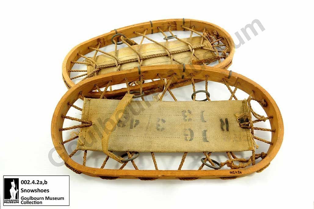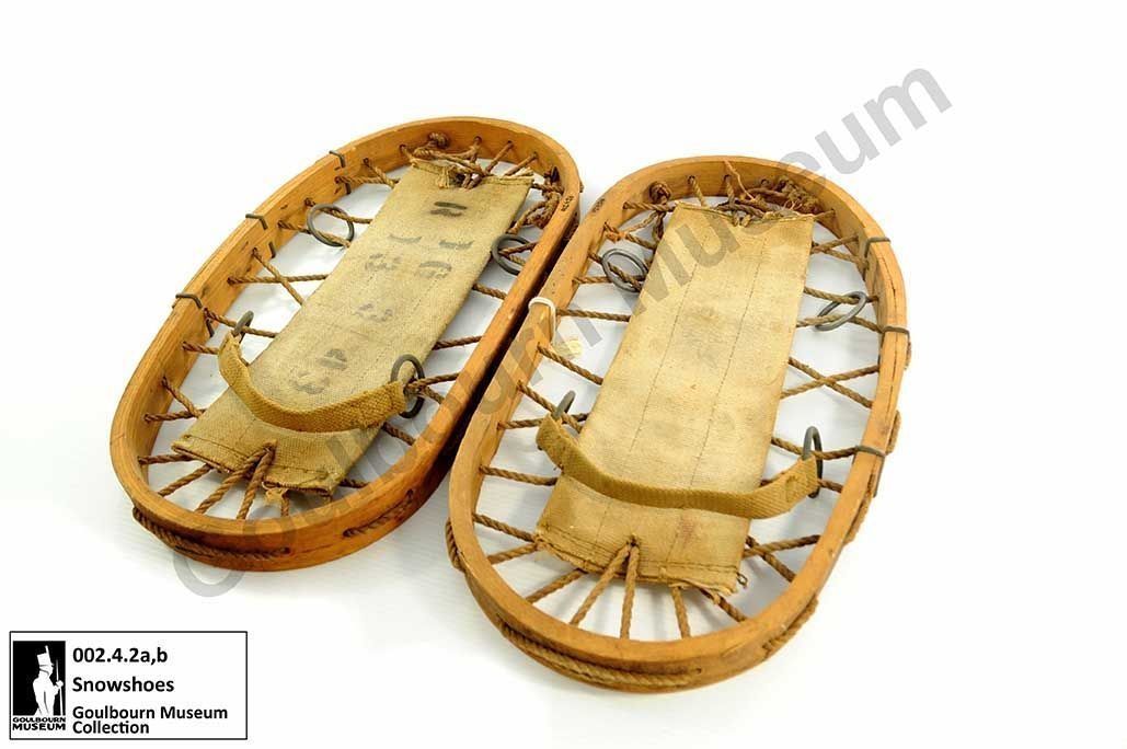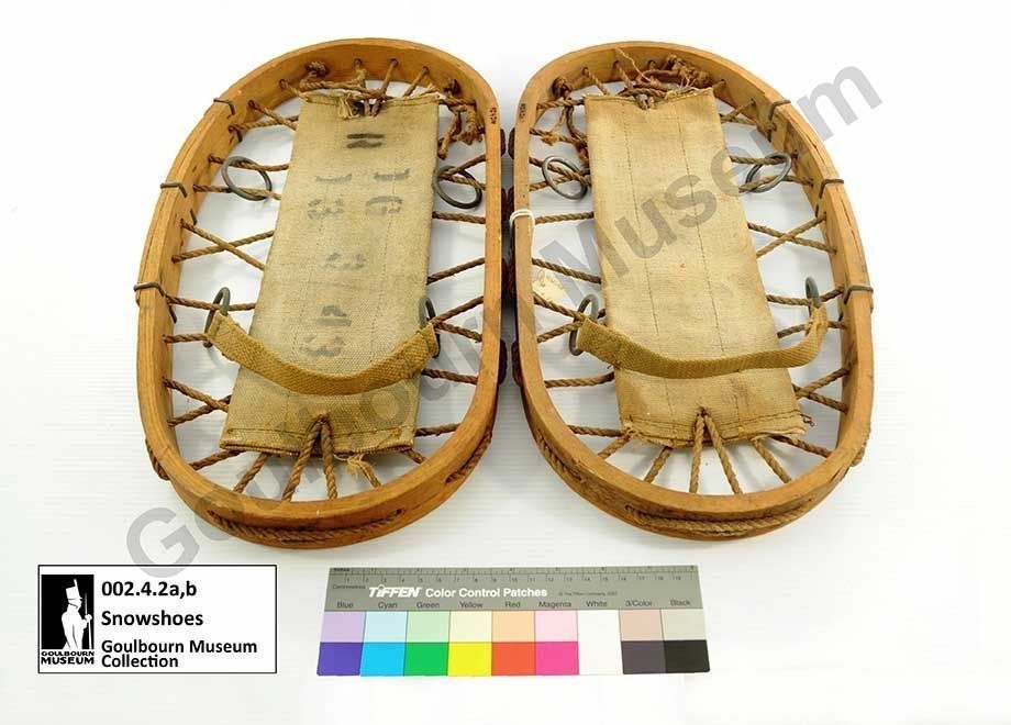 One set of two snowshoes. Each snowshoe is made with an exterior bent wood frame that is held together with three metal clamps. The interior of each snowshoe is comprised of a central rectangular piece of canvas fabric that is suspended on a woven rope net that is secured to the frame through a series of holes in the wood. Each snowshoe has four circular metal rings, two attached to either side of the central canvas rectangle. These rings were used to attach the snowshoe bindings and there is one canvas binding remaining on each snowshoe. The right snowshoe has black coloured stenciled writing preserved on the canvas rectangle.Context