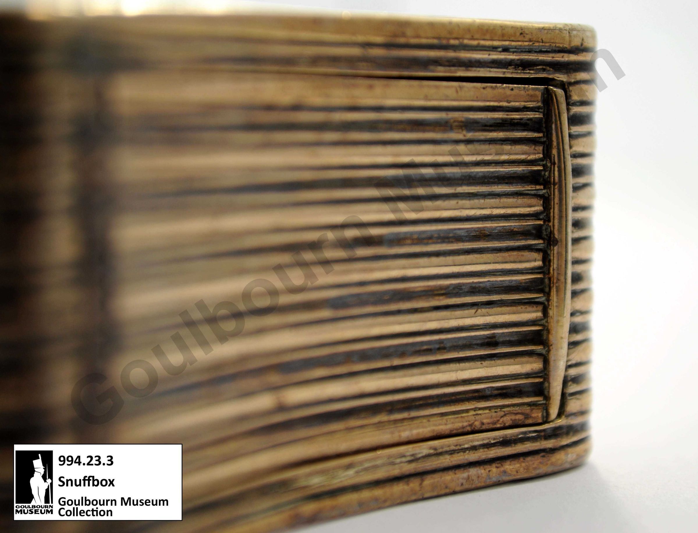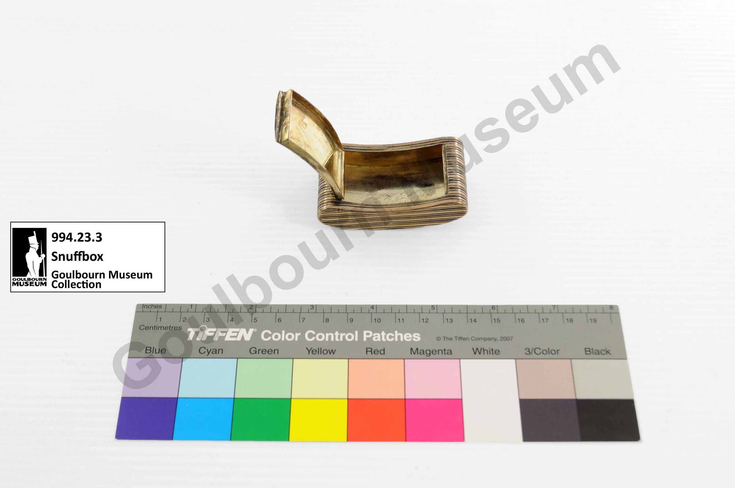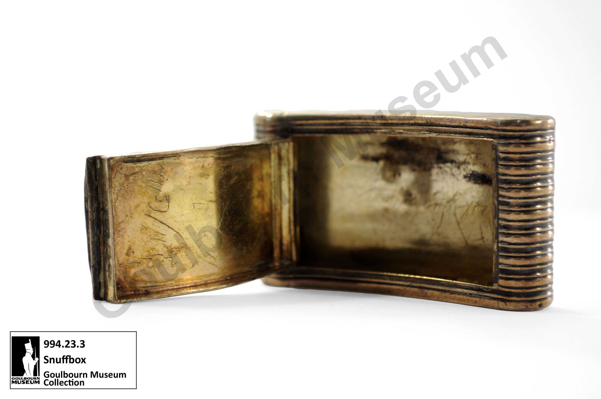This object’s donor suggests it belonged to Colonel George Thew Burke. According to family history Burke was struck in the chest by a musket ball during the Battle of Aboukir, Egypt (1801) and was saved by the snuffbox stored in his pocket. The 1806 date of this box suggests Burke owned it while serving with the 100th Regiment of Foot during the War of 1812 and during his efforts in the subsequent colonization of Goulbourn Township.