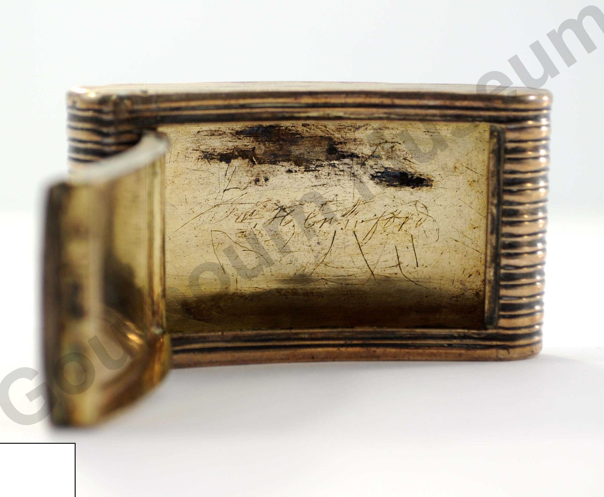 A silver snuffbox with niello in the repeated groove pattern. The entire box has tarnished to a straw yellow. It is curved to fit in a breast pocket. Silver plated (lack of sterling silver mark)Context