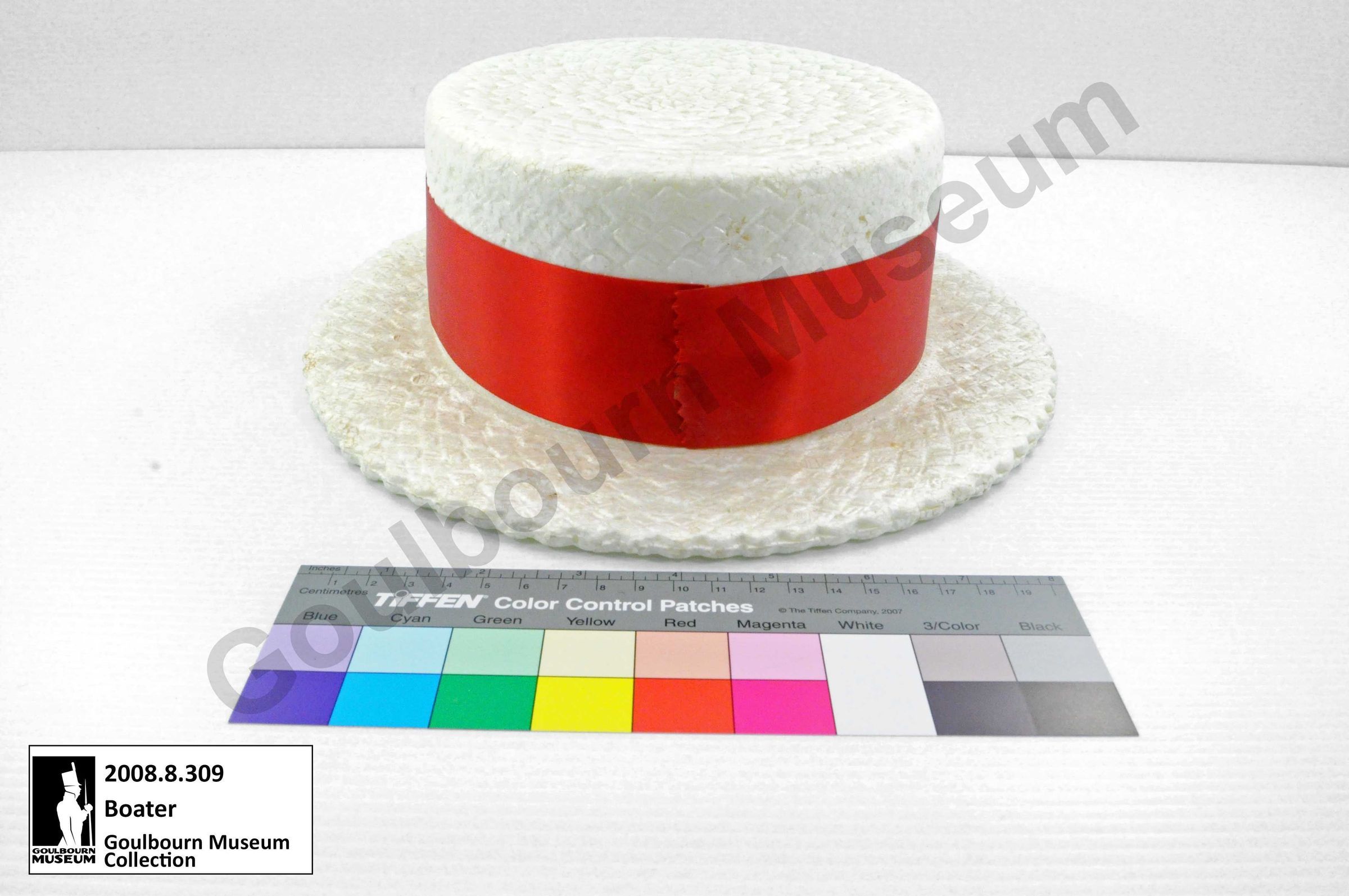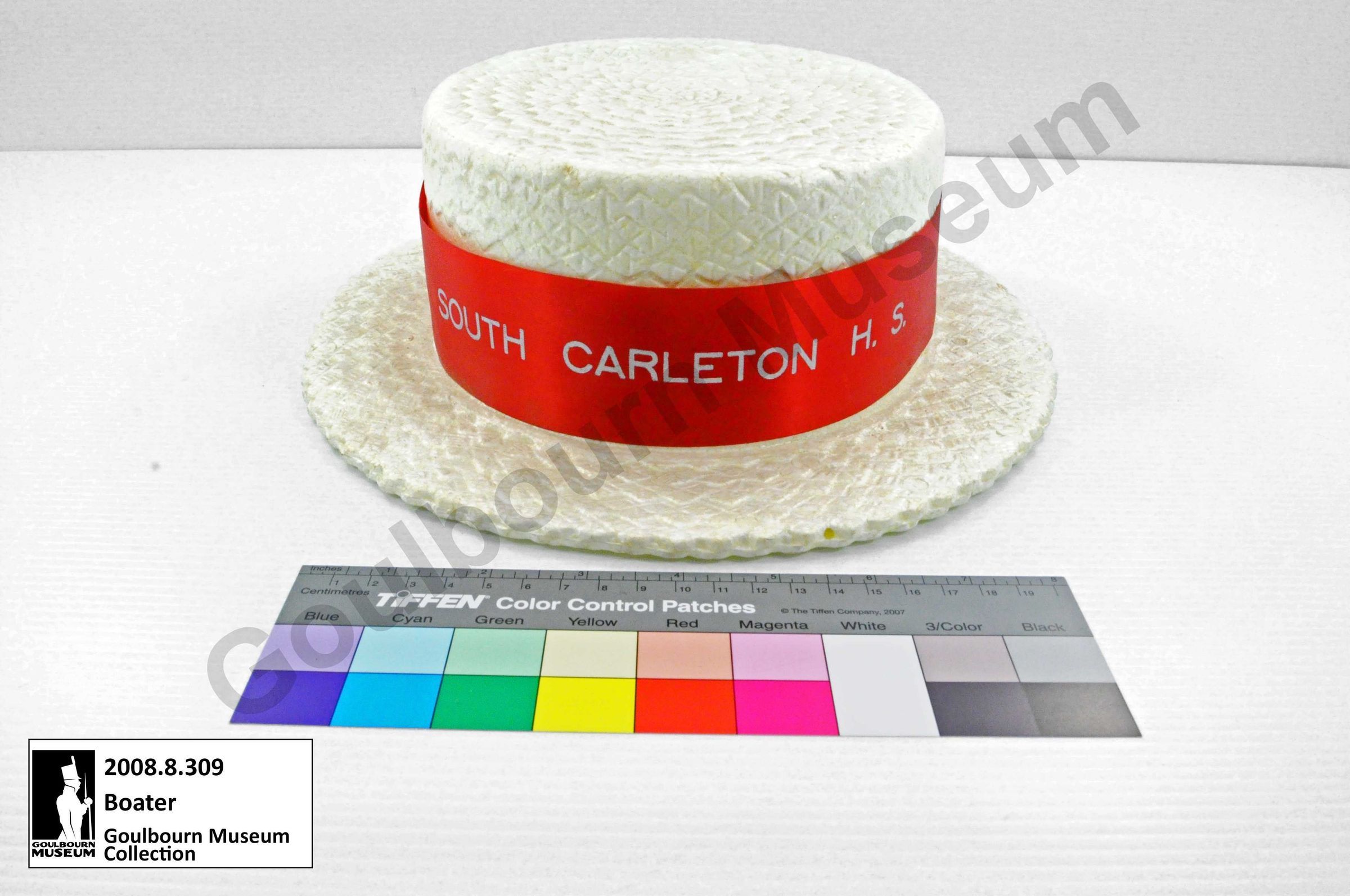 This object is a boater style hat. It is made from a white colored synthetic straw. There is a glossy red fabric ribbon wrapped around the base of the crown which serves as a band. The words "SOUTH CARLETON H.S." appear in a silver font at the front of the band, rendered in all capitals.Context