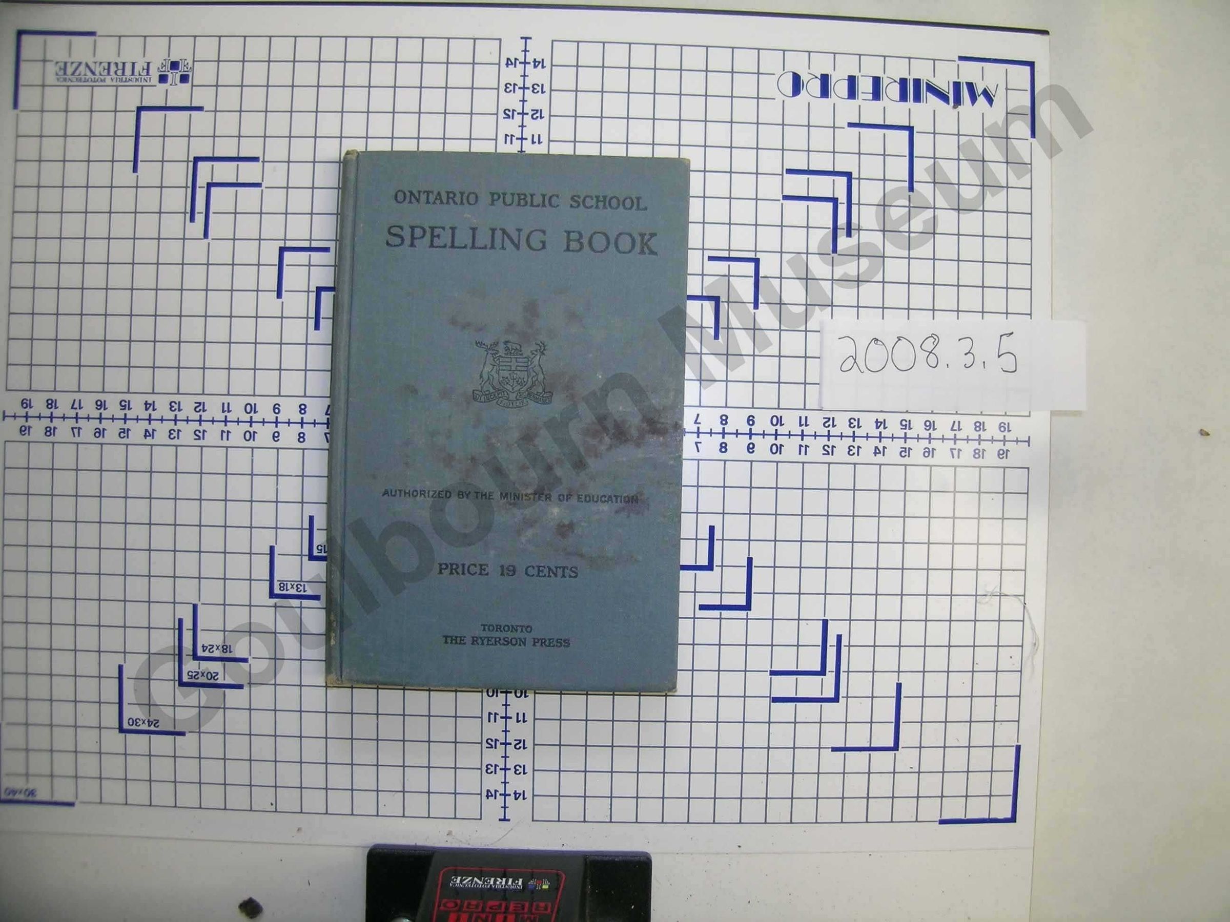 Blue rectangular textbook with the coat of arms for Ontario and black text reading "Ontario Public School Spelling Book. Authorized by the Minister of Education. Toronto, Ryerson Press"