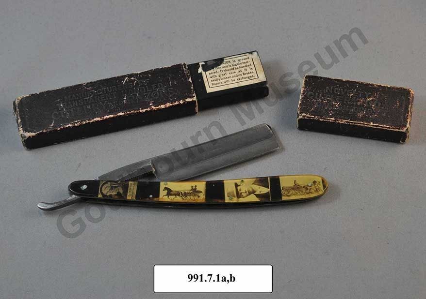 Personalized straight razor and case. Straight razor blade is engraved NOVELTY CUTLERY CO. CANTON, O. PAT NOV. 79. Handle is likely a cellulose-plastic plastic. Front has several pictures: one labelled "My Wife and Mother-in-Law," two men driving a horse and carriage, a portrait of a man with a hat, and a man driving a wagon. The reverse of the handle shows two pictures of cows and reads "J.F. Sloan, Kazuabazua, Que." Case is stamped MANUFACTURERS OF TRANSPARENT HANDLED CUTLERY AND RAZORS. Lip has a label that reads "[obscured] -AZOR is ground [obscured] thin and is highly tem-pered. It should be handled with great care as it is easily broken and no Broken Razors will be exchanged." Case cap is stamped NOVELTY CUTLERY CO. CANTON, OHIO.Made/Created