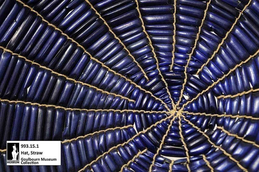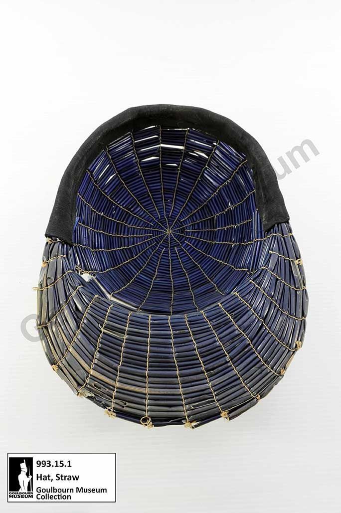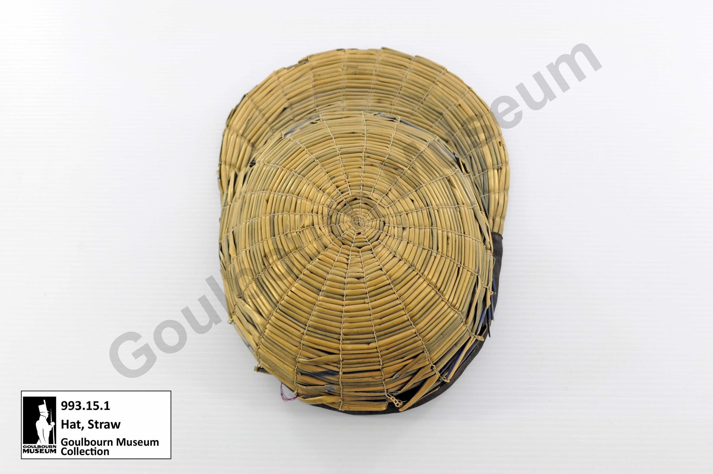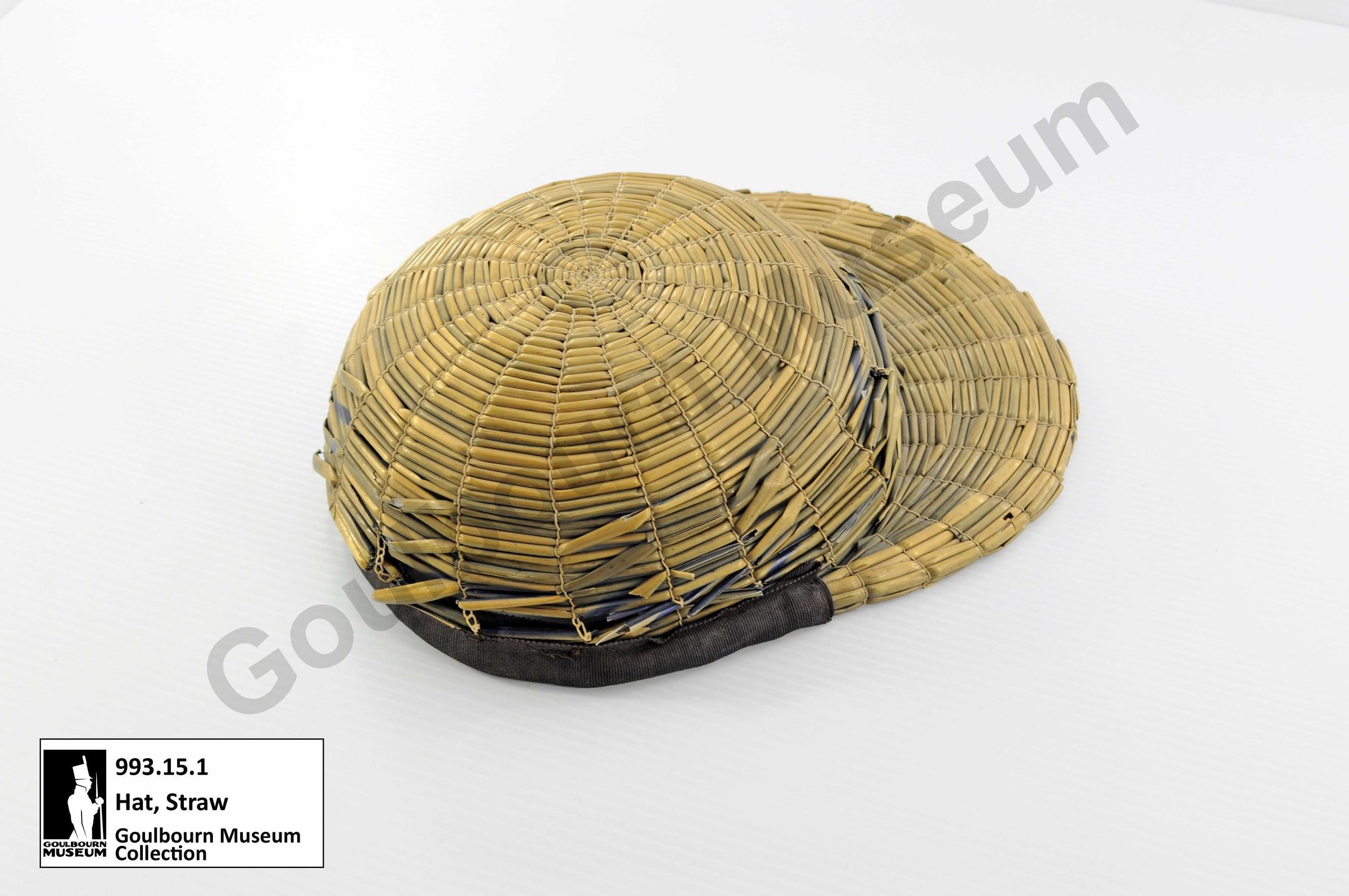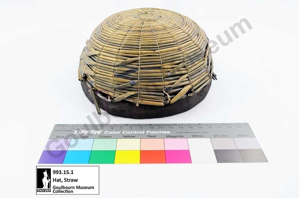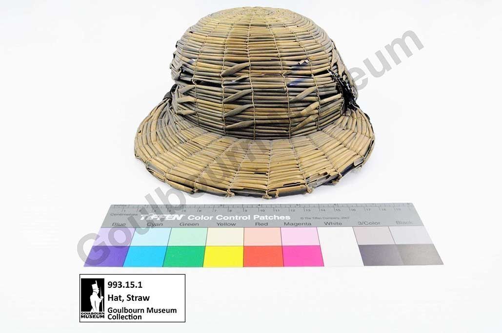 This artefact was donated to the Museum in 1993 by the family of Mr. Jim Green, who used this hat c. 1870-1900 while working as a farmer. The hat originally was made of a vibrant blue dyed straw, however the sun has completely bleached away all of the blue from the outside of the hat. This style of hat is quite unique, a blend of the straw boater hat that was popular with Victorian era gentlemen and the cloth cap that was worn by the members of American baseball leagues c. 1900.Collection