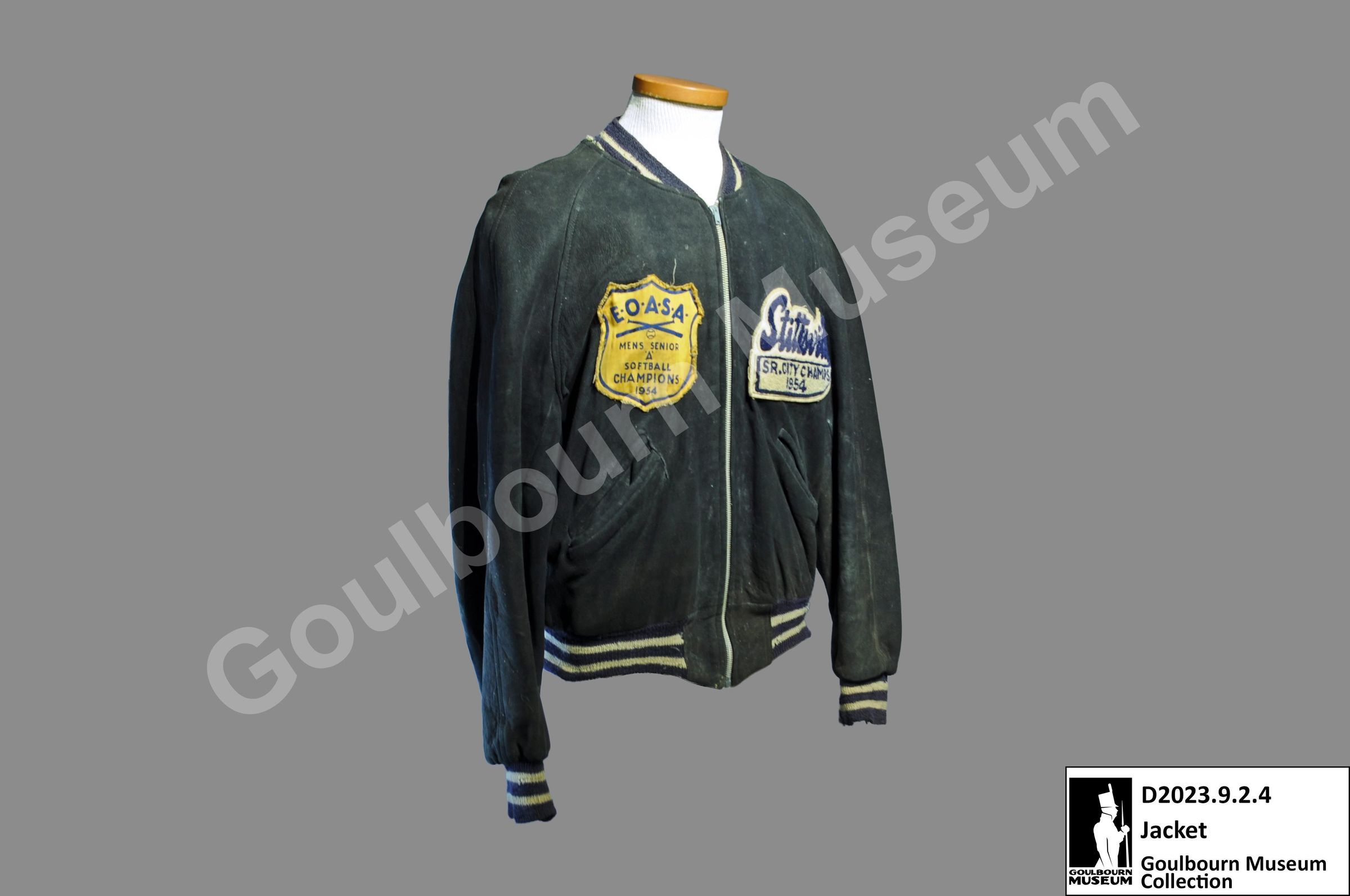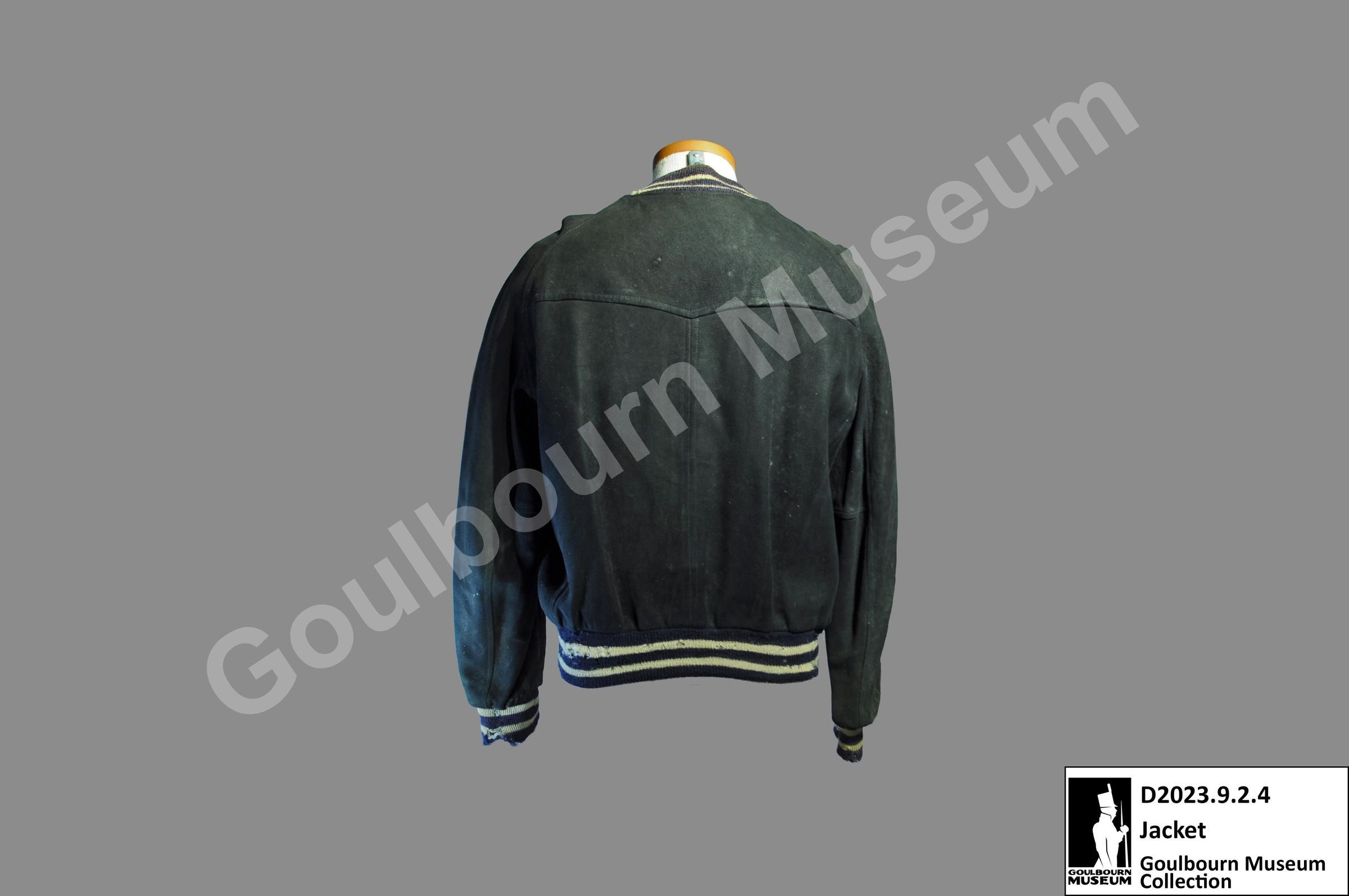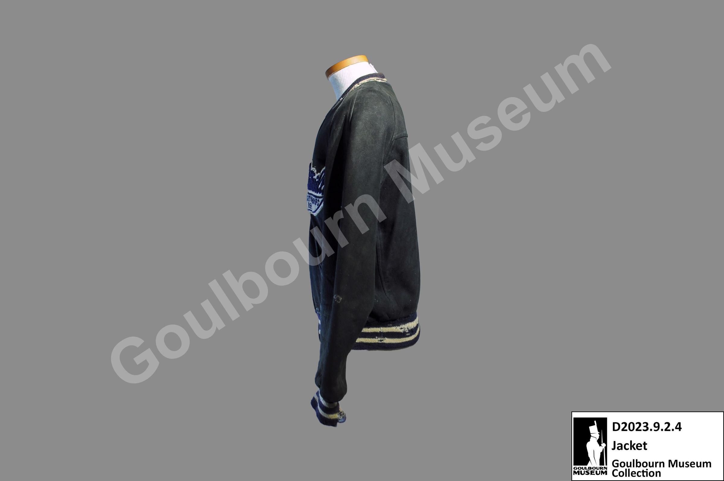 One letterman's jacket. The jacket is black sued with white and black sleeve cuffs, collar, and bottom edge. The front of the jacket has a white zipper, two pockets, and two breast patches on either side.Context