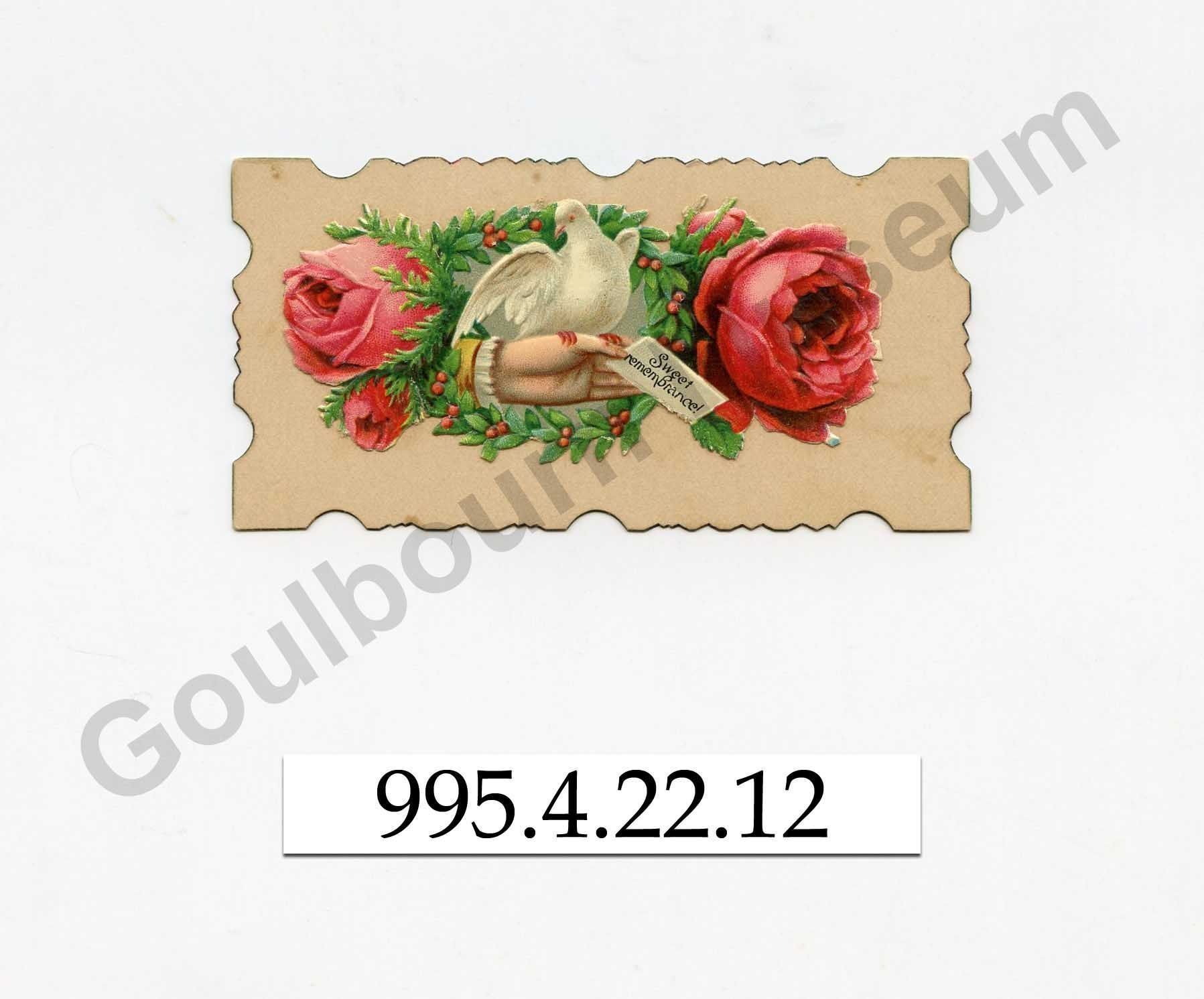 One paper greeting card with the message "Sweet remembrance," decorated with the image of a woman's hand, encircled with pink roses, with a white dove perched on the hand. The image is adhered to the left side of the card, under the right side of the image is written, "Millie Mooney."Context