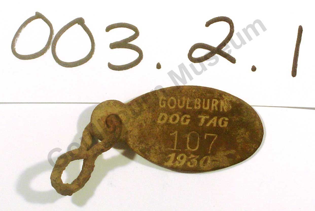 "Goulbourn Dog Tag 107 1930" is etched into the surface of the tag.