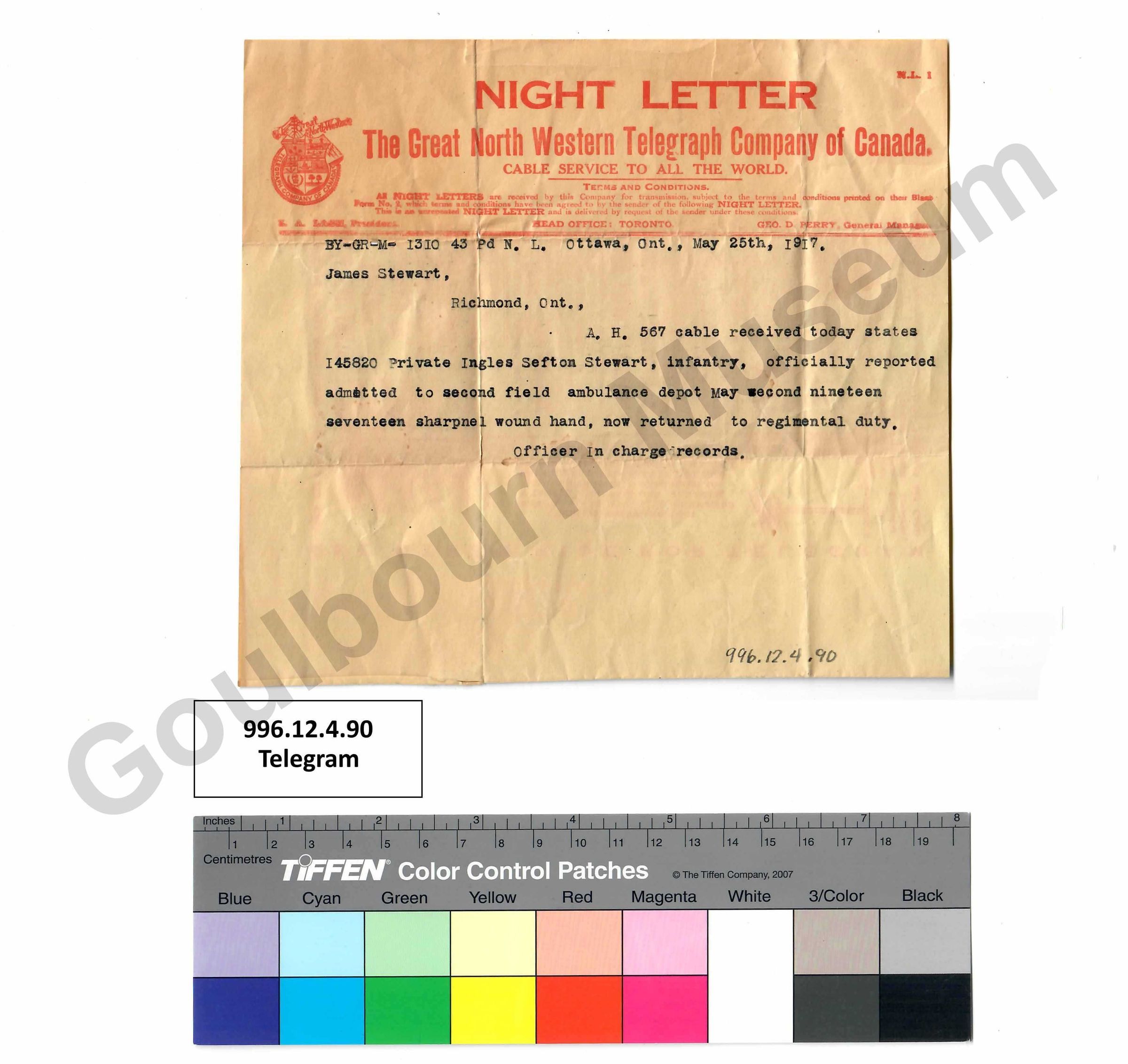 Telegram from the First World War collection about Sefton Stewart, a Richmond, Ontario resident who served with the Canadian Expeditionary Force during the Great War.Collection