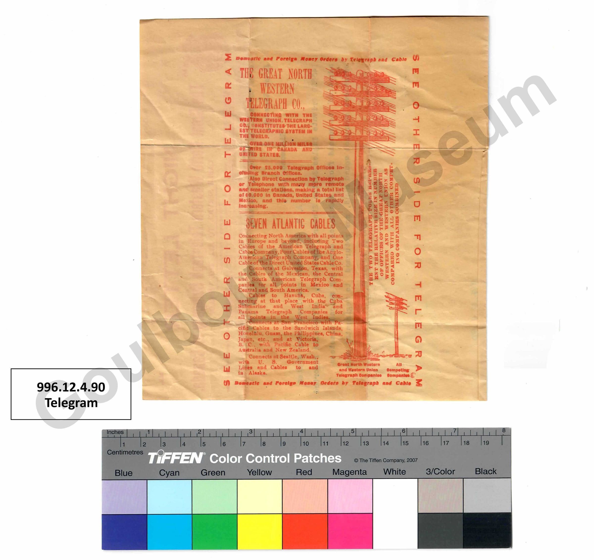 Telegram with a letterhead that reads, "Night Letter. The Great North Western Telegraph Company of Canada. Cable Service to all the World."