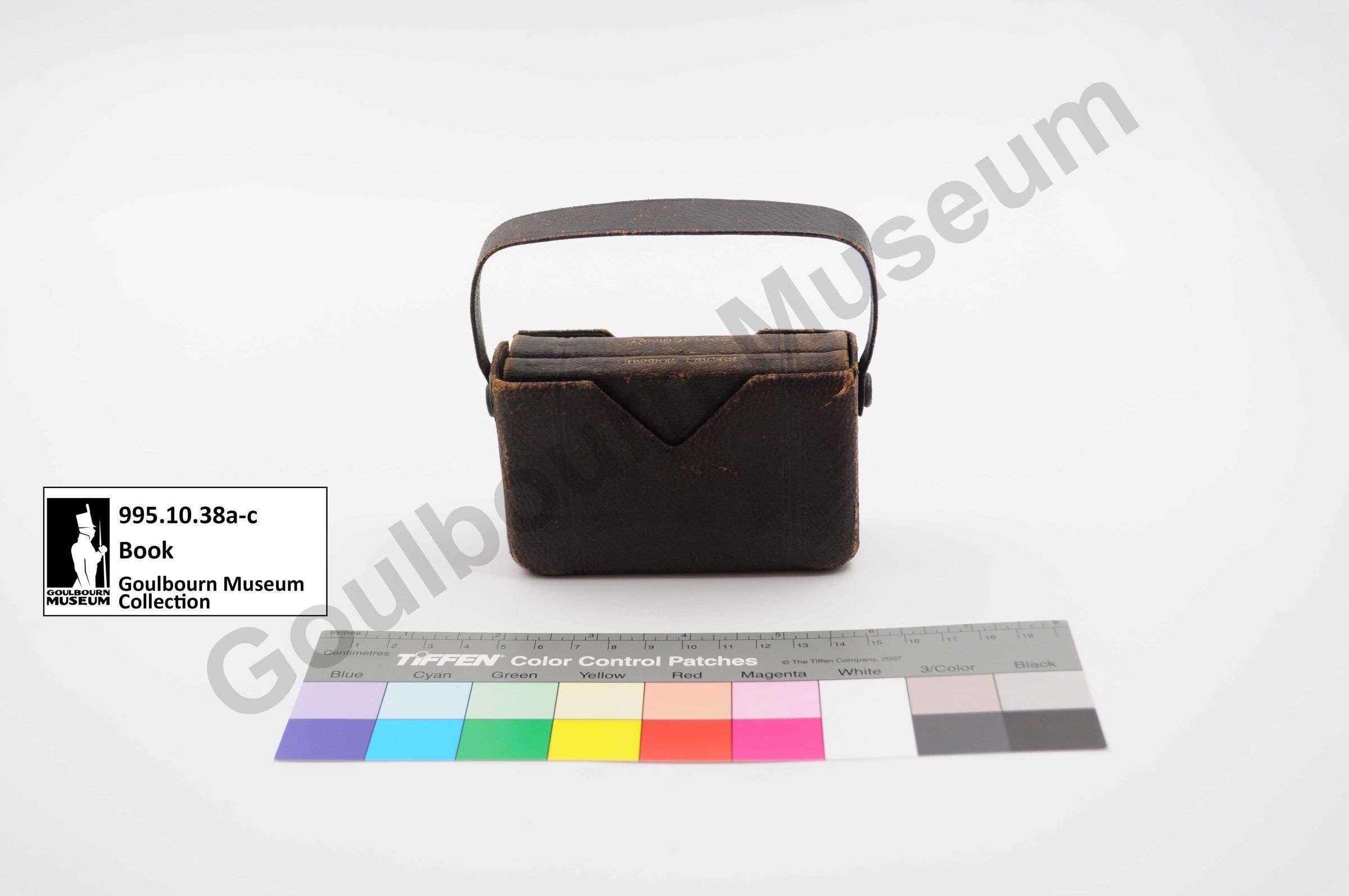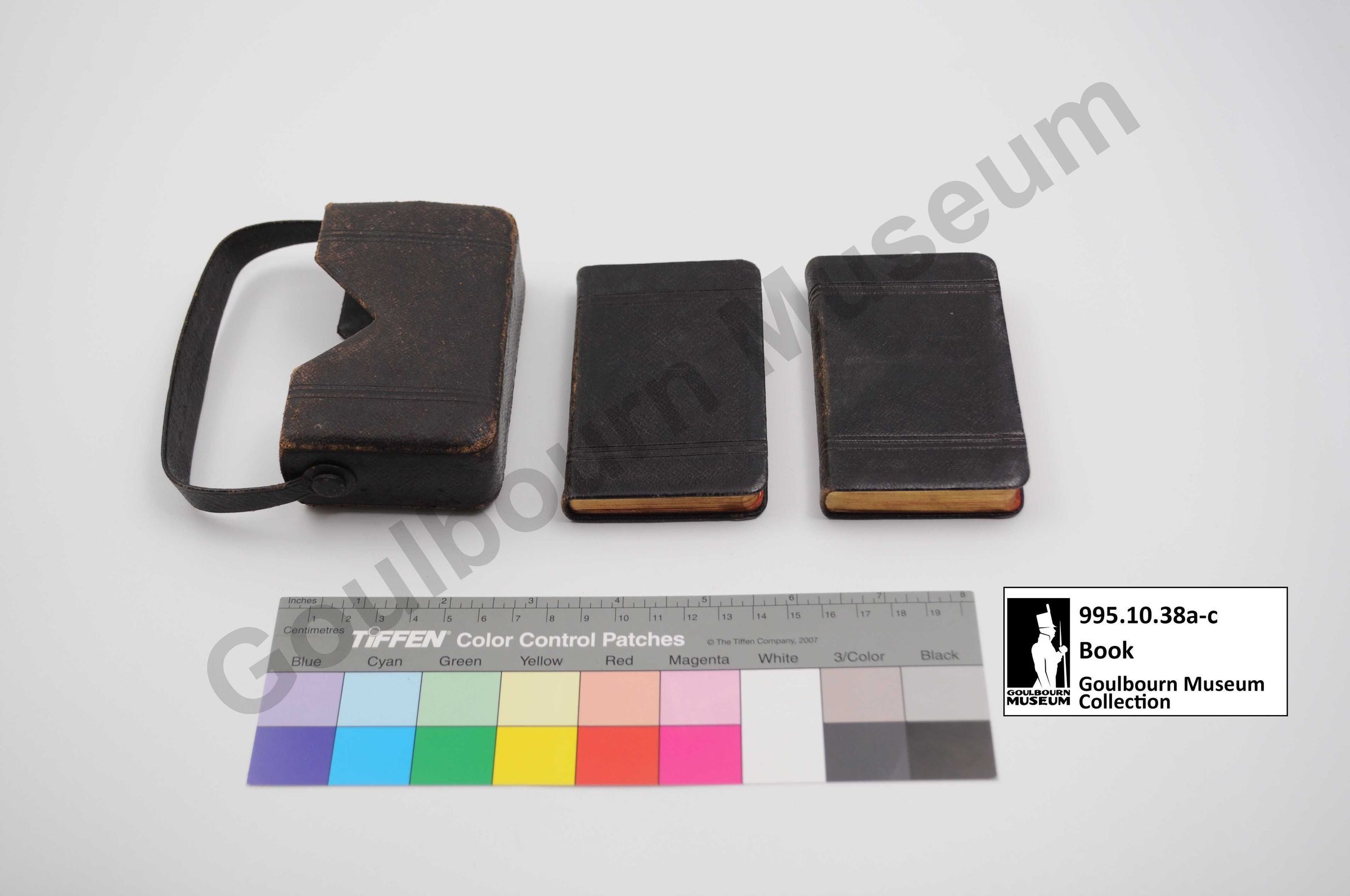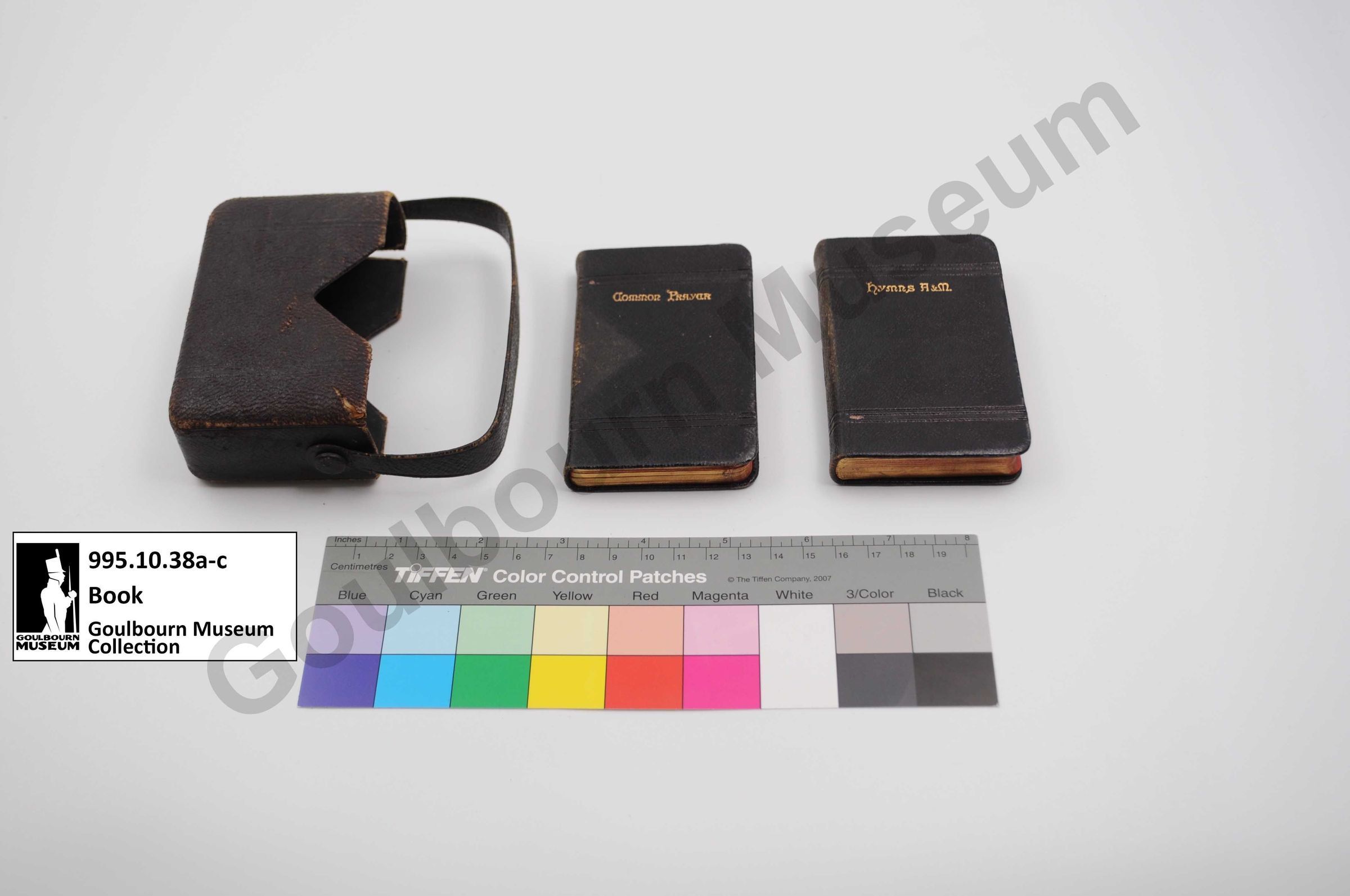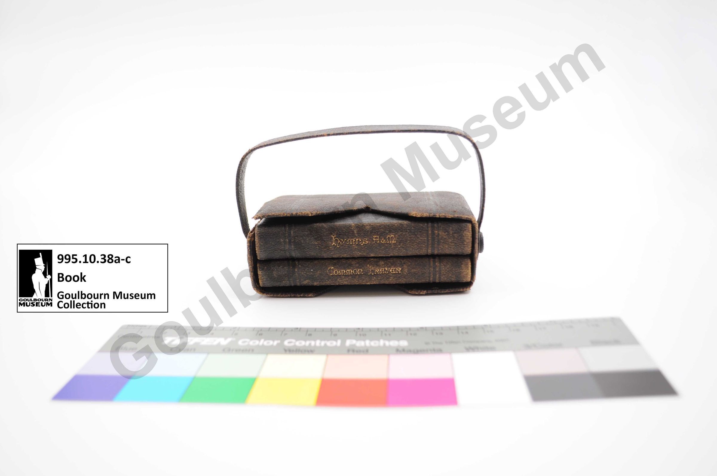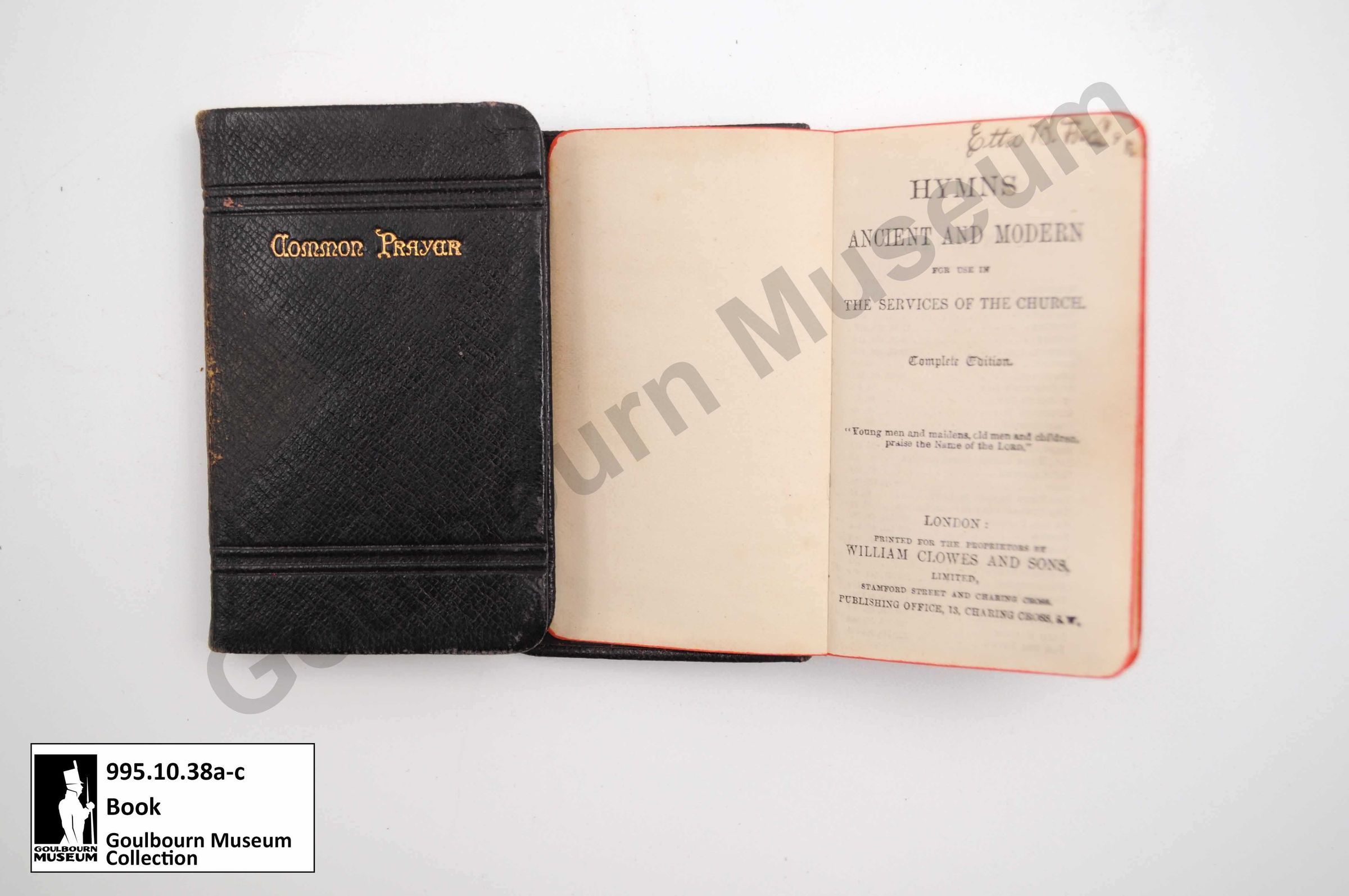 Two books with case: a) Book with black cover titled "The Book of Common Prayer and Administration of the Sacraments;" b) Book with black cover titled "Hymns-Ancient and Modern for Use in the Services of the Church;" c) Black case; used to hold 995.10.38a and 995.10.38b.Collection