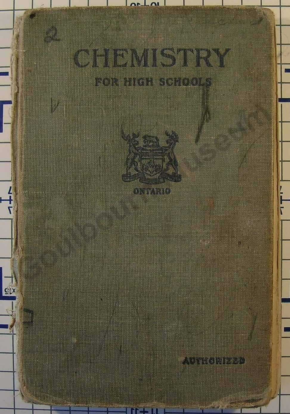 Green book with black ink depicting the coat of arms for Ontario, reading "Chemistry for High School".