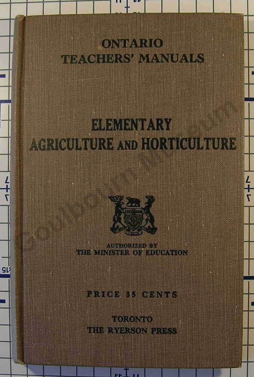 Brown book depicting Ontario's coat of arms with black text, reading "Ontario Teacher's Manual Elementary Agriculture & Horticulture. Authorized by the Minister of Education".