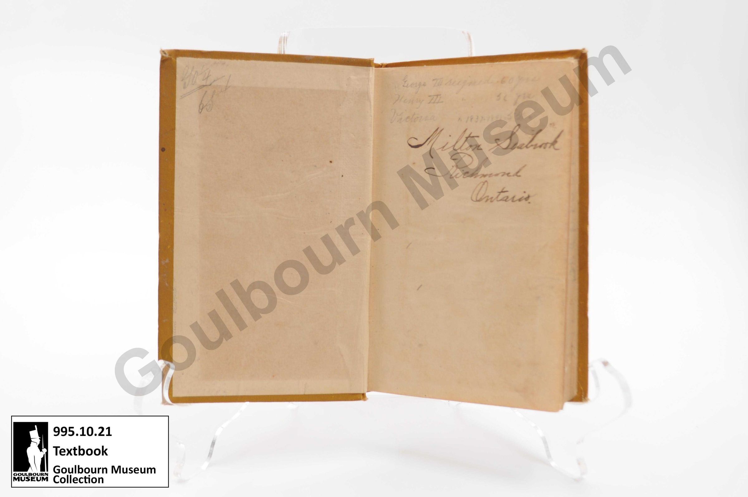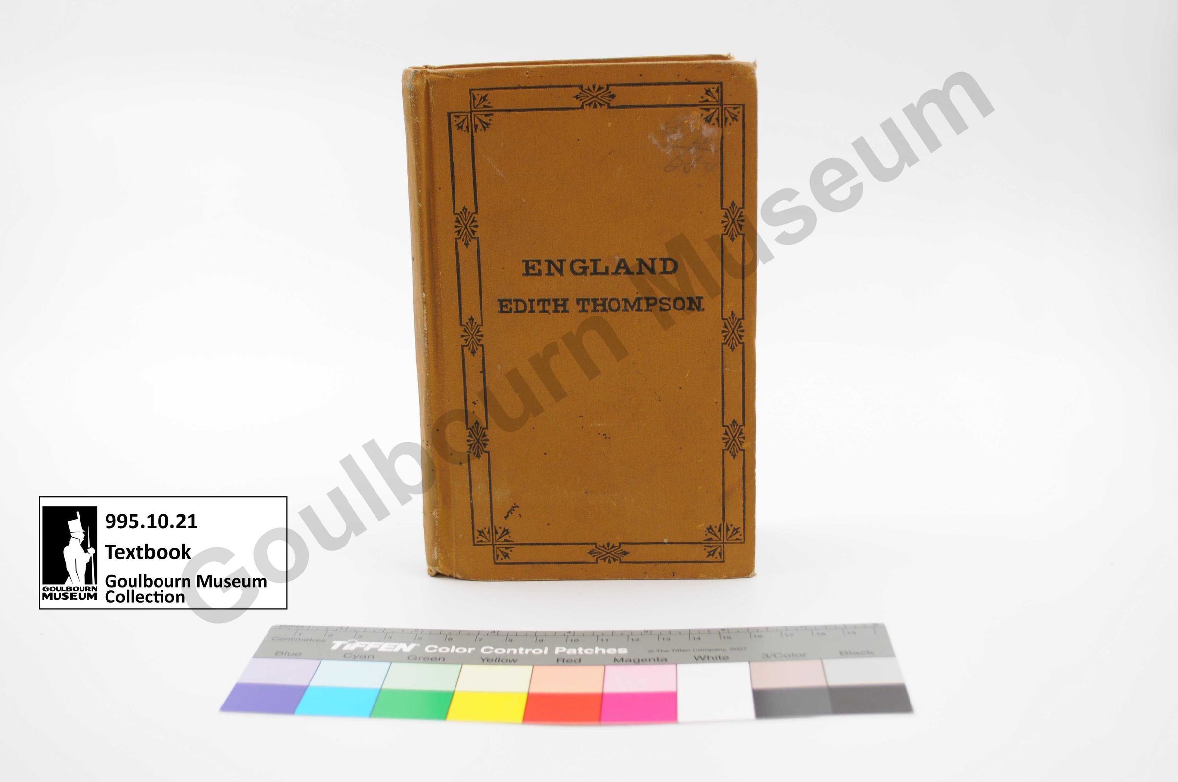 Hardcover book with yellow cover. The title, "England," is written on the centre of the front cover in capital letters. Written by Edith Thompson.Collection