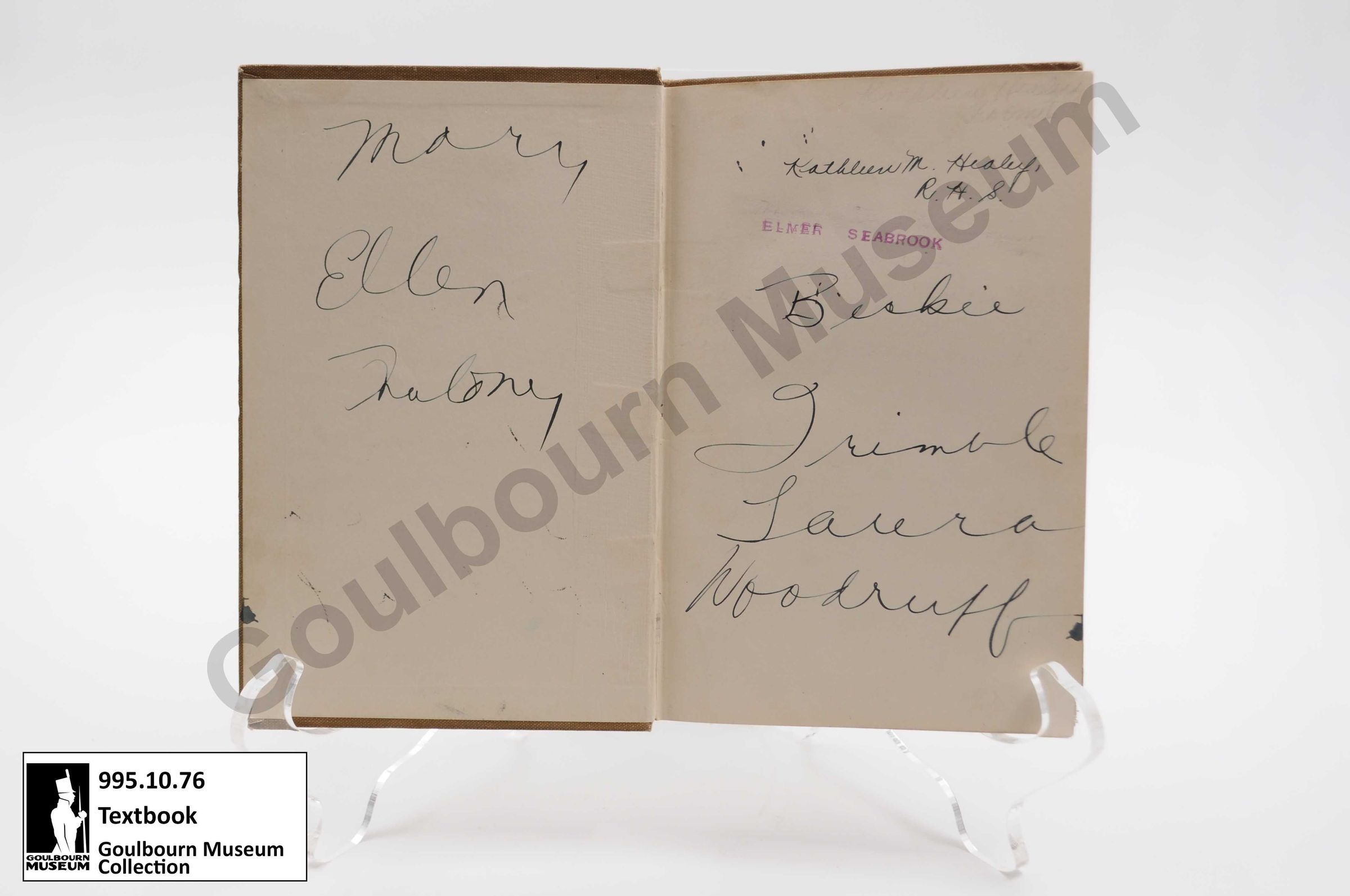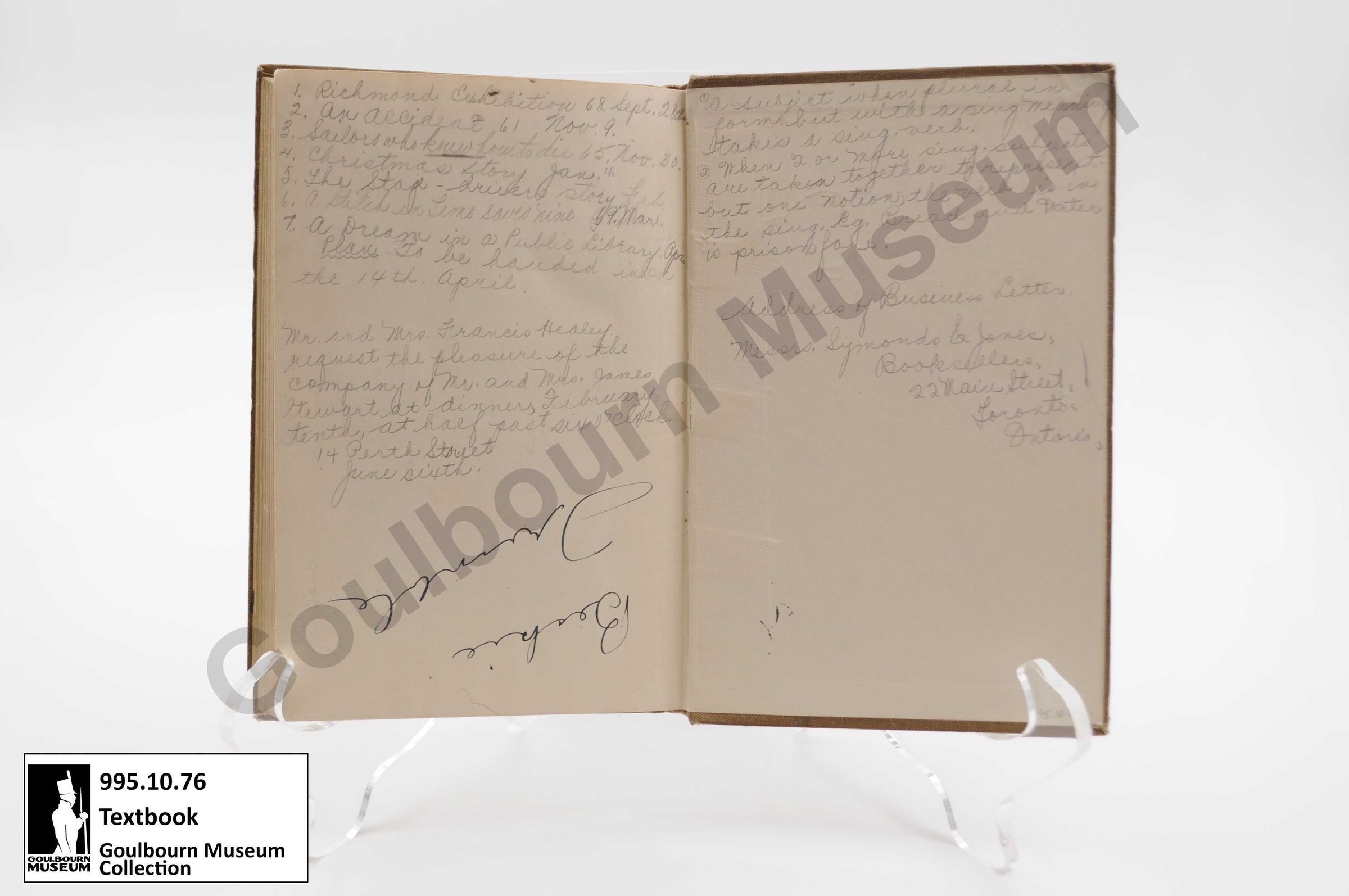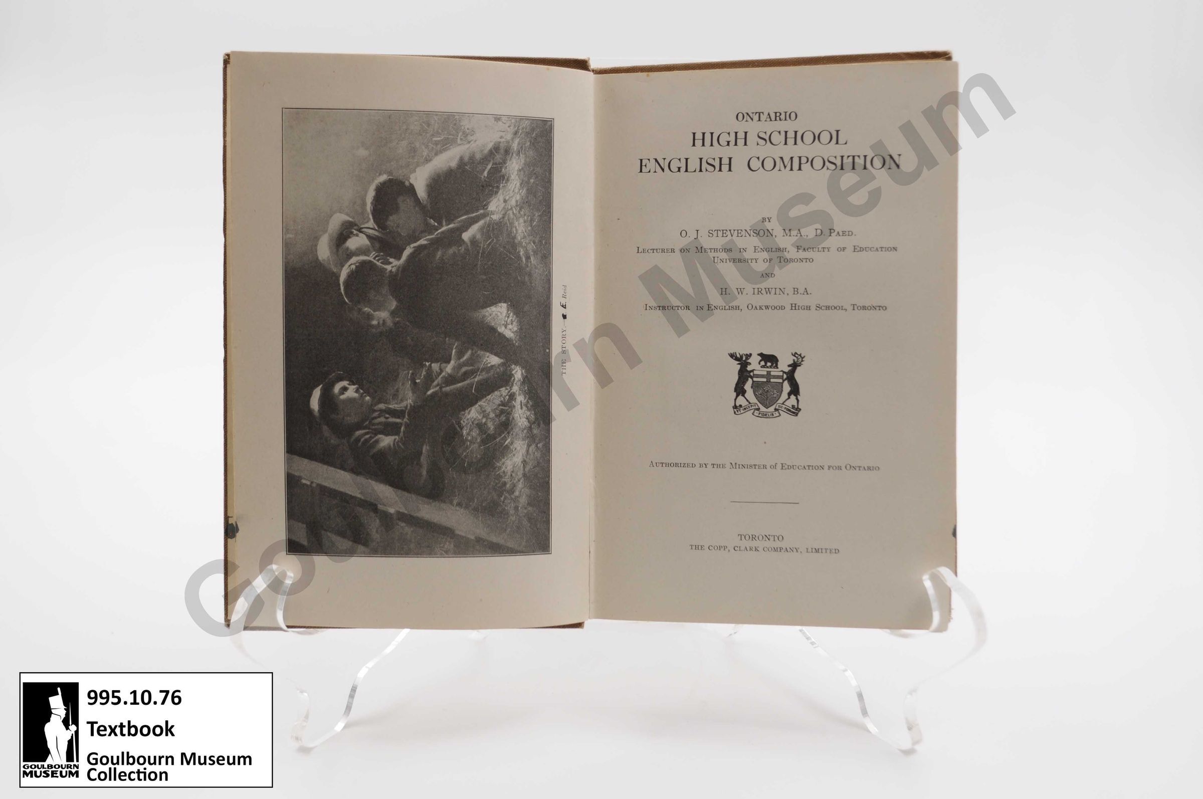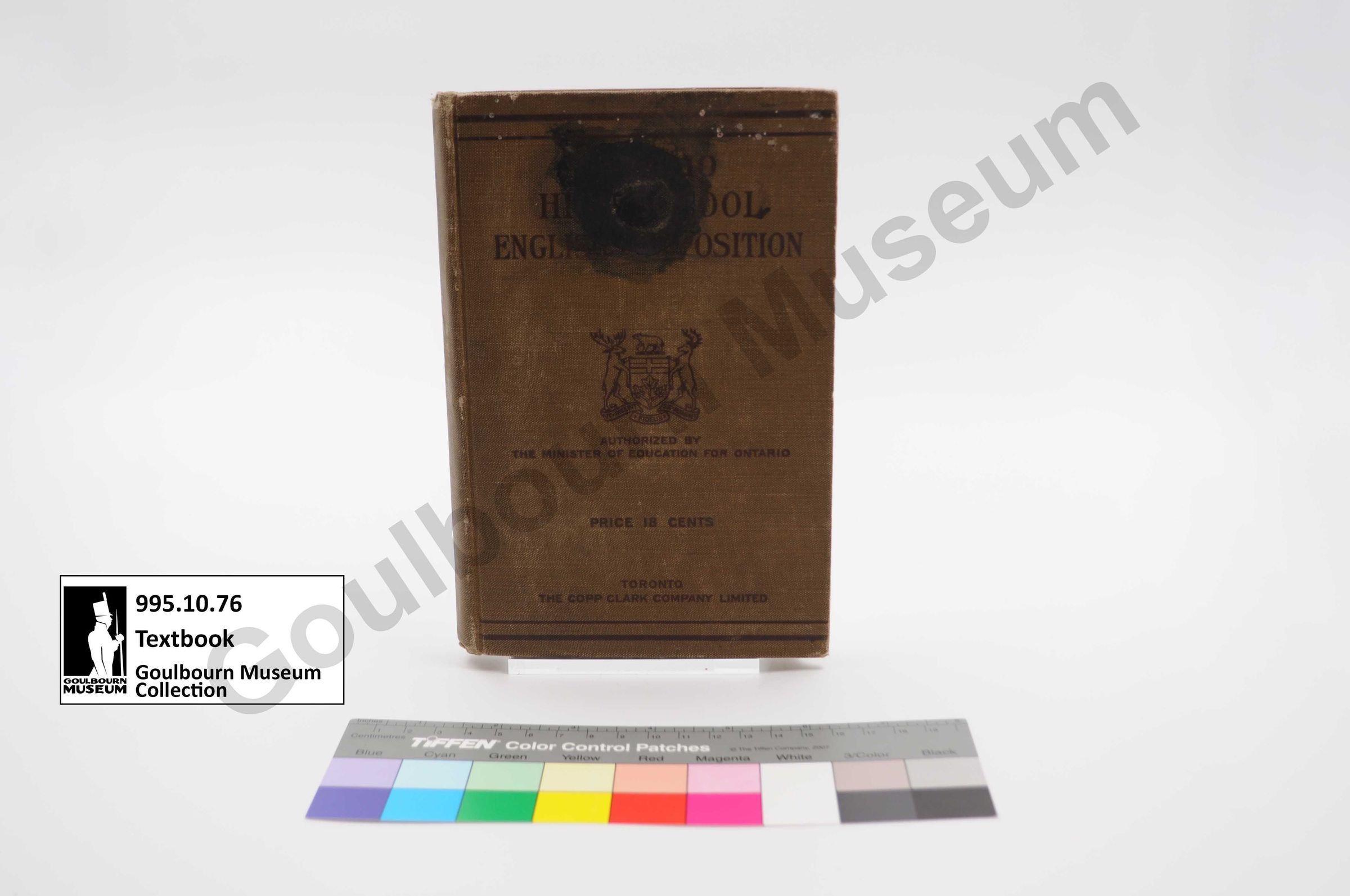 Brown cloth cover depicting Ontario's coat of arms and dark brown text reads "Ontario High School English and Composition. Authorized by the Minister of Education for Ontario".