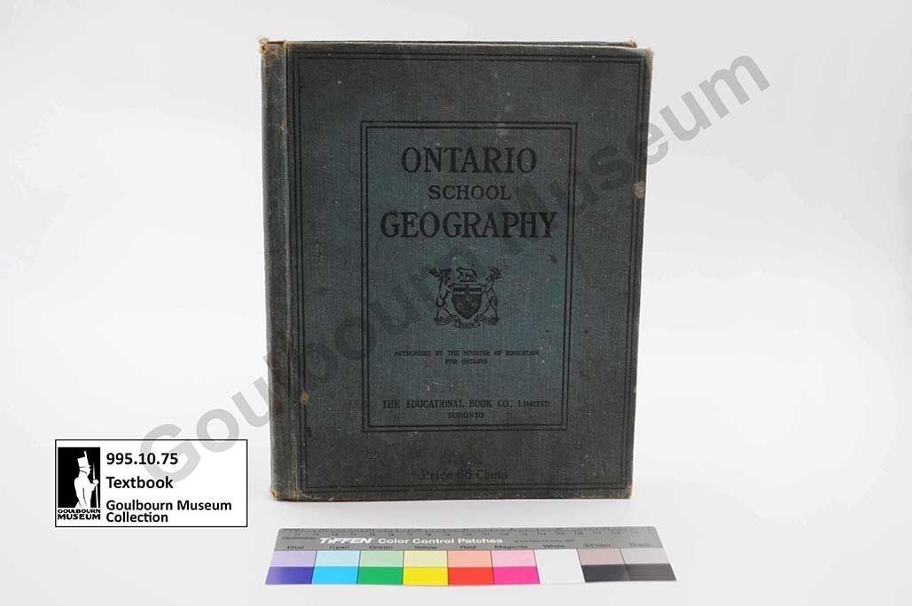 Blue cloth cover with a linear border surrounding Ontario's coat of arms and text that reads "Ontario School Geography. Authorized by Minister of Education for Ontario. The Educational Book Co. limited, Toronto".