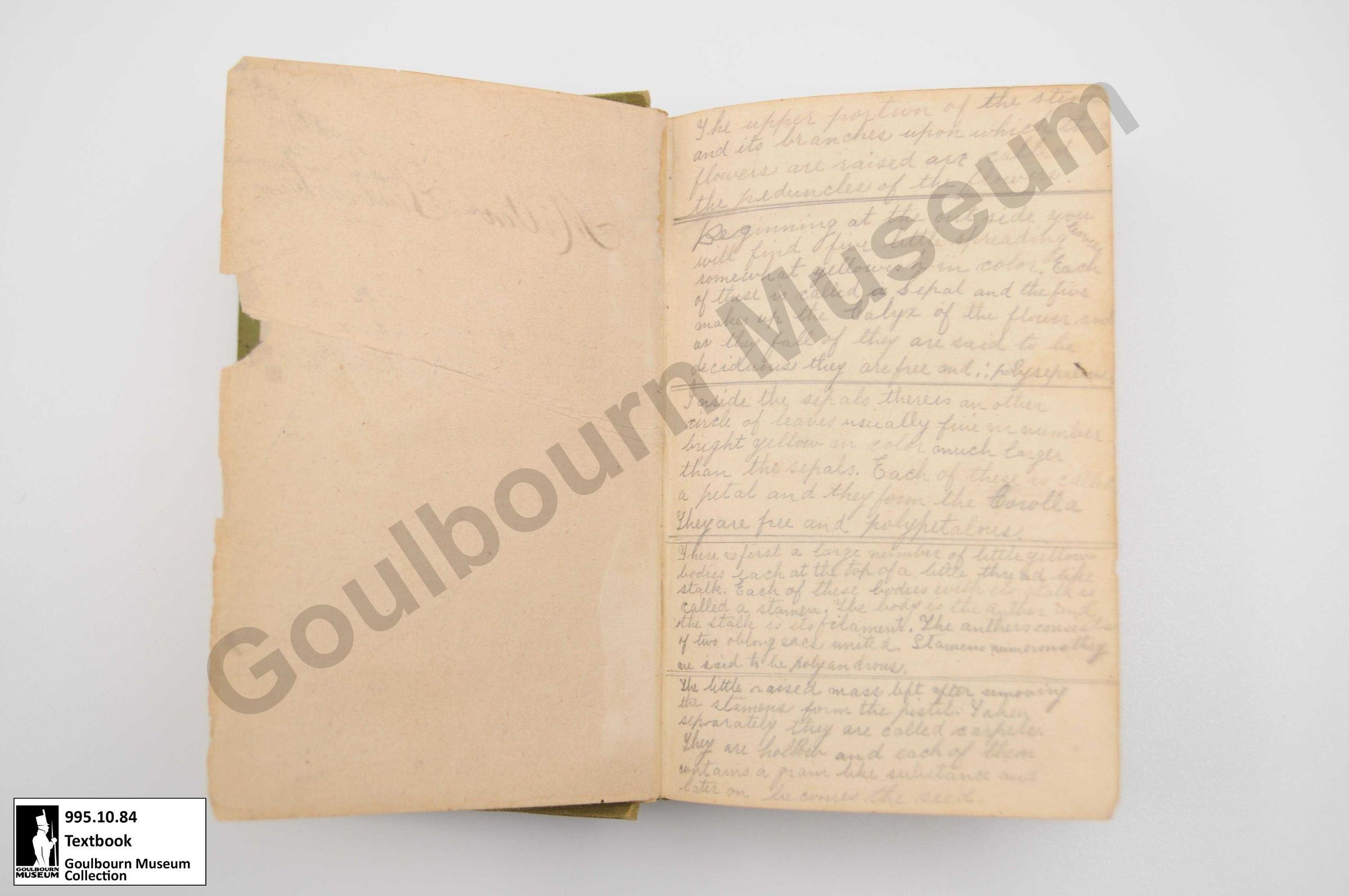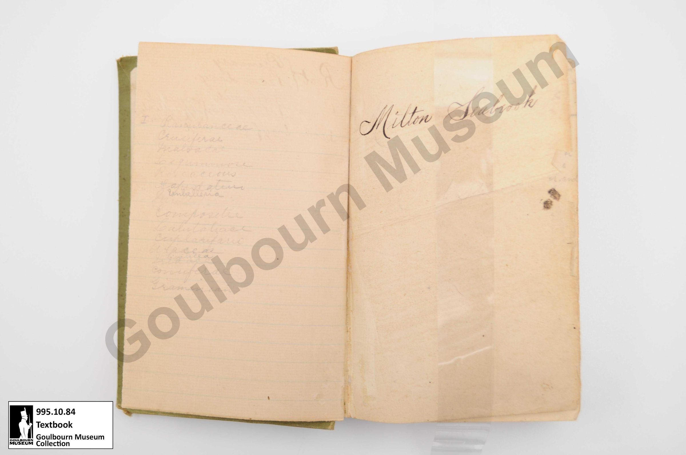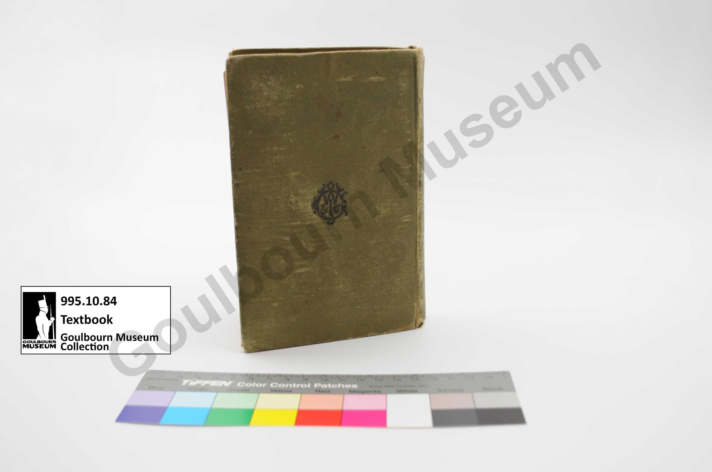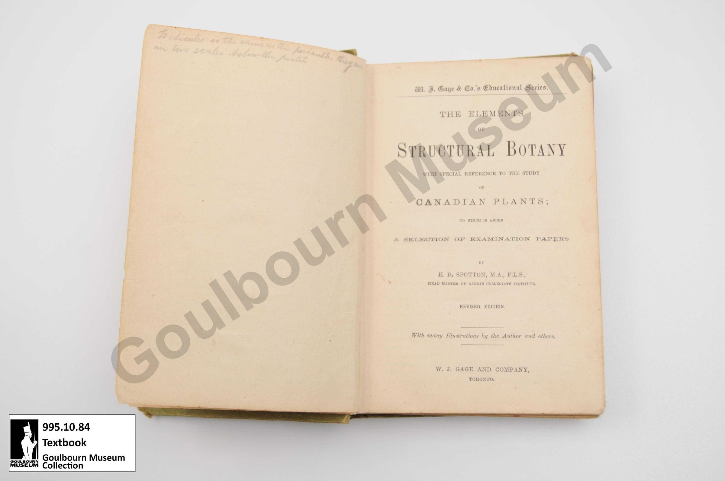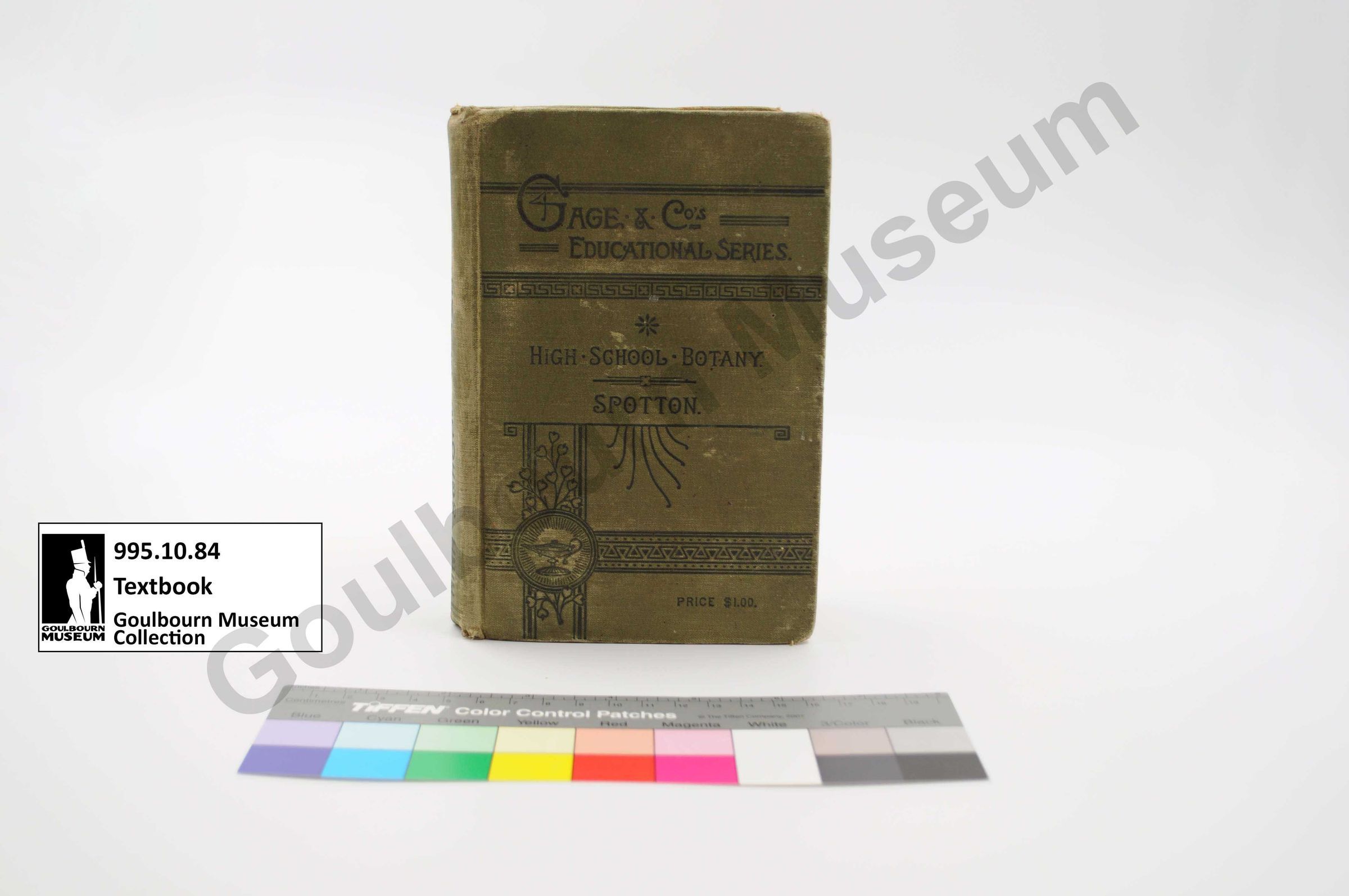 Hardcover book with green cloth cover. Front cover is embossed with a floral design, which appears on the bottom half of the cover. Text embossed on the front reads: "Cage & Co.'s Educational Series. High School Botany. Spotton. Price $1.00."