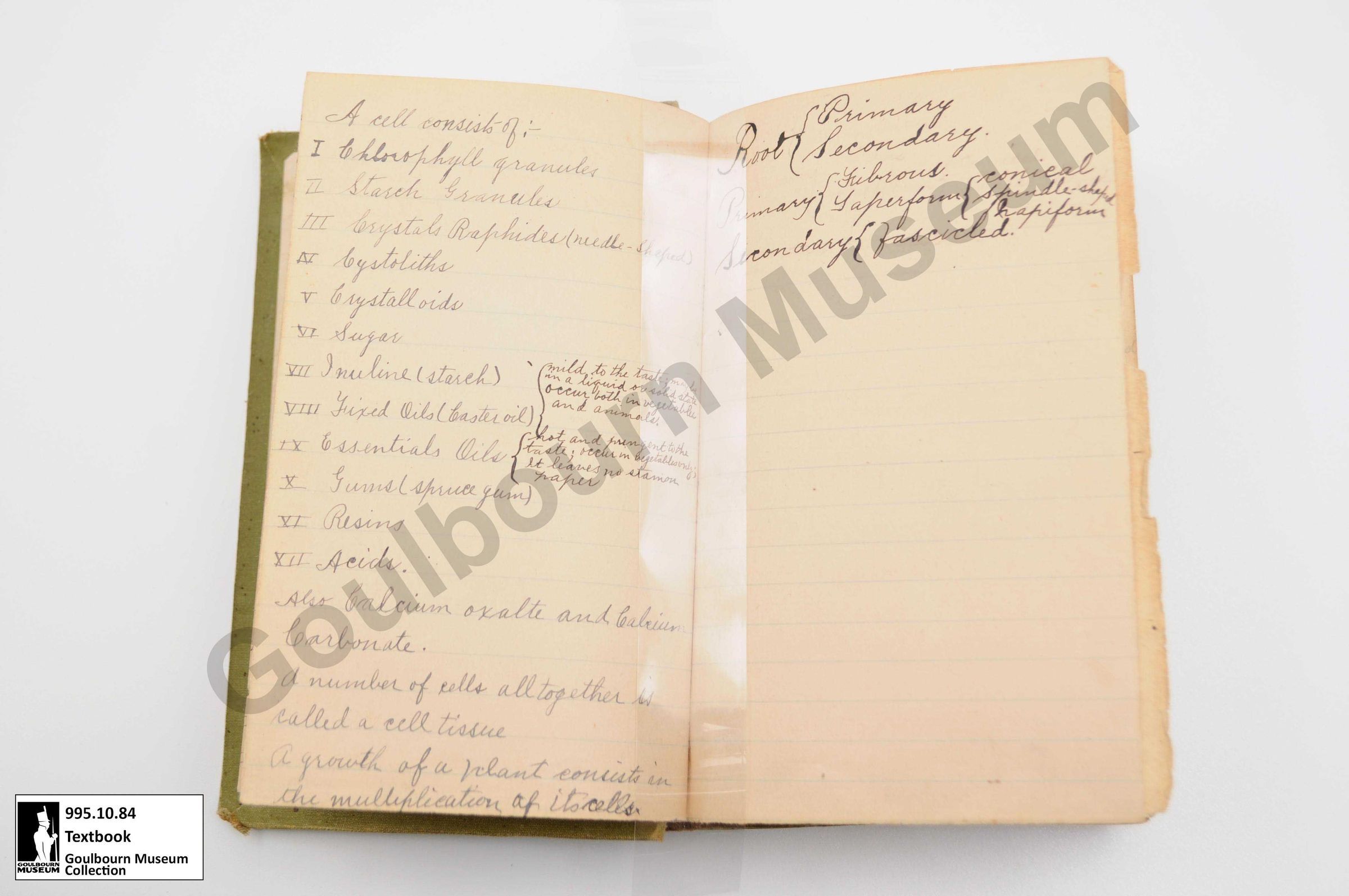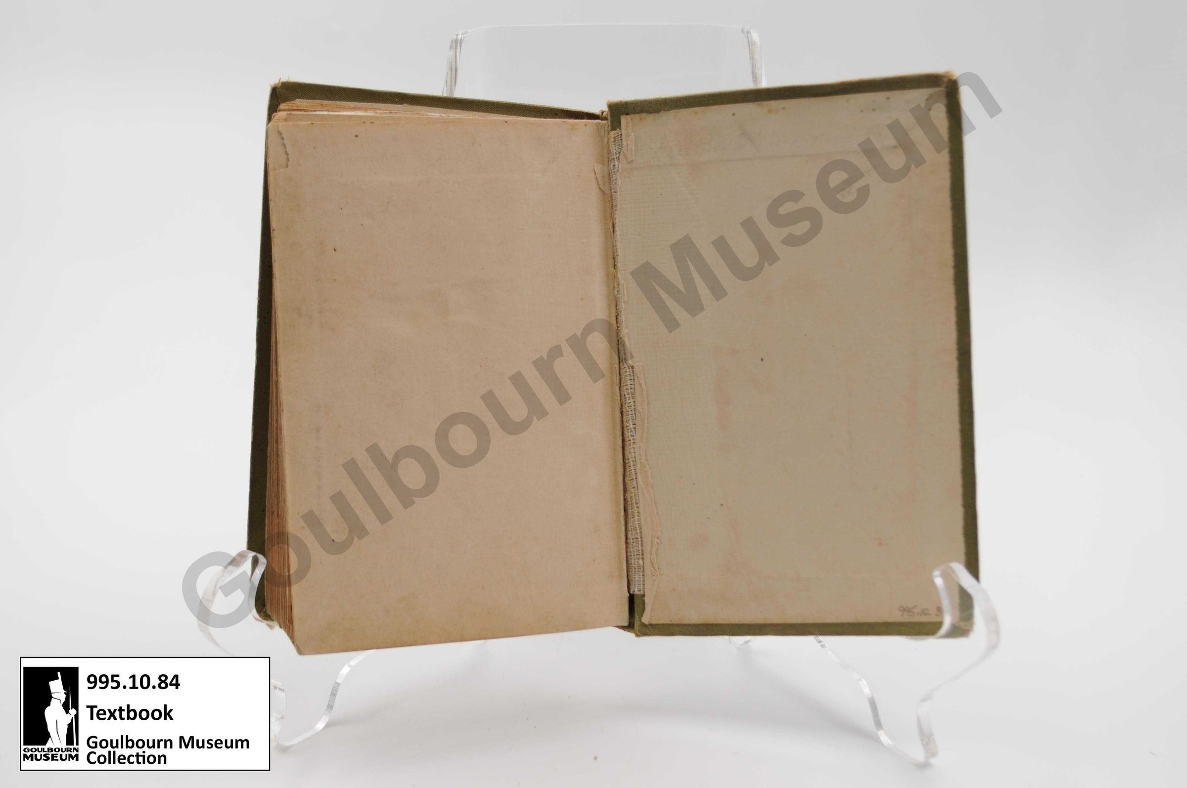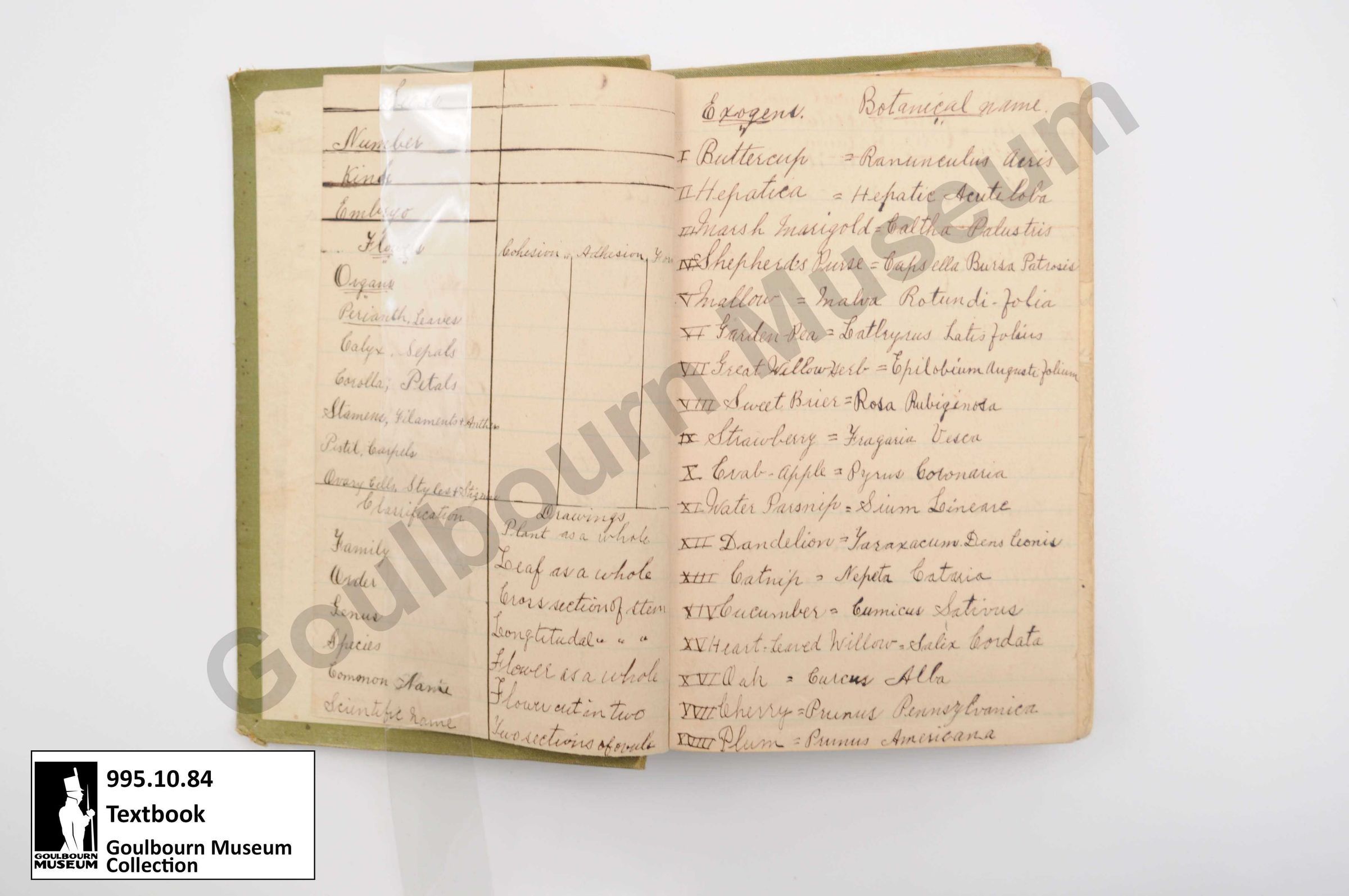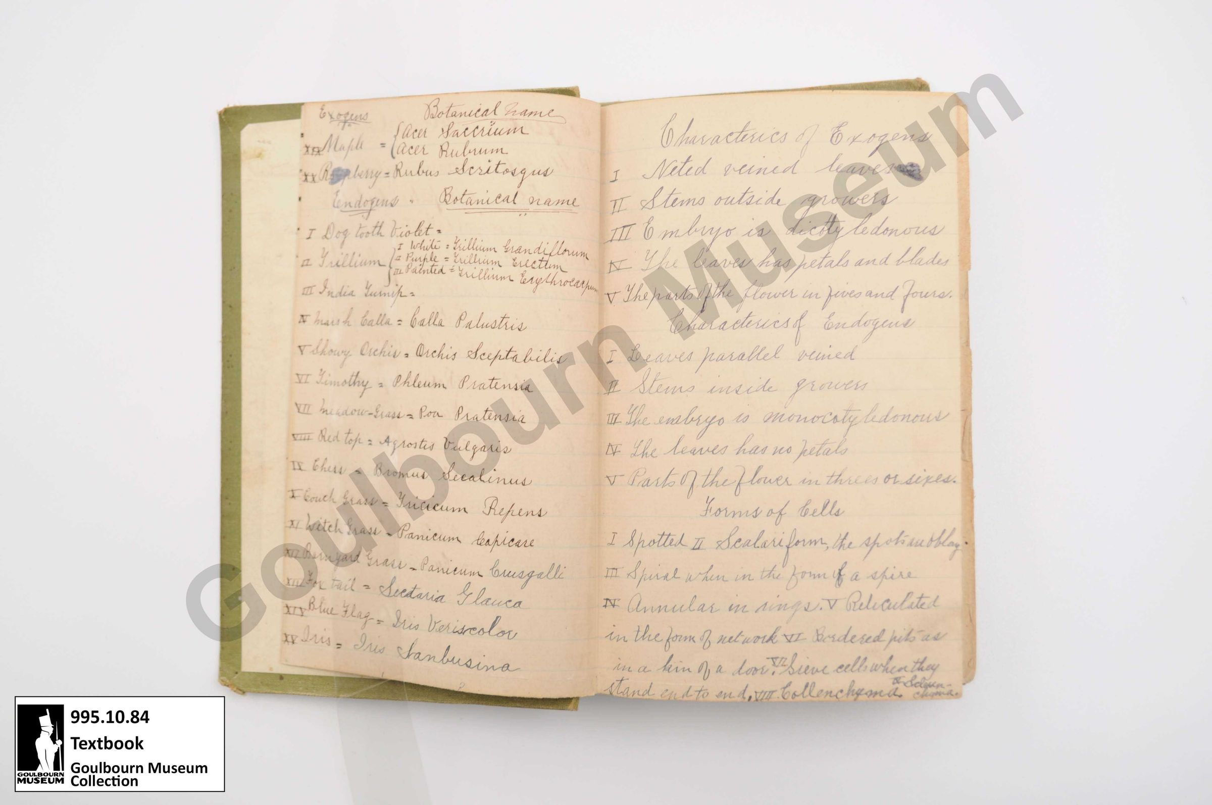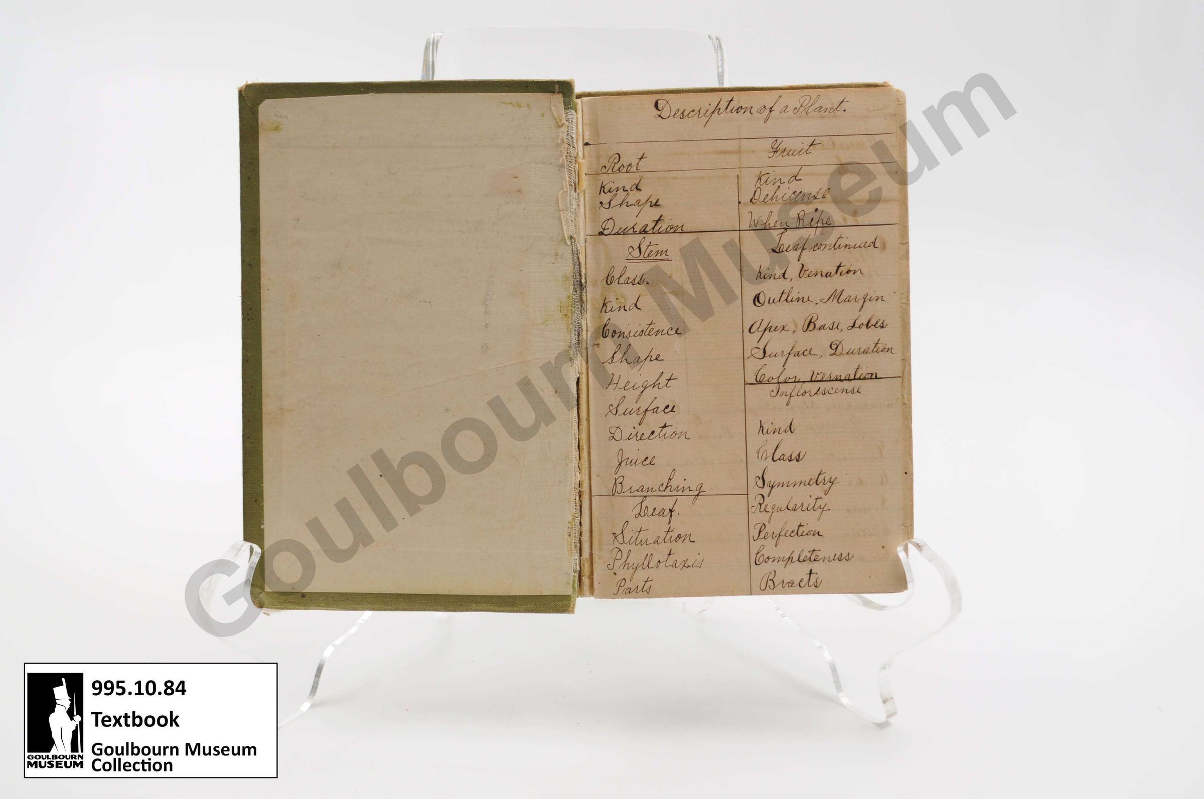 Hardcover book with green cloth cover. Front cover is embossed with a floral design, which appears on the bottom half of the cover. Text embossed on the front reads: "Cage & Co.'s Educational Series. High School Botany. Spotton. Price $1.00."