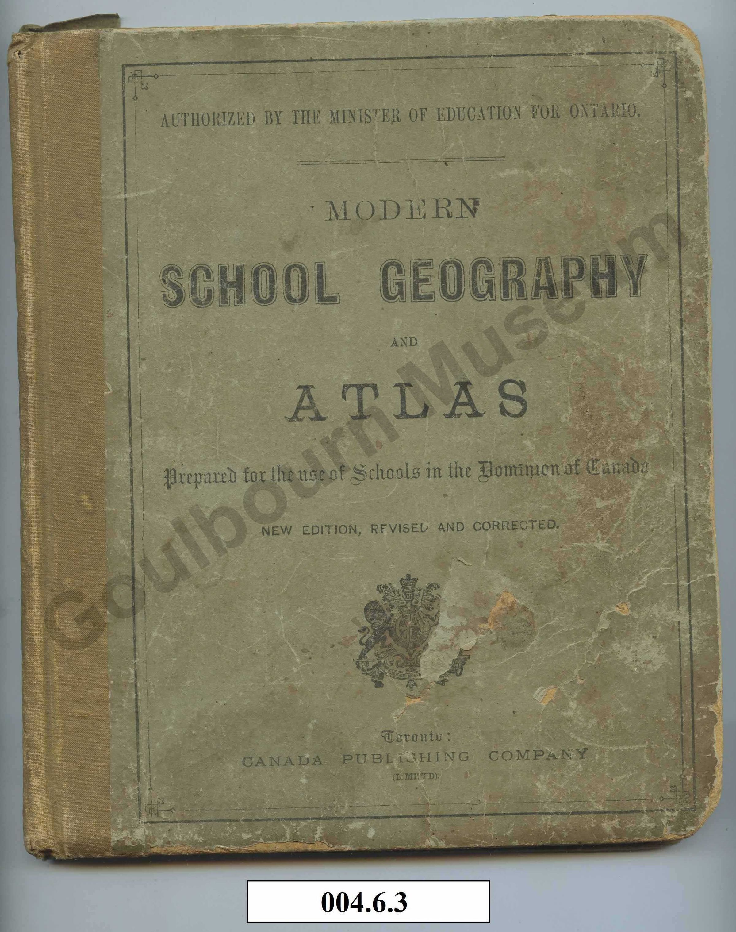 One textbook Modern School Geography and Atlas, with grey-green board covers, brown cloth-bound spine. 96 pages with color plate inserts. Published in Toronto by the Canada Publishing Company, 1883.Made/Created