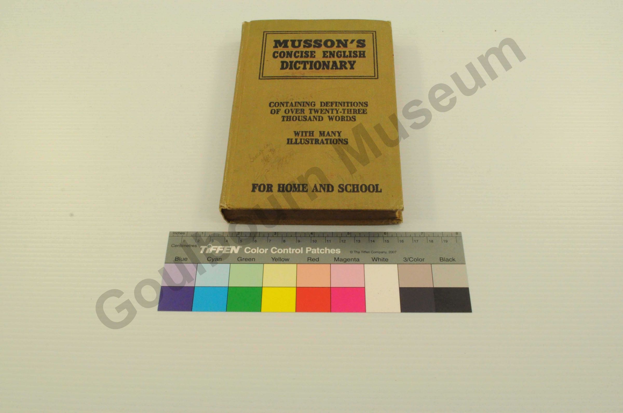 The book is a light brown or tan colour. The title of the book is in a rectangular black box which consists of two lines. The writing is in black ink. There is some type of colourant or crayon written in below each word of the title, as if underlining the words, and is a pink/red colour. The top of the front cover reads "Musson's Concise English Dictionary" followed by "Containing Definitions of Over Twenty-Three Thousand Words, With Many Illustrations" and at the very bottom of the front cover "For Home and School". The spine of the book reads "Musson's Concise English Dictionary" The reverse of the book has no words, or design.Context