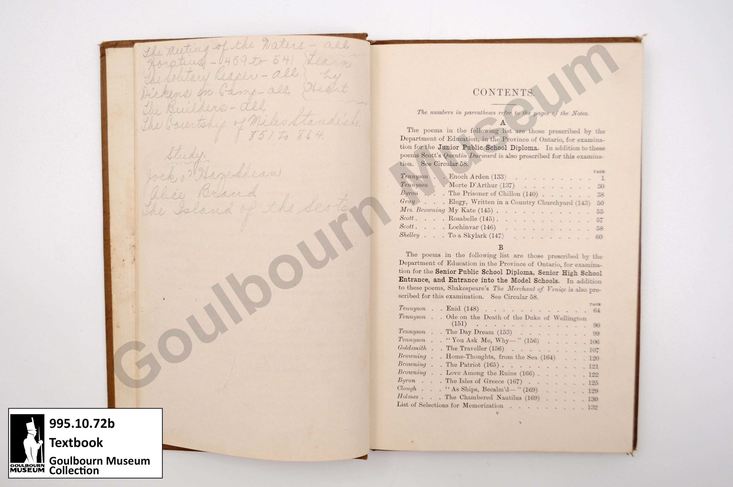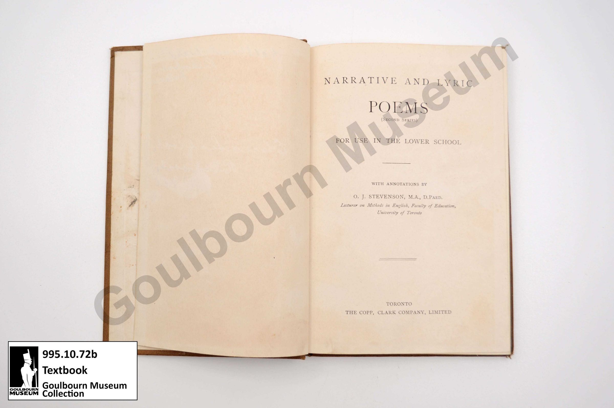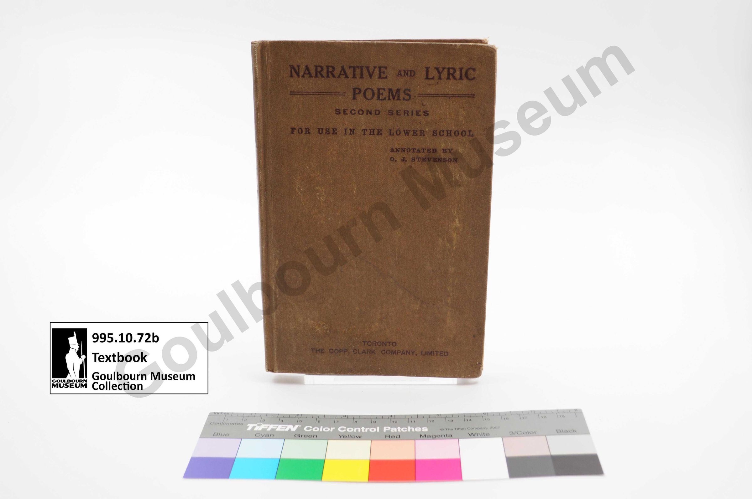 Hardcover textbook with beige cover. Text written on front cover reads: "Narrative and Lyric Poems. Second Series. For use in the Lower School. Annotated by O.J. Stevenson." Published in 1914.