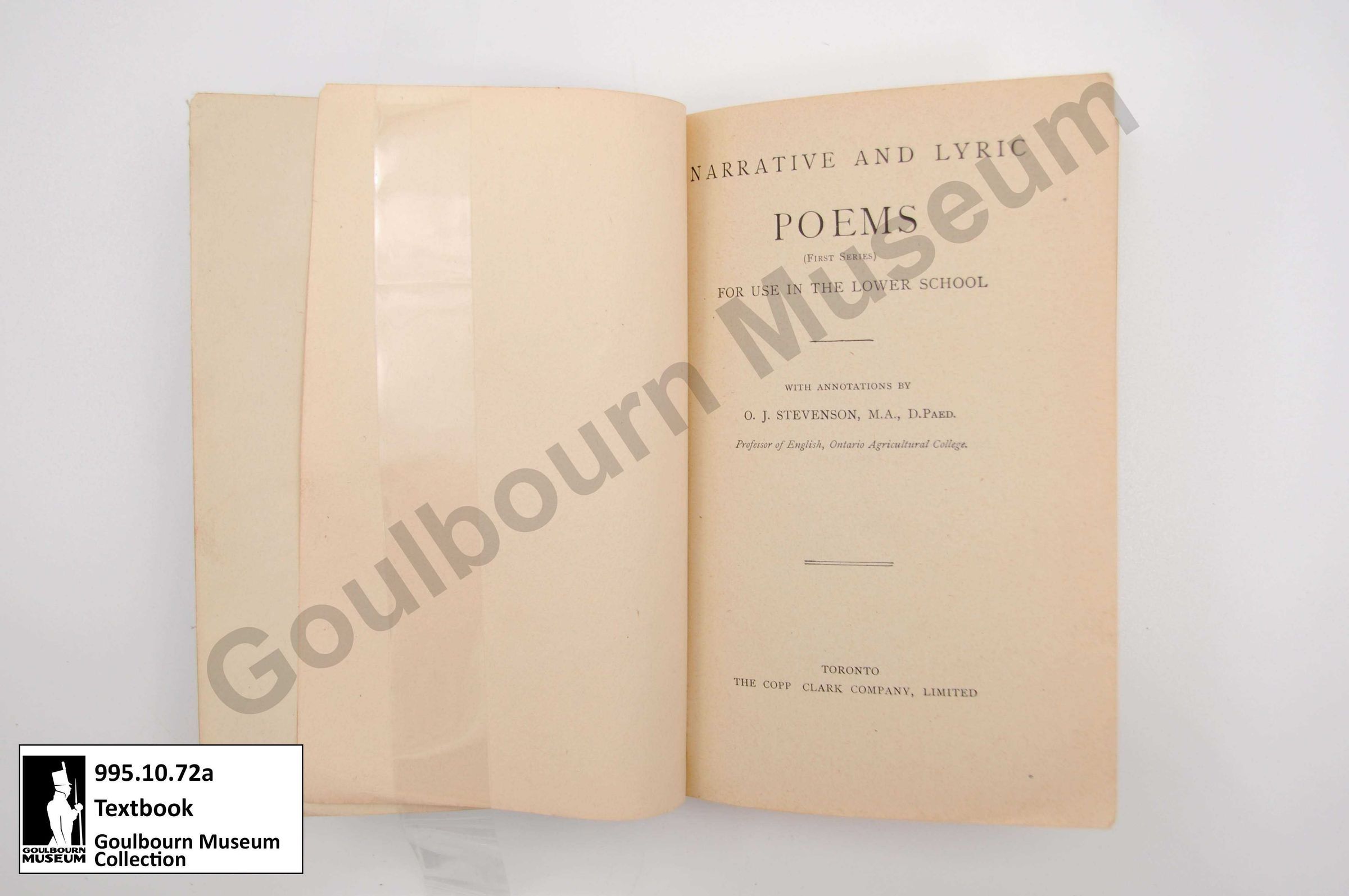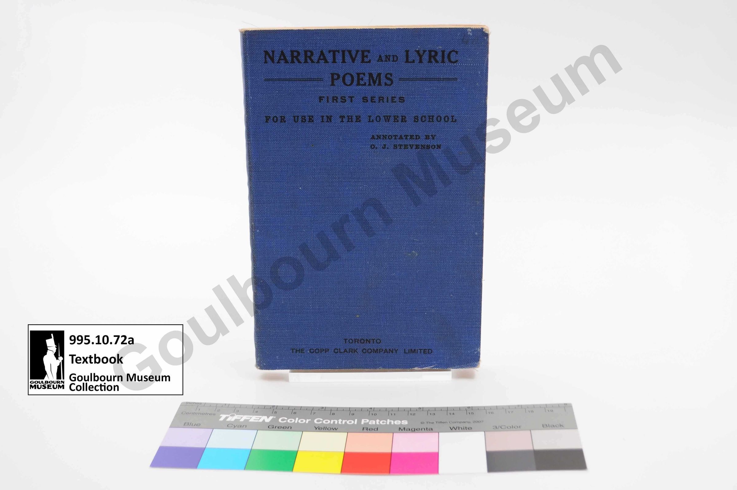 Hardcover book with blue cloth cover. Text written on the front cover reads: "Narrative and Lyric Poems. First Series. For use in the Lower School. Annotated by O.J. Stevenson." Published in 1912.