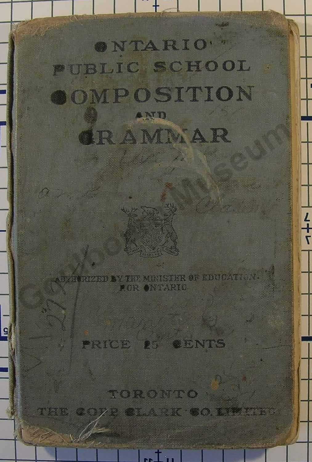 Blue book with black text depicting the Ontario coat of arms, reading "Ontario Public School Composition and Grammar authorized by the Minister of Education of Ontario".