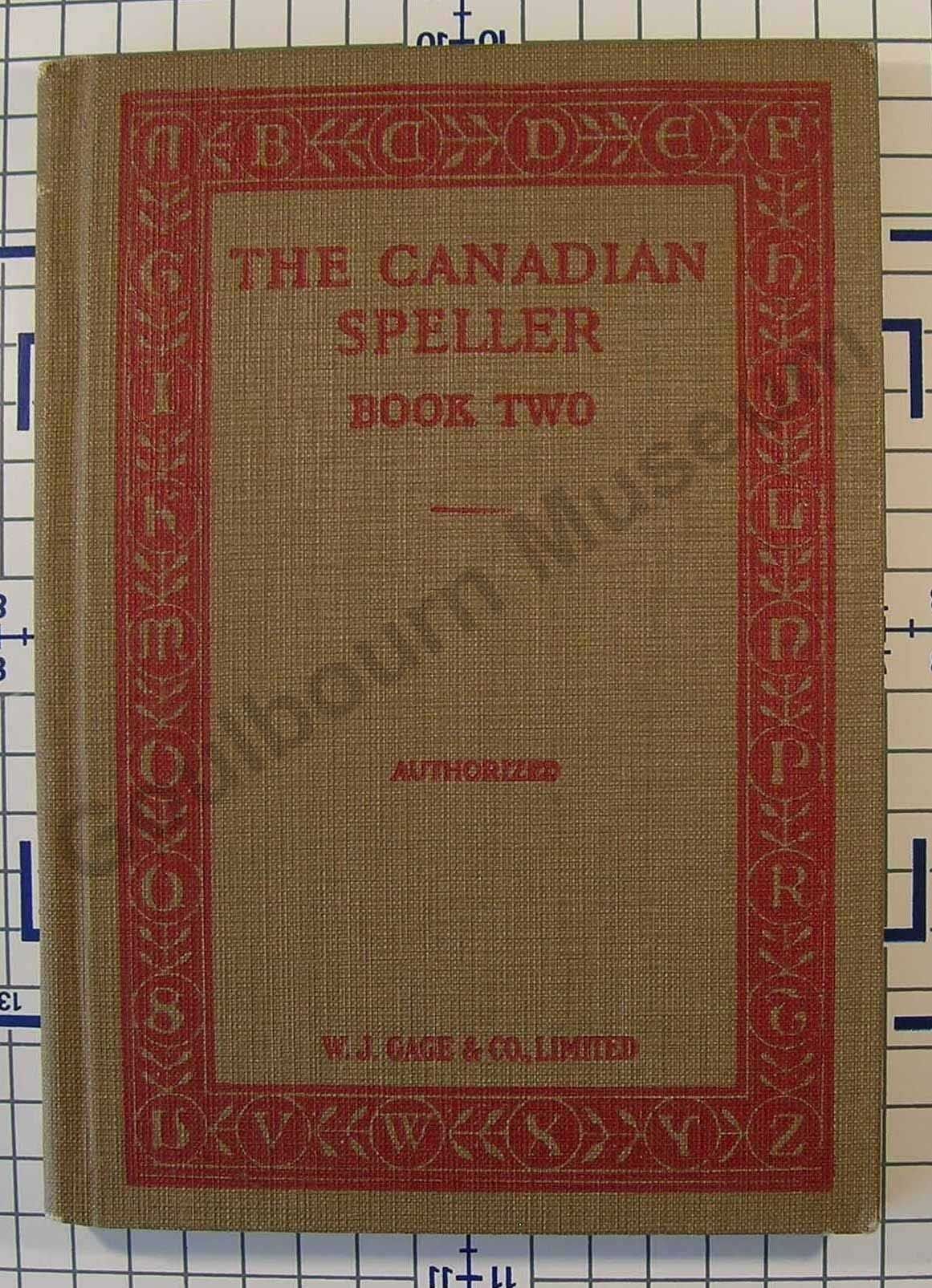 Light brown book with red floral pattern border and matching text reading "The Canadian Speller Book Two. Authorized, W. J Gage & Co Limited".