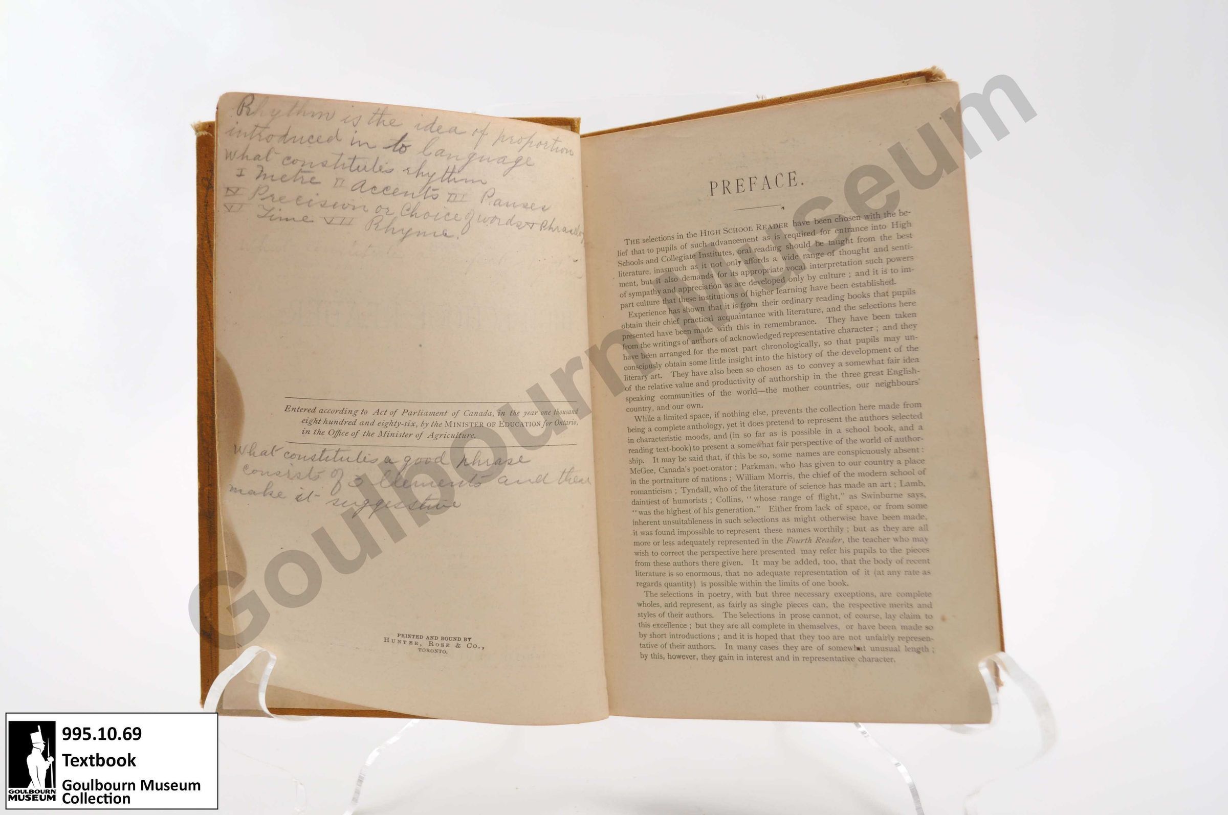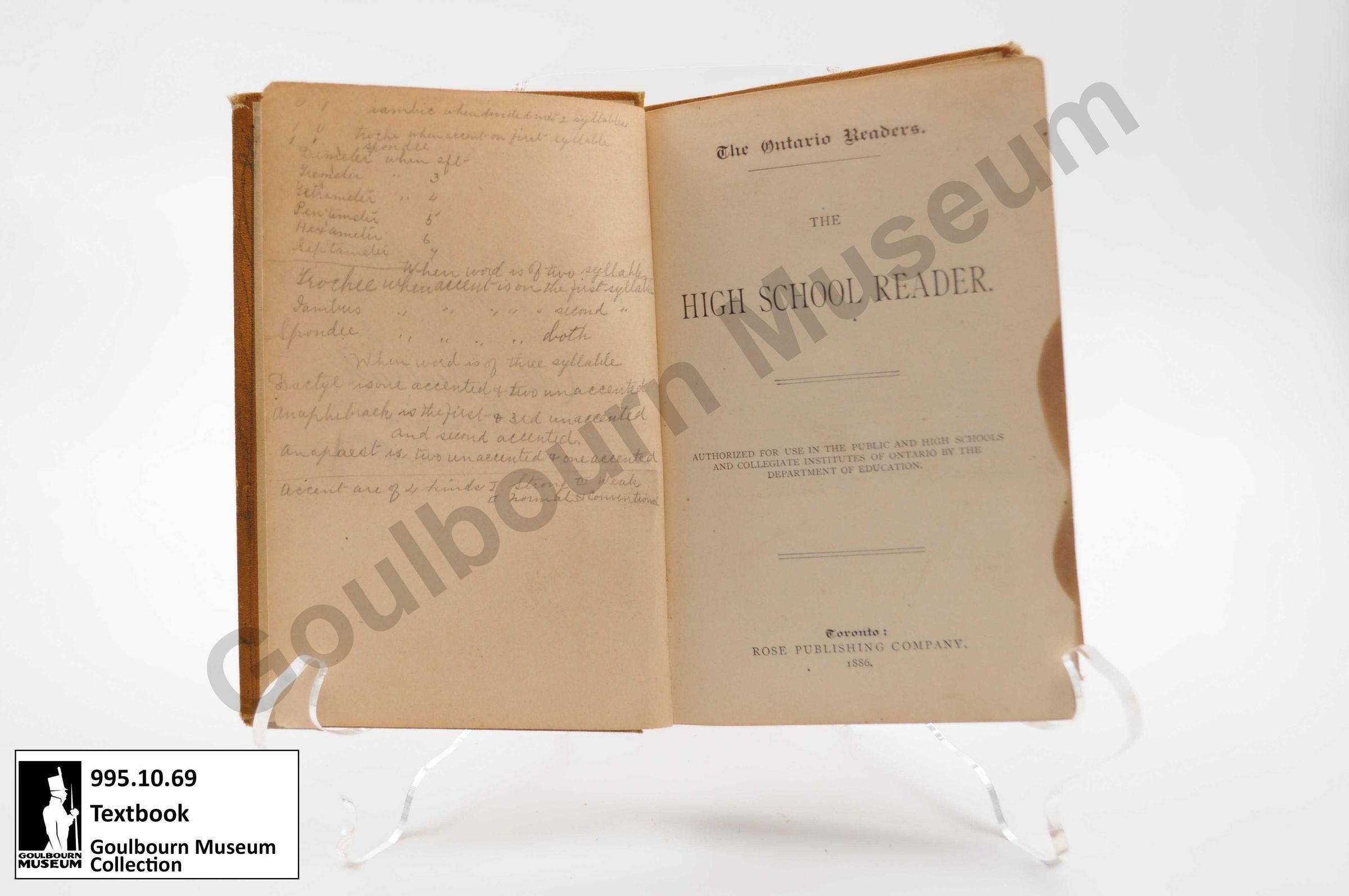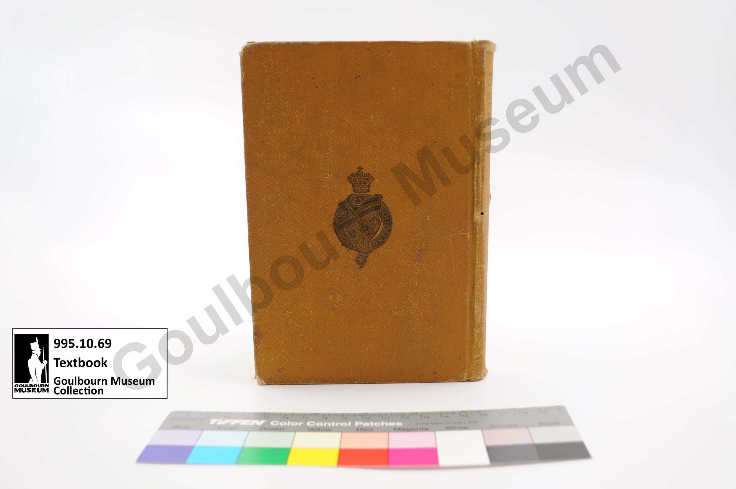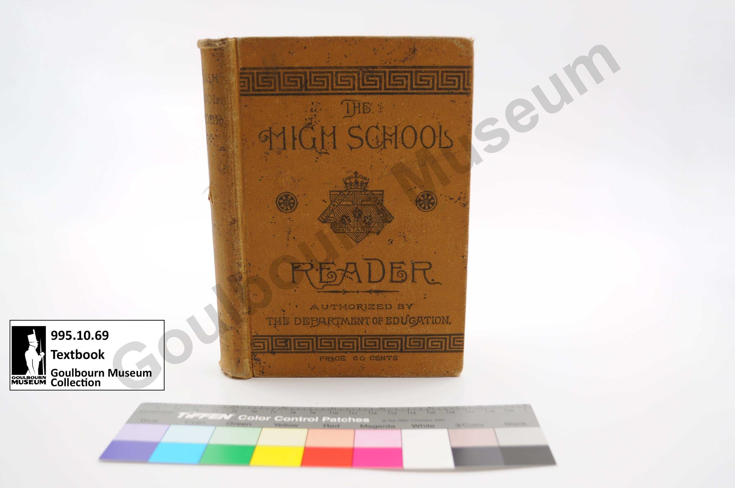 Yellow cloth covered book with geometric patterns at the proper top and bottom with the emblem of the Ontario Education Ministry in the center of the book, with black text reading "The High School Reader. Authorized by the Department of Education".
