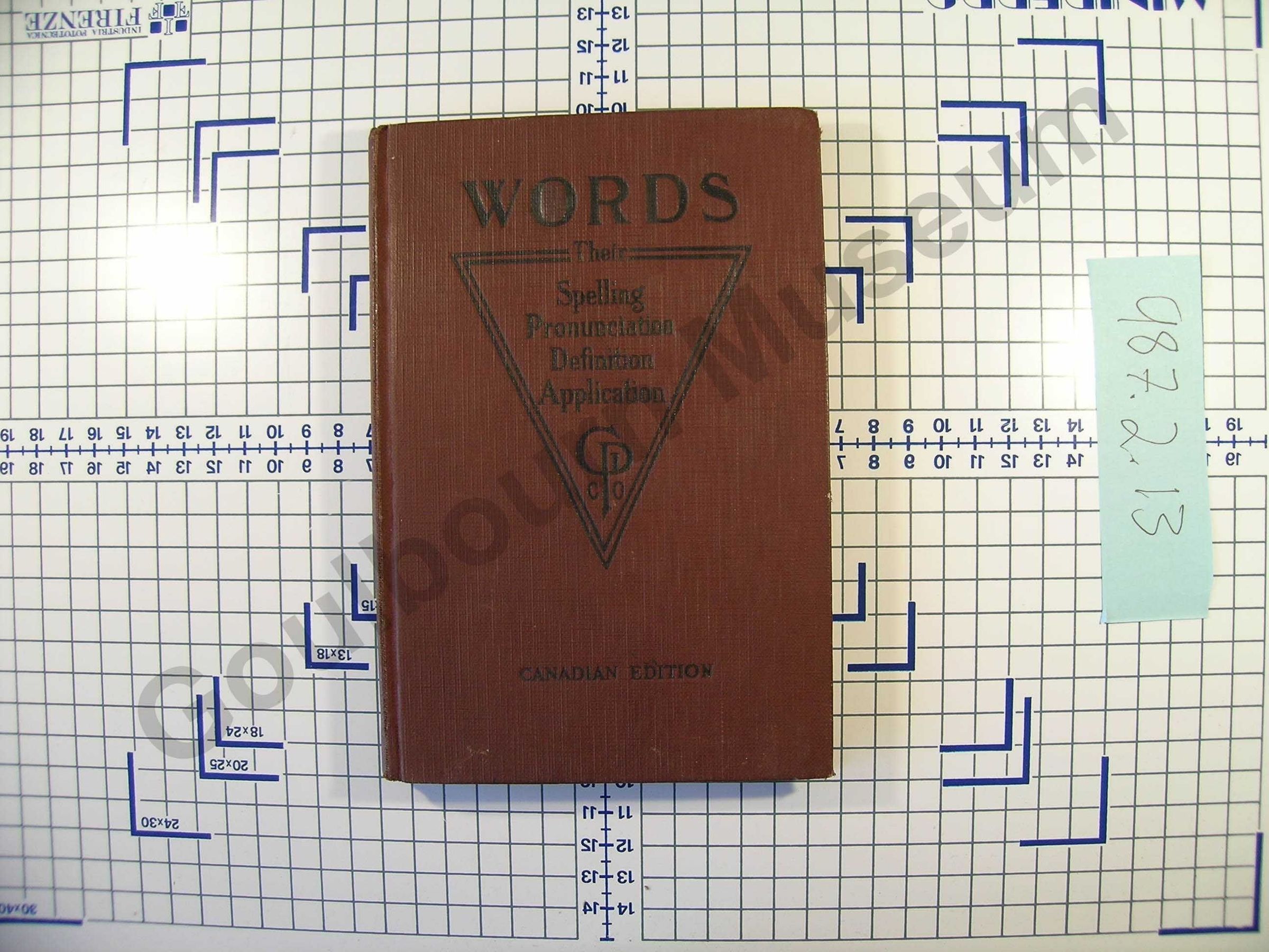 Hardcover book with reddish-brown cover. The title, "Words, Their Spelling, Pronunciation, Definition, Application" is written on the front cover in black font. Canadian Edition.Lexicon