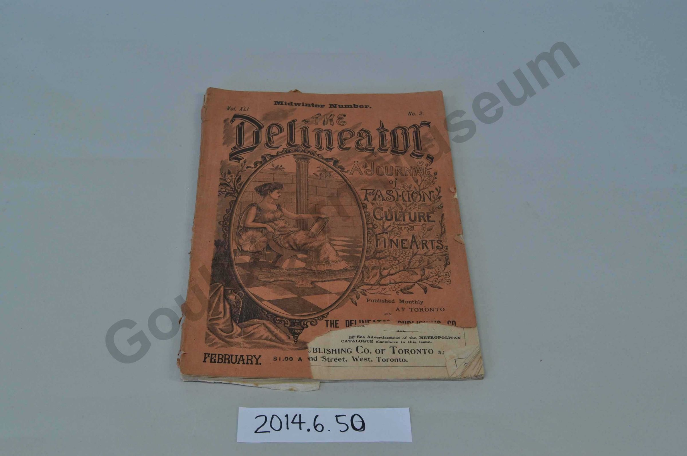 Red rectangular journal bound with staples depicting a black and white image of a woman sitting in a classical courtyard, encircled by a border in the backdrop of a bush with text that reads "The Delineator. Midwinter Number, Vol. XLI No. 2. A Journal of Fashion, Culture and Fine Arts. Published Monthly at Toronto."Lexicon