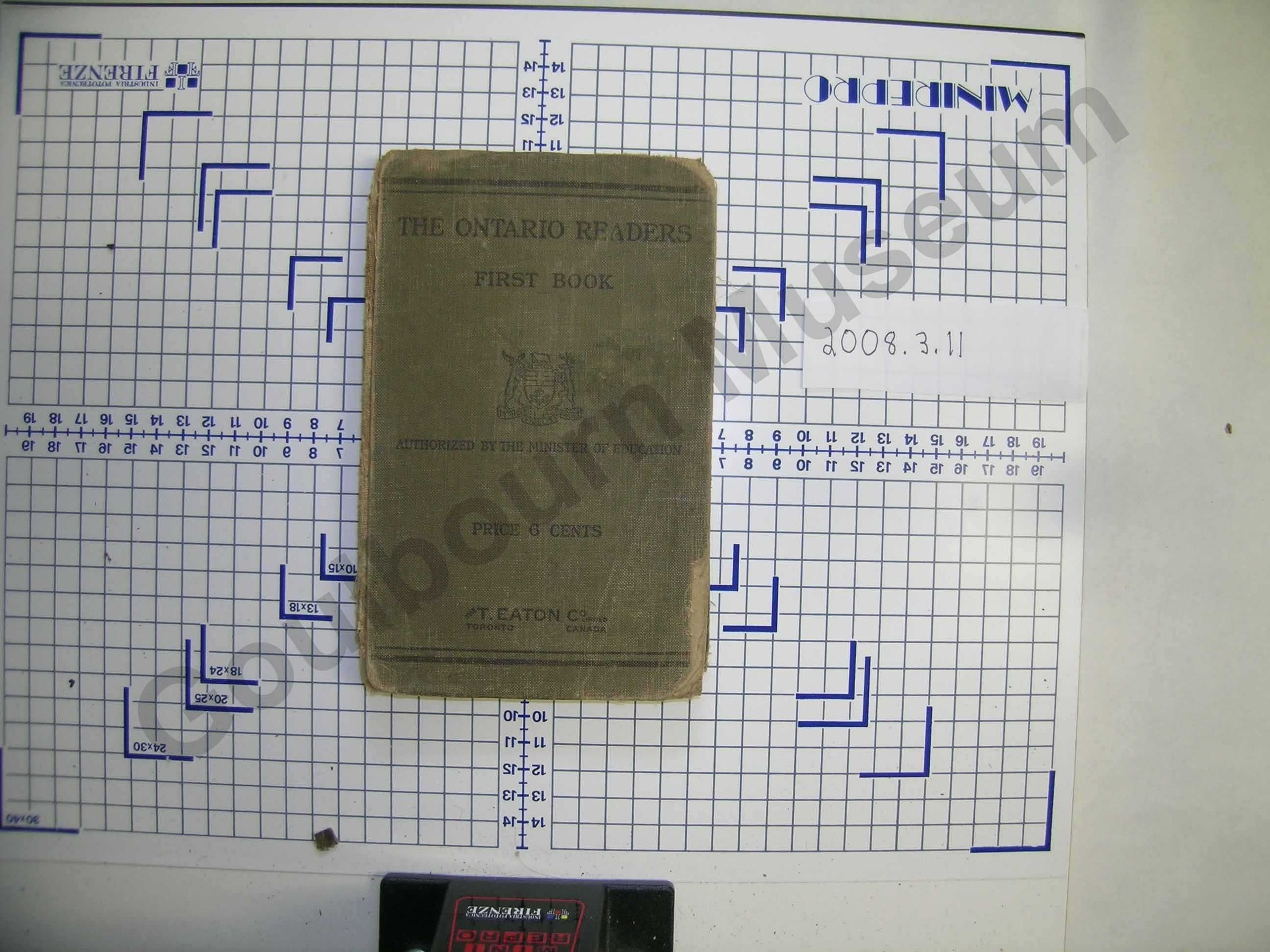 Olive green cloth cover with black text reading "The Ontario Readers First Book. Authorized by the minister of Education" with the Ontario coat of arms below
