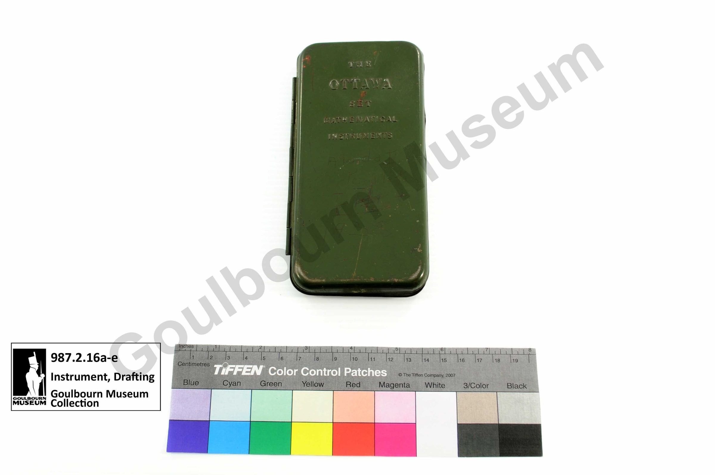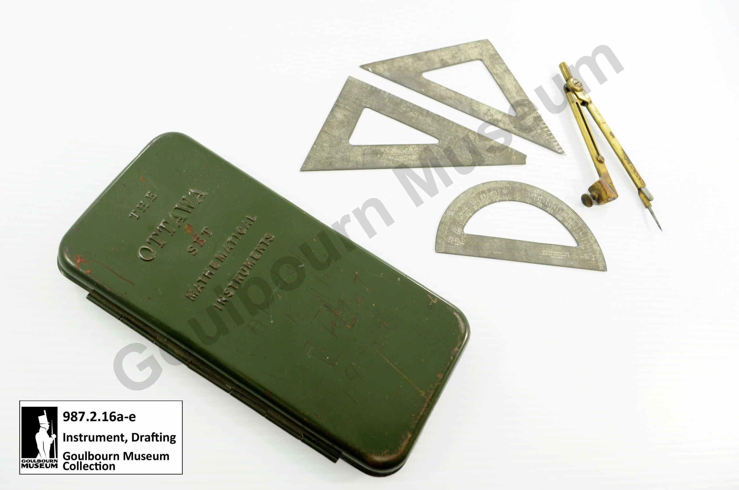 One green metal container holding a geometry set. The container has a raised inscription on the lid, "The Ottawa Set Mathematical Instruments." Inside the container there is a metal insert with space to hold a compass, divider, and wooden ruler in place. Behind the insert is space to hold a protractor and two set squares. This set contains five pieces: a container, compass, two set squares, and a protractor.Context