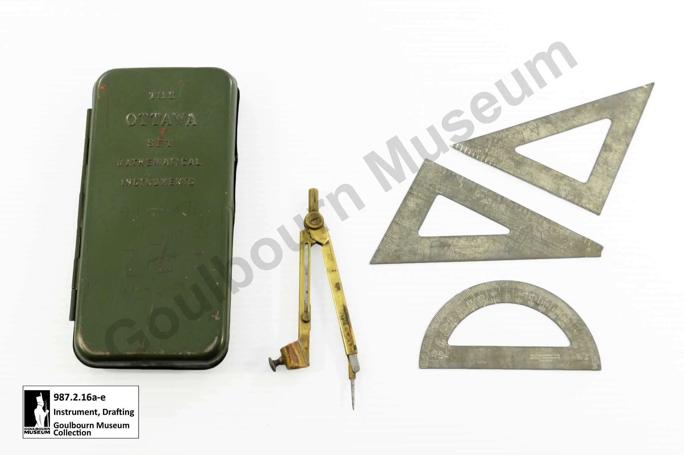 This is a set of mathematical instruments called “The Ottawa Set.” When new this set would have included a wooden ruler, compass, protractor, two set squares, and a divider. In the 21st century, geometry sets like this are commonly used for primary and secondary education, helping to teach lessons in measuring angles and distances, drafting, and solving problems in geometry.Lexicon