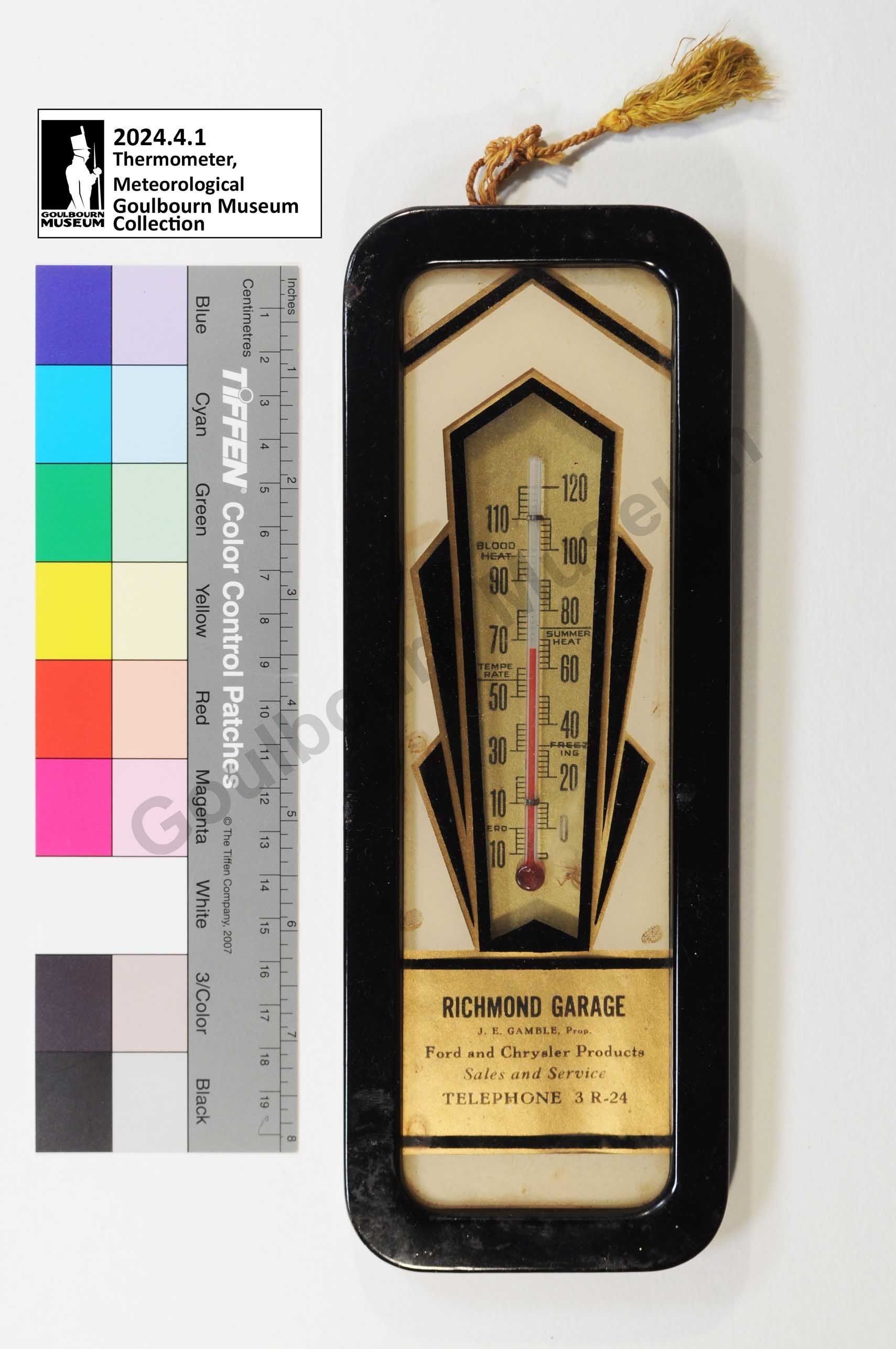 Promotional give away item produced for the Richmond Garage. The thermometer is housed in a black coloured frame which holds a pane of glass in front of a decorative matte and the thermometer. The inner design is in an art deco style with a cream coloured background, black geometric design and gold coloured accents. A glass thermometer is attached in the middle of the frame, with temperature measurements located on both the right and left of the thermometer. The bottom of the frame includes the information about the Richmond Garage, the advertisement reads, "Richmond Garage J.E. Gamble Prop. Ford and Chrysler Products Sales and Service Telephone 3 R-24." The thermometer is hung up using a yellow coloured fabric cord attached to the reverse of the frame.Context